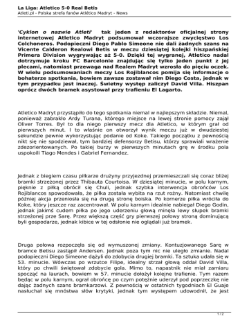 La Liga: Atletico 5-0 Real Betis Atleti.pl - Polska strefa fanów Atlético Madryt - News 'Cyklon o nazwie Atleti' tak jeden z redaktorów oficjalnej strony internetowej Atletico Madryt podsumował wczorajsze zwycięstwo Los Colchoneros. Podopieczni Diego Pablo Simeone nie dali żadnych szans na Vicente Calderon Realowi Betis w meczu dziesiątej kolejki hiszpańskiej Primera Division wygrywając aż 5-0. Dzięki tej wygranej, Atletico nadal dotrzymuje kroku FC Barcelonie znajdując się tylko jeden punkt z jej plecami, natomiast przewaga nad Realem Madryt wzrosła do pięciu oczek. W wielu podsumowaniach meczy Los Rojiblancos pomija się informacje o bohaterze spotkania, bowiem zawsze zostawał nim Diego Costa, jednak w tym przypadku jest inaczej. Świetny występ zaliczył David Villa. Hiszpan oprócz dwóch bramek asystował przy trafieniu El Lagarto. Atletico Madryt przystąpiło do tego spotkania niemal w najlepszym składzie. Niemal, ponieważ zabrakło Ardy Turana, którego miejsce na lewej stronie pomocy zajął Oliver Torres. Był to dla niego pierwszy mecz dla Atletico, w którym grał od pierwszych minut. I to właśnie on otworzył wynik meczu już w dwudziestej sekundzie pewnie wykorzystując podanie od Koke. Takiego początku z pewnością nikt się nie spodziewał, tym bardziej defensorzy Betisu, którzy sprawiali wrażenie zdezorientowanych. Po takiej burzy w pierwszych minutach grę w środku pola uspokoili Tiago Mendes i Gabriel Fernandez. Jednak z biegiem czasu piłkarze drużyny przyjezdnej przemieszczali się coraz bliżej bramki strzeżonej przez Thibauta Courtoisa. W dziesiątej minucie, w polu karnym, pięknie z piłką obrócił się Chuli, jednak szybka interwencja obrońców Los Rojiblancos spowodowała, że piłka została wybita na rzut rożny. Natomiast chwilę później akcja przeniosła się na drugą stronę boiska. Po kornerze piłka wróciła do Koke, który jeszcze raz zacentrował. W polu karnym idealnie nabiegał Diego Godin, jednak jakimś cudem piłka po jego uderzeniu głową minęła lewy słupek bramki strzeżonej prze Sarę. Przez większą część gry pierwszej połowy stroną dominującą byli gospodarze, jednak kibice w tej odsłonie nie oglądali już bramek. Druga połowa rozpoczęła się od wymuszonej zmiany. Kontuzjowanego Sarę w bramce Betisu zastąpił Andersen. Jednak poza tym nic nie uległo zmianie. Nadal podopieczni Diego Simeone dążyli do zdobycia drugiej bramki. Ta sztuka udała się w 53. minucie. Wówczas po wrzutce Filipe, idealny strzał głową oddał David Villa, który po chwili świętował zdobycie gola. Mimo to, napastnik nie miał zamiaru spocząć na laurach, bowiem w 57. minucie dołożył kolejne trafienie. Tym razem będąc w polu karnym, ograł obrońcę po czym potężnie uderzył pod poprzeczkę nie dając żadnych szans bramkarzowi. Z pewnością w ostatnich tygodniach El Guaje nasłuchał się mnóstwa słów krytyki, jednak tym występem udowodnił, że jest 1/2 La Liga: Atletico 5-0 Real Betis Atleti.pl - Polska strefa fanów Atlético Madryt - News wartościowym zawodnikiem. W 65. minucie były piłkarz FC Barcelony asystował przy golu Diego Costy., który spokojnie wykorzystał sytuację sam na sam. To była kolejna fiesta na Calderon. Ostateczny cios w tym spotkaniu zadał kapitan Atletico, Gabi. Pomocnik podwyższył rezultat na 5-0 pięknym plasowanym strzałem zza pola karnego. Tym samym Los Rojiblancos w świetnym stylu wygrali swój pierwszy mecz na własnym stadionie od trzech tygodni. Atletico: Courtois, Juanfran, Miranda, Godín, Filipe Luis, Gabi, Tiago, Koke (Cristian Rodríguez, 68’), Óliver (Adrián, 60’), Villa i Diego Costa (Raúl García, 78'). Real Betis Balompie: Sara (Andersen, 46’), Juanfran, Perquis, Jordi, Didac Vilà, Nosa, Lorenzo Reyes (Jorge Molina, 46’), Cedric, Matilla, Vadillo (Nono, 63’), Chuli. Árbitro: Juan Martínez Muruena, colegio valenciano. Amonestó a Nosa (18’) i Cedric (53’). ATLETICO 5-0 BETIS 1' Torres 1-0 53' Villa 2-0 57' Villa 3-0 65' Costa 4-0 90' Gabi 5-0 Autor: shy 2/2 Powered by TCPDF (www.tcpdf.org)