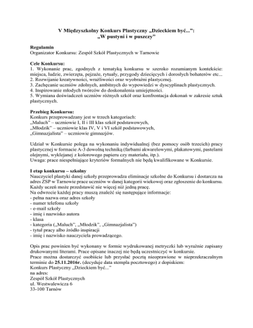V Międzyszkolny Konkurs Plastyczny „Dzieckiem być...”: „W pustyni i w puszczy” Regulamin Organizator Konkursu: Zespół Szkół Plastycznych w Tarnowie Cele Konkursu: 1. Wykonanie prac, zgodnych z tematyką konkursu w szeroko rozumianym kontekście: miejsca, ludzie, zwierzęta, pejzaże, rytuały, przygody dziecięcych i dorosłych bohaterów etc... 2. Rozwijanie kreatywności, wrażliwości oraz wyobraźni plastycznej. 3. Zachęcanie uczniów zdolnych, ambitnych do wypowiedzi w dyscyplinach plastycznych. 4. Inspirowanie młodych twórców do doskonalenia umiejętności. 5. Wymiana doświadczeń uczniów różnych szkół oraz konfrontacja dokonań w zakresie sztuk plastycznych. Przebieg Konkursu: Konkurs przeprowadzany jest w trzech kategoriach: „Maluch” – uczniowie I, II i III klas szkół podstawowych, „Młodzik” – uczniowie klas IV, V i VI szkół podstawowych, „Gimnazjalista” – uczniowie gimnazjów. Udział w Konkursie polega na wykonaniu indywidualnej (bez pomocy osób trzecich) pracy plastycznej w formacie A-3 dowolną techniką (farbami akwarelowymi, plakatowymi, pastelami olejnymi, wyklejanej z kolorowego papieru czy materiału, itp.). Uwaga: prace niespełniające kryteriów formalnych nie będą kwalifikowane w Konkursie. I etap konkursu – szkolny Nauczyciel plastyki danej szkoły przeprowadza eliminacje szkolne do Konkursu i dostarcza na adres ZSP w Tarnowie prace uczniów w danej kategorii wiekowej oraz zgłoszenie do konkursu. Każdy uczeń może przedstawić nie więcej niż jedną pracę. Na odwrocie każdej pracy muszą znaleźć się następujące informacje: - pełna nazwa oraz adres szkoły - numer telefonu szkoły - e-mail szkoły - imię i nazwisko autora - klasa - kategoria („Maluch”, „Młodzik”, „Gimnazjalista”) - tytuł pracy albo źródło inspiracji - imię i nazwisko nauczyciela prowadzącego. Opis prac powinien być wykonany w formie wydrukowanej metryczki lub wyraźnie zapisany drukowanymi literami. Prace opisane inaczej nie będą uczestniczyć w konkursie. Prace można dostarczyć osobiście lub przysłać pocztą nieoprawione w nieprzekraczalnym terminie do 25.11.2016r. (decyduje data stempla pocztowego) z dopiskiem: Konkurs Plastyczny „Dzieckiem być...” na adres: Zespół Szkół Plastycznych ul. Westwalewicza 6 33-100 Tarnów Oceny prac dokona Komisja Konkursowa powołana przez Dyrektora ZSP. Decyzje jury będą ostateczne. Komisja Konkursowa zbierze się w terminie do 09.12.2016r. i wybierze najlepsze prace zakwalifikowane do drugiego etapu konkursu. Każda szkoła, która weźmie udział w konkursie, otrzyma listę osób zakwalifikowanych do drugiego etapu. Wyniki I etapu konkursu zostaną również zamieszczone na stronie internetowej Zespołu Szkół Plastycznych w Tarnowie. II etap konkursu Drugi etap konkursu odbędzie się dnia 21.02.2017r. w Zespole Szkół Plastycznych w Tarnowie. Autorzy najlepszych prac z każdej kategorii będą uczestniczyć w bezpłatnych, czterogodzinnych warsztatach, podczas których pod kierunkiem artystów – nauczycieli Zespołu Szkół Plastycznych wykonają pracę zgodną z tematyką konkursu. Materiały na warsztaty zostaną zapewnione przez organizatora. W czasie trwania warsztatów dla uczniów, nauczyciele – opiekunowie zostaną zaproszeni do udziału w seminarium oraz warsztatach, prowadzonych przez nauczycieli Zespołu Szkół Plastycznych w Tarnowie. Po zakończeniu warsztatów, Komisja Konkursowa wyłoni zwycięzców w poszczególnych kategoriach. UWAGA!!! Ogłoszenie wyników drugiego etapu konkursu nastąpi dnia 02.03.2017r. podczas uroczystego wernisażu w Zespole Szkół Plastycznych w Tarnowie. Rozdanie dyplomów i nagród poprzedzone będzie zwiedzaniem szkoły, między innymi: pracowni rysunku i malarstwa, rzeźby, reklamy wizualnej, meblarstwa, podstaw projektowania, fotografii i filmu, tkaniny artystycznej i renowacji mebli oraz renowacji elementów architektury. W każdej kategorii za I, II i III miejsce zostaną przyznane atrakcyjne nagrody rzeczowe ufundowane przez organizatorów i sponsorów. Szkoły uczestniczące w konkursie, uczestnicy II-go etapu oraz ich nauczyciele – opiekunowie otrzymają pamiątkowe dyplomy. Wszystkie nadesłane na Konkurs prace będzie można odebrać w terminie do 23.06.2017r. Nadesłanie prac oznacza akceptację warunków konkursu i regulaminu, którego ostateczna interpretacja należy do organizatorów konkursu. Udział w konkursie jest jednoznaczny z udzieleniem prawa do nieodpłatnego wykorzystywania prac dla promocji konkursu w następujących polach eksploatacji: druku w dowolnej liczbie publikacji i w dowolnym nakładzie, używania ich w Internecie oraz w innych formach utrwaleń nadających się do rozpowszechniania. Udział w konkursie jest równoznaczny z wyrażeniem przez osoby uczestniczące zgody na przetwarzanie przez organizatora ich danych osobowych na potrzeby konkursu (ustawa o ochronie danych osobowych z dnia 29.08.1997r., Dz. U. z 2016r., poz. 922). Rodzice uczniów biorących udział w Konkursie Plastycznym „Dzieckiem być...” proszeni są o uzupełnienie załącznika numer 2 (Oświadczenie Rodzica / Opiekuna prawnego autora pracy plastycznej). Terminarz Konkursu Termin nadsyłania prac konkursowych: 25.11.2016 Termin rozstrzygnięcia I etapu konkursu: do 09.12.2016 Termin II etapu konkursu: 21.02.2017 Przewidywany termin rozstrzygnięcia II etapu konkursu, spotkania laureatów, wręczenia nagród i dyplomów oraz otwarcie wystawy pokonkursowej: 02.03.2017 Regulamin Konkursu dostępny jest na stronie internetowej www.zsp.tarnow.pl i jest jedynym dokumentem określającym jego zasady. Organizatorzy Załącznik nr 1 UCZESTNICY ZGŁOSZENI DO I ETAPU V MIĘDZYSZKOLNEGO KONKURSU PLASTYCZNEGO „DZIECKIEM BYĆ...”: „W PUSTYNI I PUSZCZY” DLA UCZNIÓW SZKÓŁ PODSTAWOWYCH I GIMNAZJÓW Pełna nazwa oraz adres szkoły Numer telefonu szkoły e-mail szkoły Kategoria: „Maluch” – uczniowie I, I