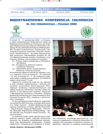 informacje ogólne informacje ogólne informacje ogólne informacje ogólne MIĘDZYNARODOWA KONFERENCJA CHŁODNICZA XL Dni Chłodnictwa – Poznań 2008 W dniach 15 – 17 października 2008 r. w Poznaniu w salach konferencyjnych Hotelu Mercure odbyła się Międzynarodowa Konferencja Chłodnicza pod auspicjami Międzynarodowego Instytutu Chłodnictwa z siedzibą w Paryżu (International Institute of Refrigeration, IIR). Tematem konferencji było „Projektowanie i eksploatacja przyjaznych środowisku systemów chłodniczych i klimatyzacyjnych”. Jej zakres obejmował trzy bloki tematyczne, odpowiadające komisjom B1, B2 i C2 Międzynarodowego Instytutu Chłodnictwa. A oto tematyka referatów w poszczególnych komisjach: B1 – Procesy cieplno-przepływowe w chłodnictwie i klimatyzacji; B2 – Energetycznie efektywne systemy i urządzenia chłodnicze; C2 – Zapewnienie jakości i bezpieczeństwa chłodzonej i mrożonej żywności. Na konferencję zgłoszono łącznie 56 referatów z kraju i z zagranicy, w tym do komisji B1 - 20, komisji B2 - 22 oraz do komisji C2 - 11. Na konferencji wygłoszono także 3 referaty wprowadzające. W konferencji ogółem udział wzięło 77 osób. Tegoroczna konferencja miała po raz pierwszy w pełni charakter międzynarodowy i stanowiła jednocześnie ukoronowanie dotychczasowych 39-ciu krajowych konferencji naukowo-technicznych pod ogólną nazwą Dni Chłodnictwa. Ponadto została ona wpisana w cykl tegorocznych wydarzeń związanych z odbywającą się w grudniu br. w Poznaniu, światową konferencją klimatyczną (XIV Sesja Konferencji Stron Ramowej Konwencji ONZ), związaną z ochroną klimatu i środowiska. W celu podniesienia rangi Konferencji, organizatorzy powołali Komitet Honorowy, w którego skład weszli m.in. Didier Coulomb – dyrektor Międzynarodowego Instytutu Chłodnictwa w Paryżu, Minister Środowiska – Maciej Nowicki, Wojewoda Wielkopolski – Piotr Florek, Marszałek Województwa Wielkopolskiego – Marek Woźniak oraz Prezydent miasta Poznania – Ryszard Grobelny. W konferencji wzięło udział szerokie grono przedstawicieli wyższych uczelni, instytutów naukowo-badawczych, biur projektów, przedsiębiorstw wykonawczych oraz bezpośrednich użytkowników urządzeń chłodniczych i klimatyzacyjnych. Spotkania w ramach technika chłodnicza i klimatyzacyjna 11/2008 „Dni Chłodnictwa” umożliwiają zapoznanie się z najnowszymi osiągnięciami w dziedzinie chłodnictwa i klimatyzacji oraz pozwalają na dokonanie wymiany doświadczeń i informacji, co zwiększa zainteresowanie 463 informacje ogólne informacje ogólne konferencją i ma również wpływ na jej wysoką rangę. W organizowanych od 1966 roku, łącznie już 40 konferencjach wzięło udział blisko 3790 osób, w tym 118 z zagranicy. W trakcie ich trwania wygłoszono 640 referatów o charakterze naukowym i naukowo-technicznym, w tym 84 zagraniczne z 18-tu krajów. Na konferencjach byli obecni przedstawiciele wyższych uczelni technicznych w Polsce, w tym m.in. Politechnik Gdańskiej, Koszalińskiej, Krakowskiej, Łódzkiej, Poznańskiej, Szczecińskiej, Rzeszowskiej, Śląskiej, Warszawskiej, Wrocławskiej, Akademii Górniczo-Hutniczej w Krakowie oraz takich instytucji m.in. jak Centralnego Ośrodka Chłodnictwa w Krakowie, Instytutu Maszyn Przepływowych PAN w Gdańsku, Centralnego Laboratorium Chłodnictwa w Łodzi oraz takich firm jak np. Wytwórnia Urządzeń Chłodniczych w Dębicy, Mostostal Wrocław i wielu innych. Znaczna część referatów wygłoszonych w ramach „Dni Chłodnictwa” była opublikowana w miesięcznikach „Chłodnictwo”, „Chłodnictwo & Klimatyzacja” oraz „Technika Chłodnicza i Klimatyzacyjna”. Głównymi organizatorami tegorocznej, międzynarodowej konferencji były Sekcja Chłodnictwa i Klimatyzacji przy Oddziale SIMP w Poznaniu oraz firma Systherm Chłodnictwo i Klimatyzacja Sp. z o.o., a jej współorganizatorami - Instytuty: Inżynierii Środowiska oraz Maszyn Roboczych i Pojazdów Samochodowych Politechniki Poznańskiej, Centralne Laboratorium Chłodnictwa w Łodzi, Katedra Zarządzania Jakością Żywności Uniwersytetu Przyrodniczego w Poznaniu oraz Krajowe Forum Chłodnictwa w Warszawie. 464 informacje ogólne informacje ogólne Funkcje przewodniczących poszczególnych komisji pełnili: B1 – prof. dr hab. inż. Edward Szczechotechnika chłodnicza i klimatyzacyjna 11/2008 informacje ogólne informacje ogólne informacje ogólne informacje ogólne do browaru Kompanii Piwowarskiej „LECH” zakończona degustacją piwa w firmowym pubie. Ostatniego dnia konferencji odbyła się wycieczka autokarowa „Szlakiem Piastowskim” do Biskupina, najbardziej znanego w Europie Środkowej rezerwatu archeologicznego oraz do Gniezna, pierwszej stolicy Polski. Konferencji patronowali: czasopisma branżowe „Chłodnictwo & Klimatyzacja”, „Technika Chłodnicza i Klimatyzacyjna” i „Chłodnictwo” oraz portale inter- wiak z Politechniki Poznańskiej, B2 – prof. dr hab. inż. Wiesław Zwierzycki z Politechniki Poznańskiej oraz C2 – prof. dr hab. Jacek Kijowski z Uniwersytetu Przyrodniczego w Poznaniu. Językami konferencji były język polski i angielski. Wszystkie prezentowane referaty wygłaszane w języku polskim tłumaczono symultanicznie na język angielski i odwrotnie. Konferencja była dofinansowana przez Ministerstwo Nauki i Szkolnictwa Wyższego. Uzupełnieniem części merytorycznej konferencji były zajęcia towarzyszące, przeznaczone dla wszystkich uczestników. Pierwszego dnia organizatorzy zaprosili uczestników konferencji na uroczystą kolację do restauracji „Pod Pretekstem”, mieszczącej się w murach Zamku Cesarskiego w Poznaniu. Drugiego dnia w godzinach popołudniowych odbył się spacer po Starym Mieście w Poznaniu, a wieczorem wycieczka netowe www.wentylacja.com.pl, www.klimatyzacja.pl i www.EER.pl. Wszystkich zainteresowanych, którzy nie mogli wziąć udziału w konferencji zachęcamy do za
