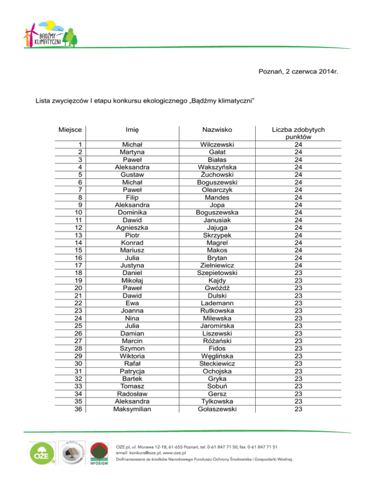 Poznań, 2 czerwca 2014r. Lista zwycięzców I etapu konkursu ekologicznego „Bądźmy klimatyczni” Miejsce 1 2 3 4 5 6 7 8 9 10 11 12 13 14 15 16 17 18 19 20 21 22 23 24 25 26 27 28 29 30 31 32 33 34 35 36 Imię Nazwisko Michał Martyna Paweł Aleksandra Gustaw Michał Paweł Filip Aleksandra Dominika Dawid Agnieszka Piotr Konrad Mariusz Julia Justyna Daniel Mikołaj Paweł Dawid Ewa Joanna Nina Julia Damian Marcin Szymon Wiktoria Rafał Patrycja Bartek Tomasz Radosław Aleksandra Maksymilian Wilczewski Gałat Białas Wakszyńska Żuchowski Boguszewski Olearczyk Mandes Jopa Boguszewska Janusiak Jajuga Skrzypek Magrel Makos Brytan Zielniewicz Szepietowski Kajdy Gwóźdź Dulski Lademann Rutkowska Milewska Jaromirska Liszewski Różański Fidos Węglińska Steckiewicz Ochojska Gryka Sobuń Gersz Tylkowska Gołaszewski Liczba zdobytych punktów 24 24 24 24 24 24 24 24 24 24 24 24 24 24 24 24 24 23 23 23 23 23 23 23 23 23 23 23 23 23 23 23 23 23 23 23 37 38 39 40 41 42 43 44 45 46 47 48 49 50 51 52 53 54 55 56 57 58 59 60 61 62 63 64 65 66 67 68 69 70 71 72 73 74 75 76 77 78 79 80 81 82 83 84 Jan Natalia Jan Daria Sława Paulina Bruno Łucja Antoni Gabriela Miłosz Paulina Jakub Julia Jakub Milla Katarzyna Anastazja Julia Natalia Kaja Dominika Anna IGA Magdalena Natalia Marta Joanna Dominika Dominika Paulina Aleksandra Justyna Patrycja Jan Mikołaj Karolina Michał Kosma Michał Agnieszka Jakub Szymon Przemysław Michał Dorota Hubert Olga Julia Ratajczak Talowska Żuchowski Wrzyszcz Mielcarek Hałka Sabiniewicz Woźniak Śmidoda Krzywicka Zieliński Skrzyńska Pawłowski Musiedlak Dryka Karlińska Szmagara Stepanow Wołoszyn Workowska Tyszkiewicz Jaszewska Leszczyńska MUSIORSKA Zachariasz Dudzis Wajda Węglewska Zembrzycka Ronek Czestkowska Dolna Korneluk Ciupak Janczak Gardaś Faszczewski Gaillard Żelazowski Makowska Kozioł Pikulski Kulesza Dujka Libera Wagner Biel Garkowska 23 23 23 23 23 23 23 23 23 23 23 23 23 23 23 23 23 23 23 23 23 23 23 23 23 23 23 23 22 22 22 22 22 22 22 22 22 22 22 22 22 22 22 22 22 22 22 22 85 86 87 88 89 90 91 92 93 94 95 96 97 98 99 100 Iza Hanna Joanna Mar3k Weronika Mikołaj Mati Piotr Mateusz Ola Natalia Zuzanna Jakub Michał Martyna Kacper Grędziszewska Zienda Jędrzejak Malinowski Jakimowicz Kowalczyk Ratajczak Jarząbek Francik Łaszczewska Kwatek Zielińska Romanek Kopyt Nieczyperowicz Mińkowski 22 22 22 22 22 22 22 22 22 22 22 22 22 22 22 22