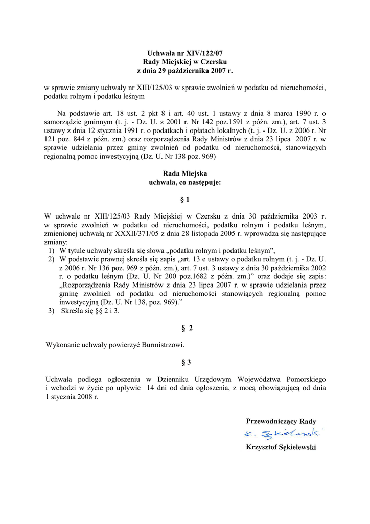 Uchwała nr XIV/122/07 Rady Miejskiej w Czersku z dnia 29 października 2007 r. w sprawie zmiany uchwały nr XIII/125/03 w sprawie zwolnień w podatku od nieruchomości, podatku rolnym i podatku leśnym Na podstawie art. 18 ust. 2 pkt 8 i art. 40 ust. 1 ustawy z dnia 8 marca 1990 r. o samorządzie gminnym (t. j. - Dz. U. z 2001 r. Nr 142 poz.1591 z późn. zm.), art. 7 ust. 3 ustawy z dnia 12 stycznia 1991 r. o podatkach i opłatach lokalnych (t. j. - Dz. U. z 2006 r. Nr 121 poz. 844 z późn. zm.) oraz rozporządzenia Rady Ministrów z dnia 23 lipca 2007 r. w sprawie udzielania przez gminy zwolnień od podatku od nieruchomości, stanowiących regionalną pomoc inwestycyjną (Dz. U. Nr 138 poz. 969) Rada Miejska uchwala, co następuje: §1 W uchwale nr XIII/125/03 Rady Miejskiej w Czersku z dnia 30 października 2003 r. w sprawie zwolnień w podatku od nieruchomości, podatku rolnym i podatku leśnym, zmienionej uchwałą nr XXXII/371/05 z dnia 28 listopada 2005 r. wprowadza się następujące zmiany: 1) W tytule uchwały skreśla się słowa „podatku rolnym i podatku leśnym”, 2) W podstawie prawnej skreśla się zapis „art. 13 e ustawy o podatku rolnym (t. j. - Dz. U. z 2006 r. Nr 136 poz. 969 z późn. zm.), art. 7 ust. 3 ustawy z dnia 30 października 2002 r. o podatku leśnym (Dz. U. Nr 200 poz.1682 z późn. zm.)” oraz dodaje się zapis: „Rozporządzenia Rady Ministrów z dnia 23 lipca 2007 r. w sprawie udzielania przez gminę zwolnień od podatku od nieruchomości stanowiących regionalną pomoc inwestycyjną (Dz. U. Nr 138, poz. 969).” 3) Skreśla się §§ 2 i 3. § 2 Wykonanie uchwały powierzyć Burmistrzowi. §3 Uchwała podlega ogłoszeniu w Dzienniku Urzędowym Województwa Pomorskiego i wchodzi w Ŝycie po upływie 14 dni od dnia ogłoszenia, z mocą obowiązującą od dnia 1 stycznia 2008 r. Uzasadnienie: W uchwale nr XIII/125/03 Rady Miejskiej w Czersku z dnia 30 października 2003 r. w sprawie zwolnień w podatku od nieruchomości, podatku rolnym i podatku leśnym zmienia się podstawę prawną oraz wykreśla się zapis o zwolnieniu od podatku rolnego i leśnego gruntów stanowiących własność Gminy Czersk i nie oddanych w posiadanie osobom trzecim.