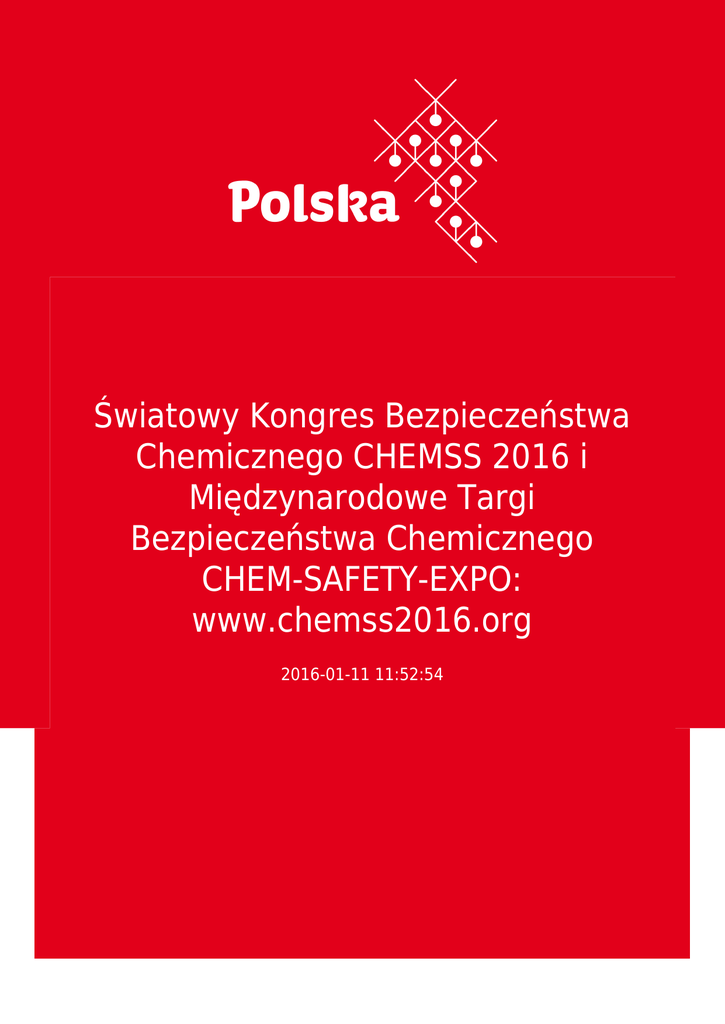 Światowy Kongres Bezpieczeństwa Chemicznego CHEMSS 2016 i Międzynarodowe Targi Bezpieczeństwa Chemicznego CHEM-SAFETY-EXPO: www.chemss2016.org 2016-01-11 11:52:54 2 3 Chemss2016 będzie pierwszym światowym zgromadzeniem udziałowców i użytkowników chemii i ochrony środowiska w zakresie bezpieczeństwa, reprezentujących agendy rządowe, przemysł, organizacje międzynarodowe i pozarządowe, społeczność obywatelską oraz media. Wśród kilkunastu partnerstw międzynarodowych, strategicznymi partnerami Chemss2016 są Departament Stanu oraz Departament Bezpieczeństwa Publicznego USA (główny partner merytoryczny) oraz Chińska Federacja Przemysłu Naftowego i Chemicznego, największa organizacja przemysłowa w Chinach. Zainteresowanie i poparcie dla Chemss2016 i rozwoju polskiej specjalizacji w bezpieczeństwie chemicznym okazał Pan Prezydent RP Andrzej Duda. Zwróciliśmy się z prośbą do Pana Prezydenta Andrzeja Dudy o patronat i wystąpienie w sesji otwierającej Chemss2016. Program Chemss2016 (folder chemss2016 oraz wstępny program załączamy) obejmie szerokie spektrum tematów bezpieczeństwa chemicznego i ekologicznego w nast. głównych grupach: bezpieczeństwo przemysłu chemicznego i transportu, ochrona infrastruktury krytycznej i obiektów składowania i przesyłania nośników energii, cyber-bezpieczeństwo, ochrona granicy, reagowanie kryzysowe i ochrona imprez masowych. W świetle licznych korzyści, jakie niesie organizacja kongresu i targów dla polskich podmiotów, liczymy wsparcie i szeroki udział Państwa instytucji, firm, organizacji, ośrodków naukowo badawczych. Zapraszamy do udziału w pierwszym Światowym Kongresie Bezpieczeństwa Chemicznego CHEMSS 2016 i towarzyszących mu Międzynarodowych Targach Bezpieczeństwa Chemicznego CHEM-SAFETY-EXPO. Kongres CHEMSS 2016 będzie pierwszym światowym apolitycznym wydarzeniem, odnoszącym się do zagadnień bezpieczeństwa chemicznego i ekologicznego w całym łańcuchu działalności, w tym w produkcji, transporcie, użytkowaniu i przechowywaniu chemikaliów. Kongres będzie punktem zwrotnym dla procesu globalizacji bezpieczeństwa chemicznego poprzez upowszechnianie najlepszych rozwiązań, które mogą sprostać współczesnym wyzwaniom przemysłu chemicznego na świecie. Program – wybrane zagadnienia • Współczesne zagrożenia bezpieczeństwa chemicznego • Istniejące programy zarządzania systemami bezpieczeństwa chemicznego oraz proces ich stałego doskonalenia • Bezpieczeństwo chemiczne w transporcie chemikaliów • Innowacje w cyberbezpieczeństwie i systemach automatyki dla bezpieczeństwa chemicznego • Innowacyjne rozwiązania w utylizacji niebezpiecznych substancji chemicznych • Ulepszenia w zakresie bezpieczeństwa chemicznego w przemyśle chemicznym • Zapobieganie sytuacjom kryzysowym • Wykorzystanie i współpraca z mediami w sytuacjach kryzysowych 4