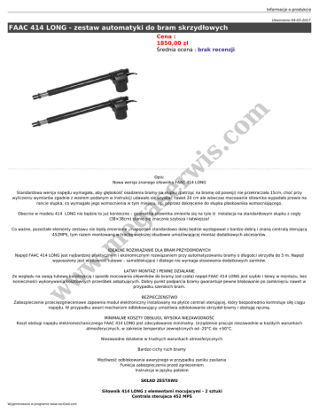 Informacje o produkcie Utworzono 04-03-2017 FAAC 414 LONG - zestaw automatyki do bram skrzydłowych Cena : 1850,00 zł rw is .c om Średnia ocena : brak recenzji eg as e Opis: Nowa wersja znanego siłownika FAAC 414 LONG Standardowa wersja napędu wymagała, aby głębokość osadzenia bramy na słupku (patrząc na bramę od posesji) nie przekraczała 15cm, choć przy wyliczeniu wymiarów zgodnie z wzorem podanym w instrukcji udawało się uzyskać nawet 20 cm ale wówczas mocowanie siłownika wypadało prawie na rancie słupka, co wymagało jego wzmocnienia w tym miejscu, np. poprzez dokręcenie do słupka płaskownika wzmacniającego. Obecnie w modelu 414 LONG nie będzie to już konieczne – geometria siłownika zmieniła się na tyle iż instalacja na standardowym słupku z cegły (38×38cm) stanie się znacznie szybsza i łatwiejsza! .m Co ważne, pozostałe elementy zestawu nie będą zmienione – napęd ten standardowo dalej będzie występował z bardzo dobrą i znaną centralą sterującą 452MPS, tym razem montowaną w trochę większej obudowie umożliwiającej montaż dodatkowych akcesoriów. w IDEALNE ROZWIĄZANIE DLA BRAM PRZYDOMOWYCH Napęd FAAC 414 LONG jest najbardziej praktycznym i ekonomicznym rozwiązaniem przy automatyzowaniu bramy o długości skrzydła do 5 m. Napęd wyposażony jest w siłowniki tubowe – samoblokujące i dlatego nie wymaga stosowania dodatkowych zamków. w w ŁATWY MONTAŻ I PEWNE DZIAŁANIE Ze względu na swoją tubową konstrukcję i sposób mocowania siłowników do bramy (od czoła) napęd FAAC 414 LONG jest szybki i łatwy w montażu, bez konieczności wykonywania kosztownych przeróbek adoptujących. Dobry punkt podparcia bramy gwarantuje pewne blokowanie po zamknięciu nawet w przypadku szerokich bram. BEZPIECZEŃSTWO Zabezpieczenie przeciwzgnieceniowe zapewnia moduł elektroniczny instalowany na płytce centrali sterującej, który bezpośrednio kontroluje siłę ciągu napędu. W przypadku awarii mechanizm odblokowujący umożliwia odblokowanie skrzydeł bramy i obsługę ręczną. MINIMALNE KOSZTY OBSŁUGI, WYSOKA NIEZAWODNOŚĆ Koszt obsługi napędu elektromechanicznego FAAC 414 LONG jest zdecydowanie minimalny. Urządzenie pracuje niezawodnie w każdych warunkach atmosferycznych, w zakresie temperatur zewnętrznych od -20°C do +50°C. Niezawodne działanie w trudnych warunkach atmosferycznych Bardzo cichy ruch bramy Możliwość odblokowania awaryjnego w przypadku zaniku zasilania Funkcja zabezpieczenia przed zgnieceniem Instrukcja w języku polskim SKŁAD ZESTAWU Siłownik 414 LONG z elementami mocujacymi - 2 sztuki Centrala sterujaca 452 MPS Wygenerowano w programie www.oscGold.com Obudowa do centrali Radioodbiornik dwukanałowy LC Pilot FIX2 2-kanałowy -2 sztuki Fotokomórki SAFEBEAM Elementy montażowe Klucze do odblokowywania awaryjnego Instrukcja w języku polskim gwarancja 24 miesięce Lampa sygnalizacyjna ST230 Odboje krańcowe na otwieranie i zamykanie Charakterystyka techniczna 414 LONG 230 V 230 V 280 W 1400 obr./min 1,2 A 140°C 3500 N 1,5 cm/s -20°C +55°C 6,5 kg IP 44 rw is .c om Zasilanie Zasilanie silnika Pobór mocy Prędkość obrotowa silnika Pobór prądu Zabezpieczenie termiczne Siła ciągu Prędkość wysuwu Zakres temperatur pracy Ciężar siłownika Stopień ochrony eg as e Inne funkcje centrali Tryb automatyczny - zamkniecie bramy po czasie określonym przez użytkownika Tryb "krok po kroku" - zamknięcie bramy po nacisnięciu pilota Możliwość podłączenia lampy i antenty(możesz kupić na moich aukcjach) Funkcja furtki wyprzedzające świecenie lampy ostrzegawczej Opóźnienie skrzydeł przy zamykaniu - 0, 5, 10, 20 s - regulowane w w w .m