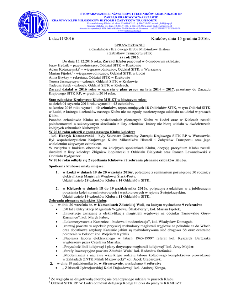 STOWARZYSZENIE INŻYNIERÓW I TECHNIKÓW KOMUNIKACJI RP ZARZĄD KRAJOWY W WARSZAWIE KRAJOWY KLUB MIŁOŚNIKÓW HISTORII I ZABYTKÓW TRANSPORTU Przewodniczący Klubu: tel. dom. 12-634-47-52, 514-735-795 e-mail: [email protected] Sekretarz Klubu: tel. dom. 12-294-71-09, 602-457-552 e-mail: [email protected] Adres do korespondencji: SITK Oddział Kraków; 30-804 Kraków. ul. Siostrzana 11. tel.: 12 658-93-72; fax 658-00-76 e-mail: [email protected] l. dz.:11/2016 Kraków, dnia 15 grudnia 2016r. SPRAWOZDANIE z działalności Krajowego Klubu Miłośników Historii i Zabytków Transportu SITK za rok 2016. Do dnia 15.12.2016 roku, Zarząd Klubu pracował w 6 osobowym składzie: Jerzy Hydzik – przewodniczący, Oddział SITK w Krakowie Adam Kotuszewski1 – wiceprzewodniczący, Oddział SITK w Warszawie Marian Fijołek2 - wiceprzewodniczący, Oddział SITK w Łodzi Anna Bryksy – sekretarz, Oddział SITK w Krakowie Teresa Jaszczyszyn – członek, Oddział SITK w Krakowie Tadeusz Sułek - członek, Oddział SITK w Kielcach. Zarząd działał w 2016 roku w oparciu o plan pracy na lata 2014 – 2017, przesłany do Zarządu Krajowego SITK RP, w grudniu 2014 roku. Stan członków Krajowego Klubu MHiZT w bieżącym roku: na dzień 01 stycznia 2016 roku wynosił – 43 członków. na koniec 2016 roku wynosi - 40 członków, reprezentujących 18 Oddziałów SITK, w tym Oddział SITK w Łodzi, z którego 4 członków naszego Klubu nie ma zgody macierzystego oddziału na udział w pracach Klubu. Ponadto członkowie Klubu na posiedzeniach plenarnych Klubu w Łodzi oraz w Kielcach zostali poinformowani o sukcesywnym skreślaniu z listy członków, którzy nie biorą udziału w dwóch/trzech kolejnych zebraniach klubowych. W 2016 roku odeszli z grona naszego Klubu koledzy: - kol. Henryk Komorowski – były Sekretarz Generalny Zarządu Krajowego SITK RP w Warszawie. Był współzałożycielem Krajowego Klubu Miłośników Historii i Zabytków Transportu oraz jego wieloletnim aktywnym członkiem. W związku z brakiem obecności na kolejnych spotkaniach Klubu, decyzją prezydium Klubu zostali skreśleni z listy koledzy: Zbigniew Łopianecki z Oddziału Białystok oraz Roman Lewandowski z Oddziału Bydgoszcz. W 2016 roku odbyły się 2 spotkania Klubowe i 2 zebrania plenarne członków Klubu. Spotkania klubowe miały miejsce: 1. w Łodzi w dniach 19 do 20 września 2016r, połączone z seminarium poświęcone 50 rocznicy elektryfikacji Magistrali Węglowej Śląsk-Porty. Udział wzięło 28 członków Klubu z 14 Oddziałów SITK. w Kielcach w dniach 18 do 19 października 2016r, połączone z udziałem w z jubileuszem powstania kolei normalnotorowych i wąskotorowych w rejonie Świętokrzyskim. Udział wzięło 19 członków Klubu z 11 Oddziałów SITK. Zebrania plenarne członków klubu: w dniu 20 września br. w Karsznicach Zduńskiej Woli, na którym wysłuchano 9 referatów: „50 lat elektryfikacji Magistrali Węglowej Śląsk-Porty”, kol. Marian Fijołek, „Inwestycje związane z elektryfikacją magistrali węglowej na odcinku Tarnowskie GóryKarsznice”, kol. Marek Faber, „Lokomotywownia Karsznice – budowa i modernizacja”, kol. Władysław Domagała. „rozwój powiatu w aspekcie przyszłej rozbudowy magistrali węglowe na południe aż do Włoch oraz dodatkowe atrybuty Karsznic jakim są rozbudowywana sieć drogowa S8 oraz centralne położenie w Polsce” kol. Wojciech Rychlik. „Naprawa taboru elektrycznego w latach 1965-1999” referat kol. Ryszarda Bartczaka wygłoszony przez Czesława Masiaka. „Przyszłość linii kolejowej i plany dotyczące magistrali kolejowej” kol. Jerzy Majder. „Strefy Inwestycyjne powiatu Zduńska Wola” kol. Radosław Stefaniak. „Modernizacja i naprawy wszelkiego rodzaju taboru kolejowego kompleksowo prowadzone w Zakładach ZNTK Mińsk Mazowiecki” kol. Jacek Grabarczyk. w dniu 19 października br. w Strawczynie, wysłuchano 4 referaty: „ Z historii Jędrzejowskiej Kolei Dojazdowej” kol. Andrzej Kiraga, 2. 1 2 Ze względu na długotrwałą chorobę nie brał czynnego udziału w pracach Klubu. Oddział SITK RP W Łodzi odmówił delegacji Kolegi Fijołka do pracy w KKMHiZT „Historia linii kolejowej Iwangrodzko-Dąbrowskiej” kol. Bolesław Balcerek „Dzieje dworca kolejowego w Kielcach” kol. Teresa Cyzowska, „10 lecie otwarcia dla ruchu pasażerskiego stacji Włoszczowa Północ” kol. Eugeniusz Pokrzepa. W dniu 15 i 16 października obchodzono 140 rocznicę wjazdu pociągu do Nowego Sącza. Zorganizowano konferencję w której uczestniczyło 78 osób, wysłuchano 9 referatów. 140 lat kolei w Nowym Sączu „Kryniczanka”, który wygłosił kol. Jerzy Hydzik, „Rozwój infrastruktury kolejowej w Nowym Sączu do 1918 roku”, który wygłosił Pan Leszek Zakrzewski, „Z dziejów ruchu pasażerskiego na linii kolejowej Tarnów – Nowy Sącz – Muszyna do 1914 roku”, który wygłosił Pan Tomasz Machowski, „Stacja Ropałowa w Nowym Sączu”, który wygłosił Pan Leszek Zakrzewski, „Pociągi retro jako oczekiwany produkt Sądecczyzny i całej Małopolski”, który wygłosił Pan Łukasz Wideł, „Pierwsze parowozy na linii Tarnowsko – Leluchowskiej. - Ostatnie sądeckie parowozy”, który wygłosił Pan Leszek Zakrzewski, „Etyka zawodowa”, który wygłosił Pan Stanisław Korusewicz, „Budowa nowej linii kolejowej Podłęże – Muszyna”, który wygłosił Pan Piotr Majerczak, „Ludzie, Kolej, Wydarzenia, który wygłosił Pan Józef Michalik. Materiały konferencyjne zostały wydane w zeszycie n/t SITK RP Oddział w Krakowie nr 1(108)/2016. W 2016 roku kontynuowano serię prelekcji poświęconych historii budowy mostów, rozwoju komunikacji szynowej oraz lokomotywom. Przygotowano i zaprezentowano 6 prelekcji. Prelekcje odbyły się w dniach: 25 stycznia, 23 lutego, 11 kwietnia, 16 maja i 20 czerwca, w siedzibie oddziału SITK w Krakowie oraz w dniu 30 września dla uczestników seminarium wyjazdowego zespołów prob