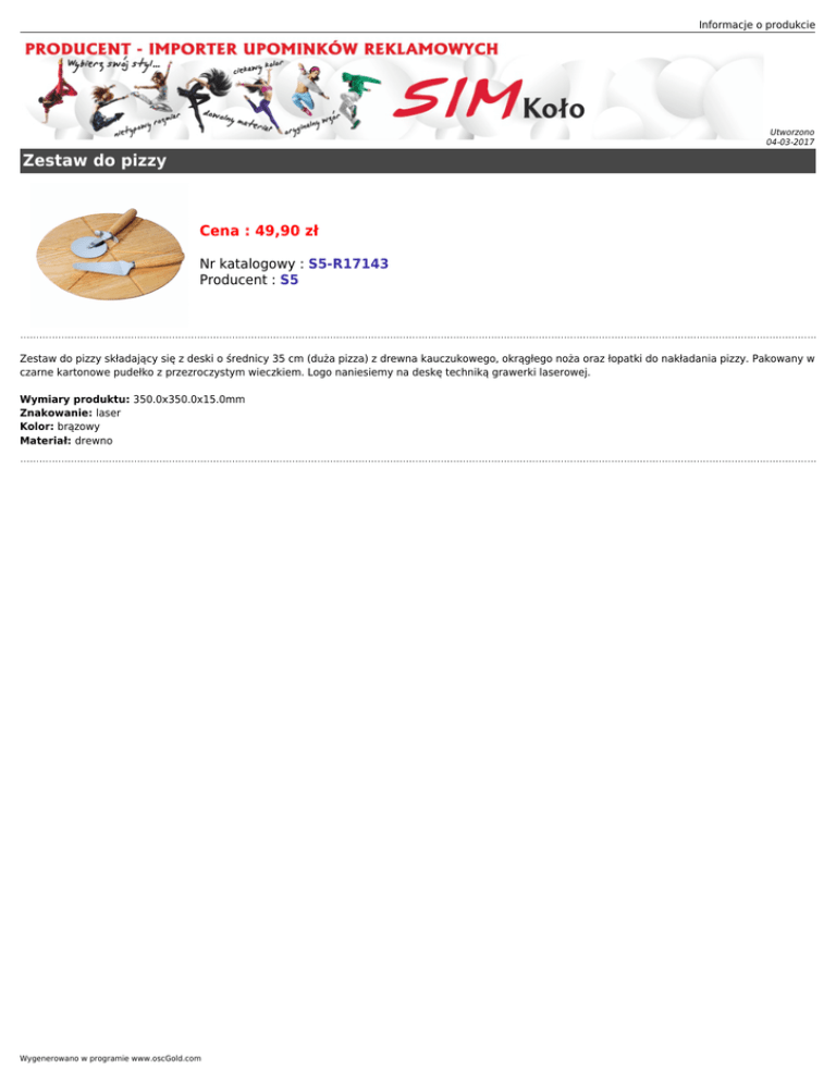 Informacje o produkcie Utworzono 04-03-2017 Zestaw do pizzy Cena : 49,90 zł Nr katalogowy : S5-R17143 Producent : S5 Zestaw do pizzy składający się z deski o średnicy 35 cm (duża pizza) z drewna kauczukowego, okrągłego noża oraz łopatki do nakładania pizzy. Pakowany w czarne kartonowe pudełko z przezroczystym wieczkiem. Logo naniesiemy na deskę techniką grawerki laserowej. Wymiary produktu: 350.0x350.0x15.0mm Znakowanie: laser Kolor: brązowy Materiał: drewno Wygenerowano w programie www.oscGold.com