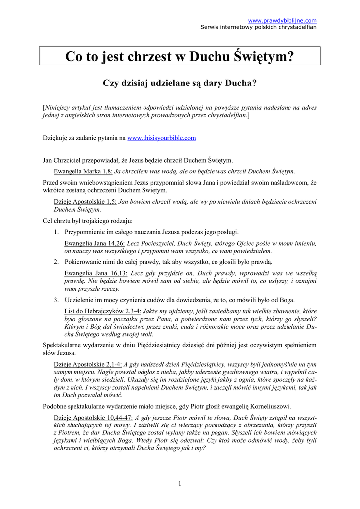 www.prawdybiblijne.com Serwis internetowy polskich chrystadelfian Co to jest chrzest w Duchu Świętym? Czy dzisiaj udzielane są dary Ducha? [Niniejszy artykuł jest tłumaczeniem odpowiedzi udzielonej na powyższe pytania nadesłane na adres jednej z angielskich stron internetowych prowadzonych przez chrystadelfian.] Dziękuję za zadanie pytania na www.thisisyourbible.com Jan Chrzciciel przepowiadał, że Jezus będzie chrzcił Duchem Świętym. Ewangelia Marka 1,8: Ja chrzciłem was wodą, ale on będzie was chrzcił Duchem Świętym. Przed swoim wniebowstąpieniem Jezus przypomniał słowa Jana i powiedział swoim naśladowcom, że wkrótce zostaną ochrzczeni Duchem Świętym. Dzieje Apostolskie 1,5: Jan bowiem chrzcił wodą, ale wy po niewielu dniach będziecie ochrzczeni Duchem Świętym. Cel chrztu był trojakiego rodzaju: 1. Przypomnienie im całego nauczania Jezusa podczas jego posługi. Ewangelia Jana 14,26: Lecz Pocieszyciel, Duch Święty, którego Ojciec pośle w moim imieniu, on nauczy was wszystkiego i przypomni wam wszystko, co wam powiedziałem. 2. Pokierowanie nimi do całej prawdy, tak aby wszystko, co głosili było prawdą. Ewangelia Jana 16,13: Lecz gdy przyjdzie on, Duch prawdy, wprowadzi was we wszelką prawdę. Nie będzie bowiem mówił sam od siebie, ale będzie mówił to, co usłyszy, i oznajmi wam przyszłe rzeczy. 3. Udzielenie im mocy czynienia cudów dla dowiedzenia, że to, co mówili było od Boga. List do Hebrajczyków 2,3-4: Jakże my ujdziemy, jeśli zaniedbamy tak wielkie zbawienie, które było głoszone na początku przez Pana, a potwierdzone nam przez tych, którzy go słyszeli? Którym i Bóg dał świadectwo przez znaki, cuda i różnorakie moce oraz przez udzielanie Ducha Świętego według swojej woli. Spektakularne wydarzenie w dniu Pięćdziesiątnicy dziesięć dni później jest oczywistym spełnieniem słów Jezusa. Dzieje Apostolskie 2,1-4: A gdy nadszedł dzień Pięćdziesiątnicy, wszyscy byli jednomyślnie na tym samym miejscu. Nagle powstał odgłos z nieba, jakby uderzenie gwałtownego wiatru, i wypełnił cały dom, w którym siedzieli. Ukazały się im rozdzielone języki jakby z ognia, które spoczęły na każdym z nich. I wszyscy zostali napełnieni Duchem Świętym, i zaczęli mówić innymi językami, tak jak im Duch pozwalał mówić. Podobne spektakularne wydarzenie miało miejsce, gdy Piotr głosił ewangelię Korneliuszowi. Dzieje Apostolskie 10,44-47: A gdy jeszcze Piotr mówił te słowa, Duch Święty zstąpił na wszystkich słuchających tej mowy. I zdziwili się ci wierzący pochodzący z obrzezania, którzy przyszli z Piotrem, że dar Ducha Świętego został wylany także na pogan. Słyszeli ich bowiem mówiących językami i wielbiących Boga. Wtedy Piotr się odezwał: Czy ktoś może odmówić wody, żeby byli ochrzczeni ci, którzy otrzymali Ducha Świętego jak i my? 1 www.prawdybiblijne.com Serwis internetowy polskich chrystadelfian Później Piotr nawiązuje do Pięćdziesiątnicy, wyjaśniając, że Korneliusz, pierwszy nawrócony poganin, miał podobne doświadczenie to manifestacji Pięćdziesiątnicy. Dzieje Apostolskie 11,15-17: A gdy zacząłem mówić, zstąpił na nich Duch Święty, tak jak na nas na początku. I przypomniałem słowo Pana, gdy powiedział: Jan chrzcił wodą, ale wy będziecie ochrzczeni Duchem Świętym. Jeśli więc Bóg dał im ten sam dar co nam, którzy uwierzyliśmy w Pana Jezusa Chrystusa, kim ja jestem, abym mógł zabronić Bogu? Piotr musiał pamiętać wydarzenie, które miało miejsce kilka lat wcześniej, co wyraźnie wskazuje na to, że chrzest Duchem Świętym normalnie nie towarzyszył nawróceniu i chrztowi wodą. Piotr mówi o tym ponownie na zebraniu apostołów i starszych w sprawie obrzezania pogan. Dzieje Apostolskie 15,8: A Bóg, który zna serca, wydał im świadectwo, dając im Ducha Świętego, tak samo jak nam. Piotr jasno stwierdza, że klasyfikuje oba wydarzenia jako „ochrzczenie Duchem Świętym” – za pierwszym razem w dniu Pięćdziesiątnicy, a za drugim w czasie głoszenia Korneliuszowi. Z relacji tej można wyprowadzić dwa zasadne wnioski: 1. Chrzest Duchem Świętym dawał odbiorcom specjalne moce. 2. Chrzest Duchem Świętym nie był wydarzeniem, które normalnie miało miejsce, gdy ludzie, którzy uwierzyli, byli ochrzczeni. Nie ma w Piśmie żadnego ustępu, który pokazuje konkretnie, że chrzest Duchem Świętym był powszechnym doświadczeniem wszystkich chrzczonych wierzących. Raczej odwrotnie. Powyższe wnioski znajdują potwierdzenie w doświadczeniu Filipa z Smarytanami. Dzieje Apostolskie 8,12-19: A gdy uwierzyli Filipowi, który głosił o królestwie Bożym i o imieniu Jezusa Chrystusa, chrzcili się zarówno mężczyźni, jak i kobiety. Uwierzył też sam Szymon, a gdy się ochrzcił, trzymał się Filipa i zdumiewał się, widząc cuda i wielkie znaki, jakie się działy. Kiedy apostołowie, którzy byli w Jerozolimie, usłyszeli, że Samaria przyjęła słowo Boże, wysłali do nich Piotra i Jana; Którzy przyszli tam i modlili się za nich, aby otrzymali Ducha Świętego. Na żadnego z nich bowiem jeszcze nie zstąpił. Byli tylko ochrzczeni w imię Pana Jezusa. Wtedy kładli na nich ręce, a oni otrzymywali Ducha Świętego. A gdy Szymon zobaczył, że Duch Święty był udzielany przez nakładanie rąk apostołów, przyniósł im pieniądze; Mówiąc: Dajcie i mnie tę moc, aby ten, na kogo nałożę ręce, otrzymał Ducha Świętego. Z tej narracji można zasadnie wyciągnąć trzy dalsze wnioski: 1. Samarytańscy nawróceni nie byli „chrzczeni Duchem Świętym” ani przed, w trakcie, ani po chrzcie wodnym. 2. Apostołowie Piotr i Jan musieli udać się do Samarii, położyć ręce na Samarytanach i modlić się za nich, zanim ci otrzymali Ducha Świętego. 3. Filip, który nie był apostołem, chociaż był „pełen Ducha Świętego” i mógł czynić cuda, nie mógł udzielić im Ducha Świętego. W pierwsz