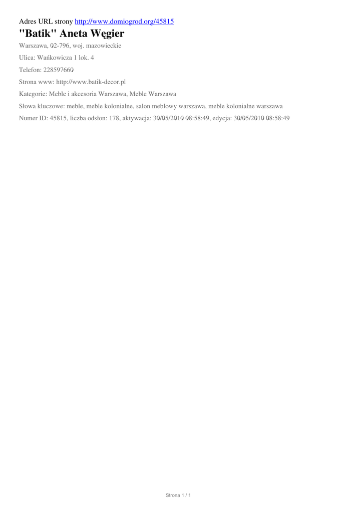Adres URL strony http://www.domiogrod.org/45815 "Batik" Aneta Węgier Warszawa, 02-796, woj. mazowieckie Ulica: Wańkowicza 1 lok. 4 Telefon: 228597660 Strona www: http://www.batik-decor.pl Kategorie: Meble i akcesoria Warszawa, Meble Warszawa Słowa kluczowe: meble, meble kolonialne, salon meblowy warszawa, meble kolonialne warszawa Numer ID: 45815, liczba odsłon: 178, aktywacja: 30/05/2010 08:58:49, edycja: 30/05/2010 08:58:49 Strona 1 / 1
