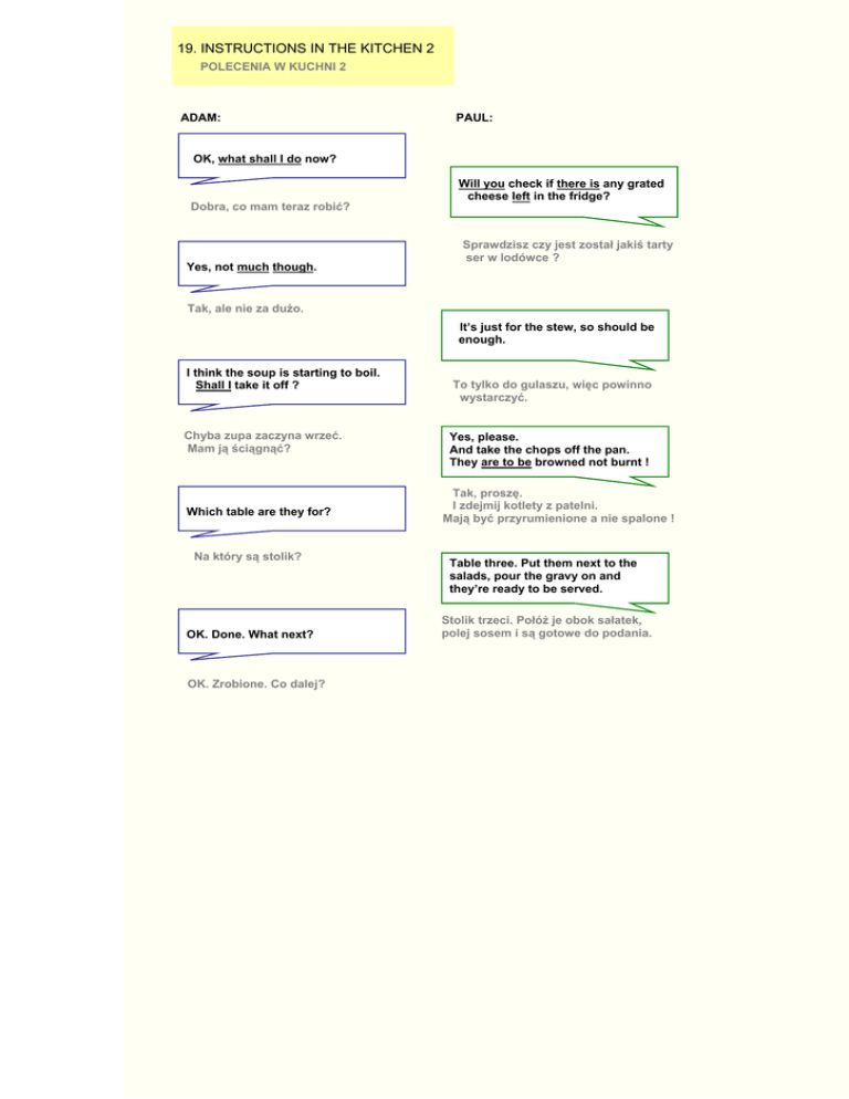 19. INSTRUCTIONS IN THE KITCHEN 2 POLECENIA W KUCHNI 2 ADAM: PAUL: OK, what shall I do now? Dobra, co mam teraz robić? Yes, not much though. Will you check if there is any grated cheese left in the fridge? Sprawdzisz czy jest został jakiś tarty ser w lodówce ? Tak, ale nie za dużo. It’s just for the stew, so should be enough. I think the soup is starting to boil. Shall I take it off ? Chyba zupa zaczyna wrzeć. Mam ją ściągnąć? Which table are they for? Na który są stolik? OK. Done. What next? OK. Zrobione. Co dalej? To tylko do gulaszu, więc powinno wystarczyć. Yes, please. And take the chops off the pan. They are to be browned not burnt ! Tak, proszę. I zdejmij kotlety z patelni. Mają być przyrumienione a nie spalone ! Table three. Put them next to the salads, pour the gravy on and they’re ready to be served. Stolik trzeci. Połóż je obok sałatek, polej sosem i są gotowe do podania. NOTES: 1. Shall I (do something) …. ? = Czy mam (coś zrobić) np. Shall I lay the tables? – Czy mam nakryć stoły? What shall I do ? - Co mam robić? Patrz też – notatki do lekcji 18. 2. Wydając polecenia, możemy użyć czystej formy trybu rozkazującego, np. Open ! Check! Wait! Jeżeli chcemy, by polecenie miało bardziej uprzejmy charakter – prośby, zastosujemy jedną z poniższych konstrukcji: Will you (check the temperature)? Would you (keep an eye on this)? Can you (help me)? Could you(turn the gas down)? 3. there is / are / ………………. left - zostało …….. Np. There is some cheese left – Zostało trochę sera. 4. much – dużo, dla rzeczowników niepoliczalnych Many – dużo, dla rzeczowników policzalnych There is much bread. – Jest dużo chleba There are many bread rolls. – Jest dużo bułek. 5. though – a jednak, ale ; zawsze na końcu zdania. I’ve been working all day. I’m not tired though. Pracowałem cały dzień, a jednak nie jestem zmęczony. Add some salt. Not too much though. Dodaj trochę soli. Ale nie za dużo. 6. Konstrukcja to be + bezokolicznik wyraża powinność, obowiązek, oznacza – „mam coś zrobić” Np. I am to start work at 11 - Mam zacząć pracę o 11. He is to be back - On ma wrócić It is to be ready for tonight - To ma być gotowe na dziś wieczór. It was to be done an hour ago - To miało być zrobione godzinę temu. HOW MUCH DO YOU REMEMBER? - STEP 1 ADAM: PAUL: OK, 1. now? 2. check if 3. grated cheese 3. Dobra, co mam teraz robić? Yes, not 4. 5. . any in the fridge? Sprawdzisz czy jest został jakiś tarty ser w lodówce ? Tak, ale nie za dużo. It’s just for the stew, so should be enough. I think the soup is starting to boil. 1. take it off ? Chyba zupa zaczyna wrzeć. Mam ją ściągnąć? Which table are they for? Na który są stolik? OK. Done. What next? OK. Zrobione. Co dalej? To tylko do gulaszu, więc powinno wystarczyć. Yes, please. And take the chops off the pan. They 6. browned not burnt ! Tak, proszę. I zdejmij kotlety z patelni. Mają być przyrumienione a nie spalone ! Table three. Put them next to the salads, pour the gravy on and they’re ready to be served. Stolik trzeci. Połóż je obok sałatek, polej sosem i są gotowe do podania. HOW MUCH DO YOU REMEMBER? - STEP 2 – Adam’s part ADAM: Dobra, co mam teraz robić? PAUL: Will you check if there is any grated cheese left in the fridge? Tak, ale nie za dużo. It’s just for the stew, so should be enough. Chyba zupa zaczyna wrzeć. Mam ją ściągnąć? Na który są stolik? OK. Zrobione. Co dalej? Yes, please. And take the chops off the pan. They are to be browned not burnt ! Table three. Put them next to the salads, pour the gravy on and they’re ready to be served. HOW MUCH DO YOU REMEMBER? - STEP 3 – Paul’s part ADAM: PAUL: OK, what shall I do now? Yes, not much though. I think the soup is starting to boil. Shall I take it off ? Which table are they for? OK. Done. What next? Sprawdzisz czy jest został jakiś tarty ser w lodówce ? To tylko do gulaszu, więc powinno wystarczyć. Tak, proszę. I zdejmij kotlety z patelni. Mają być przyrumienione a nie spalone ! Stolik trzeci. Połóż je obok sałatek, polej sosem i są gotowe do podania.