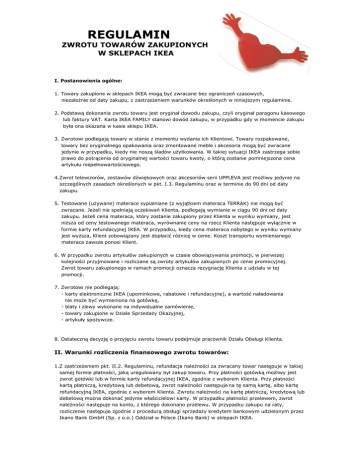 REGULAMIN ZWROTU TOWARÓW ZAKUPIONYCH W SKLEPACH IKEA I. Postanowienia ogólne: 1. Towary zakupione w sklepach IKEA mogą być zwracane bez ograniczeń czasowych, niezależnie od daty zakupu, z zastrzeżeniem warunków określonych w niniejszym regulaminie. 2. Podstawą dokonania zwrotu towaru jest oryginał dowodu zakupu, czyli oryginał paragonu kasowego lub faktury VAT. Karta IKEA FAMILY stanowi dowód zakupu, w przypadku gdy w momencie zakupu była ona okazana w kasie sklepu IKEA. 3. Zwrotowi podlegają towary w stanie z momentu wydania ich Klientowi. Towary rozpakowane, towary bez oryginalnego opakowania oraz zmontowane meble i akcesoria mogą być zwracane jedynie w przypadku, kiedy nie noszą śladów użytkowania. W takiej sytuacji IKEA zastrzega sobie prawo do potrącenia od oryginalnej wartości towaru kwoty, o którą zostanie pomniejszona cena artykułu niepełnowartościowego. 4.Zwrot telewizorów, zestawów dźwiękowych oraz akcesoriów serii UPPLEVA jest możliwy jedynie na szczególnych zasadach określonych w pkt. I.3. Regulaminu oraz w terminie do 90 dni od daty zakupu. 5. Testowane (używane) materace sypialniane (z wyjątkiem materaca TERRAK) nie mogą być zwracane. Jeżeli nie spełniają oczekiwań Klienta, podlegają wymianie w ciągu 90 dni od daty zakupu. Jeżeli cena materaca, który zostanie zakupiony przez Klienta w wyniku wymiany, jest niższa od ceny testowanego materaca, wyrównanie ceny na rzecz Klienta następuje wyłącznie w formie karty refundacyjnej IKEA. W przypadku, kiedy cena materaca nabytego w wyniku wymiany jest wyższa, Klient zobowiązany jest dopłacić różnicę w cenie. Koszt transportu wymienianego materaca zawsze ponosi Klient. 6. W przypadku zwrotu artykułów zakupionych w czasie obowiązywania promocji, w pierwszej kolejności przyjmowane i rozliczane są zwroty artykułów zakupionych po cenie promocyjnej. Zwrot towaru zakupionego w ramach promocji oznacza rezygnację Klienta z udziału w tej promocji. 7. Zwrotowi nie podlegają: - karty elektroniczne IKEA (upominkowe, rabatowe i refundacyjne), a wartość naładowania nie może być wymieniona na gotówkę, - blaty i zlewy wykonane na indywidualne zamówienie, - towary zakupione w Dziale Sprzedaży Okazyjnej, - artykuły spożywcze. 8. Ostateczną decyzję o przyjęciu zwrotu towaru podejmuje pracownik Działu Obsługi Klienta. II. Warunki rozliczenia finansowego zwrotu towarów: 1.Z zastrzeżeniem pkt. II.2. Regulaminu, refundacja należności za zwracany towar następuje w takiej samej formie płatności, jaką uregulowany był zakup towaru. Przy płatności gotówką możliwy jest zwrot gotówki lub w formie karty refundacyjnej IKEA, zgodnie z wyborem Klienta. Przy płatności kartą płatniczą, kredytową lub debetową, zwrot należności następuje na tę samą kartę, albo kartę refundacyjną IKEA, zgodnie z wyborem Klienta. Zwrotu należności na kartę płatniczą, kredytową lub debetową można dokonać jedynie właścicielowi karty. W przypadku płatności przelewem, zwrot należności następuje na konto, z którego dokonano przelewu. W przypadku zakupu na raty, rozliczenie następuje zgodnie z procedurą obsługi sprzedaży kredytem bankowym udzielonym przez Ikano Bank GmbH (Sp. z o.o.) Oddział w Polsce (Ikano Bank) w sklepach IKEA. 2. Rozliczenie należności w formie karty refundacyjnej IKEA ma miejsce w następujących przypadkach: - zwrot towarów rozpakowanych oraz bez oryginalnego opakowania, - zwrot nieużywanych zmontowanych mebli i akcesoriów, - wymiana testowanych materacy sypialnianych (z wyjątkiem materaca TERRAK) - zwrot towarów opłaconych kartami elektronicznymi IKEA, bonami Sodexho, - wymiana towaru zakupionego na raty (bez zmiany umowy ratalnej, zawartej z Ikano Bank GmbH (Sp. z o.o. Oddział w Polsce). 3. Karta refundacyjna IKEA jest ważna bezterminowo i może być zrealizowana w każdym sklepie IKEA na terenie Rzeczpospolitej Polskiej. III. Postanowienia końcowe: 1. Treść niniejszego Regulaminu jest dostępna na stronie internetowej IKEA.pl oraz w Dziale Obsługi Klienta w sklepach IKEA. 2. Zmiana warunków Regulaminu pozostanie bez wpływu na prawa i obowiązki Klienta nabyte przed wejściem w życie zmian Regulaminu. Zmienione warunki Regulaminu zostaną udostępnione na stronie internetowej IKEA.pl/Regulaminy oraz w sklepach IKEA. IV. Warunki zwrotu towarów obowiązują od dnia 25.12.2014 r. * Zasady opisane w niniejszym Regulaminie nie stoją na przeszkodzie dochodzeniu przez Konsumenta roszczeń na podstawie (a) Ustawy z dnia 23 kwietnia 1964 r. Kodeks cywilny, z tytułu rękojmi za wady rzeczy sprzedanej – w przypadku towarów zakupionych od dnia 25 grudnia 2014 r, (b) Ustawy z dnia 27 lipca 2002 r. o szczególnych warunkach sprzedaży konsumenckiej oraz o zmianie Kodeksu cywilnego, z tytułu niezgodności towaru z umową – w przypadku towarów zakupionych przed dniem 25 grudnia 2014 r. (c) gwarancji – w zakresie towarów objętych gwarancją jakości. Podstawą do ewentualnych reklamacji towaru, na podstawie wyżej wskazanych ustaw, jest dowód zakupu Towaru. Podstawą reklamacji towaru na podstawie gwarancji jest paragon kasowy lub faktura VAT lub Karta IKEA Family (jeżeli była ona okazana w momencie zakupu w kasie sklepu IKEA).