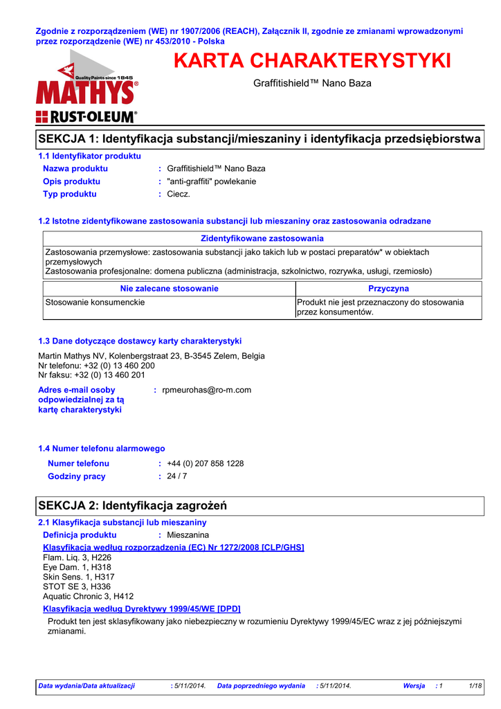 Zgodnie z rozporządzeniem (WE) nr 1907/2006 (REACH), Załącznik II, zgodnie ze zmianami wprowadzonymi przez rozporządzenie (WE) nr 453/2010 - Polska KARTA CHARAKTERYSTYKI Graffitishield™ Nano Baza SEKCJA 1: Identyfikacja substancji/mieszaniny i identyfikacja przedsiębiorstwa 1.1 Identyfikator produktu Nazwa produktu : Graffitishield™ Nano Baza Opis produktu : "anti-graffiti" powlekanie Typ produktu : Ciecz. 1.2 Istotne zidentyfikowane zastosowania substancji lub mieszaniny oraz zastosowania odradzane Zidentyfikowane zastosowania Zastosowania przemysłowe: zastosowania substancji jako takich lub w postaci preparatów* w obiektach przemysłowych Zastosowania profesjonalne: domena publiczna (administracja, szkolnictwo, rozrywka, usługi, rzemiosło) Nie zalecane stosowanie Stosowanie konsumenckie Przyczyna Produkt nie jest przeznaczony do stosowania przez konsumentów. 1.3 Dane dotyczące dostawcy karty charakterystyki Martin Mathys NV, Kolenbergstraat 23, B-3545 Zelem, Belgia Nr telefonu: +32 (0) 13 460 200 Nr faksu: +32 (0) 13 460 201 Adres e-mail osoby odpowiedzialnej za tą kartę charakterystyki : [email protected] 1.4 Numer telefonu alarmowego Numer telefonu Godziny pracy : +44 (0) 207 858 1228 : 24 / 7 SEKCJA 2: Identyfikacja zagrożeń 2.1 Klasyfikacja substancji lub mieszaniny Definicja produktu : Mieszanina Klasyfikacja według rozporządzenia (EC) Nr 1272/2008 [CLP/GHS] Flam. Liq. 3, H226 Eye Dam. 1, H318 Skin Sens. 1, H317 STOT SE 3, H336 Aquatic Chronic 3, H412 Klasyfikacja według Dyrektywy 1999/45/WE [DPD] Produkt ten jest sklasyfikowany jako niebezpieczny w rozumieniu Dyrektywy 1999/45/EC wraz z jej późniejszymi zmianami. Data wydania/Data aktualizacji : 5/11/2014. Data poprzedniego wydania : 5/11/2014. Wersja :1 1/18 Spełnia wymagania przepisów EC 1907/2006 (REACH), Załącznik II - Polska Graffitishield™ Nano Baza SEKCJA 2: Identyfikacja zagrożeń Klasyfikacja Zagrożenia fizyczne/ chemiczne : R10 Xi; R36 R43, R67 R52/53 : Produkt łatwopalny. Zagrożenia ludzkiego zdrowia : Działa drażniąco na oczy. Może powodować uczulenie w kontakcie ze skórą. Pary mogą wywoływać uczucie senności i zawroty głowy. Zagrożenia dla środowiska : Działa szkodliwie na organizmy wodne; może powodować długo utrzymujące się niekorzystne zmiany w środowisku wodnym. Pełny tekst powyższych zwrotów R lub uwag H podano w punkcie 16. Bardziej szczegółowe informacje dotyczące wpływu na stan zdrowia oraz ewentualnych objawów można znaleźć w rozdziale 11. 2.2 Elementy oznakowania Piktogramy zagrożeń : Hasło ostrzegawcze : Niebezpieczeństwo Zwroty wskazujące rodzaj zagrożenia : Łatwopalna ciecz i pary. Powoduje poważne uszkodzenie oczu. Może powodować reakcję alergiczną skóry. Może wywoływać uczucie senności lub zawroty głowy. Działa szkodliwie na organizmy wodne, powodując długotrwałe skutki. Zwroty wskazujące środki ostrożności Zapobieganie Reagowanie Przechowywanie Usuwanie : Chronić przed źródłami ciepła, urządzeniami iskrzącymi, otwartym ogniem i gorącymi powierzchniami. Nie palić. Unikać wdychania pary. Nosić rękawice ochronne i ochronę twarzy: polialkohol winylowy (PVA) rękawice i Ochronne okulary z bocznymi osłonami. : W PRZYPADKU DOSTANIA SIĘ DO OCZU: Ostrożnie płukać wodą przez kilka minut. Wyjąć soczewki kontaktowe, jeżeli są i można je łatwo usunąć. Nadal płukać. Natychmiast skontaktować się z lekarzem. W PRZYPADKU KONTAKTU ZE SKÓRĄ: Umyć dużą ilością wody z mydłem. W przypadku wystąpienia podrażnienia skóry lub wysypki: Zwrócić się o pomoc lekarską. : Przechowywać w dobrze wentylowanym miejscu. Przechowywać w chłodnym miejscu. Przechowywać pod zamknięciem. : Zawartość pojemnika jak i pojemnik utylizować zgodnie z lokalnymi, regionalnymi, narodowymi oraz międzynarodowymi przepisami. Uzupełniające elementy etykiety : Nie dotyczy. Ograniczenia dotyczące produkcji, wprowadzania do obrotu i stosowania niektórych niebezpiecznych substancji, preparatów i wyrobów : Nie dotyczy. Specjalne wymagania dotyczące pakowania Pojemniki powinny być : Nie dotyczy. wyposażone w zamknięcia uniemożliwiające otworzenie ich przez dzieci Data wydania/Data aktualizacji : 5/11/2014. Data poprzedniego wydania : 5/11/2014. Wersja :1 2/18 Spełnia wymagania przepisów EC 1907/2006 (REACH), Załącznik II - Polska Graffitishield™ Nano Baza SEKCJA 2: Identyfikacja zagrożeń Dotykowe ostrzeżenia przed niebezpieczeństwem : Nie dotyczy. 2.3 Inne zagrożenia Inne zagrożenia nie odzwierciedlone w klasyfikacji : Nie znane. SEKCJA 3: Skład/informacja o składnikach Substancja/Preparat : Mieszanina Klasyfikacja Nazwa produktu/ składnika octan butylu alkohol butylowy 4,4'isopropylidenedicyclohexanol, Identyfikatory % 67/548/EWG Rozporządzenie (WE) Nr 1272/2008 [CLP] Typ REACH #: 01-2119485493-29 WE: 204-658-1 CAS: 123-86-4 Indeks: 607-025-00-1 REACH #: 01-2119484630-38 WE: 200-751-6 CAS: 71-36-3 Indeks: 603-004-00-6 15 <20 R10 R66, R67 Flam. Liq. 3, H226 STOT SE 3, H336 [1] [2] 7 - <10 R10 Xn; R22 Xi; R41, R37/38 R67 [1] [2] REACH #: 01-2119959495-22 WE: 500-070-7 CAS: 30583-72-3 1 - <5 Xi; R36/38 R43 Flam. Liq. 3, H226 Acute Tox. 4, H302 Skin Irrit. 2, H315 Eye Dam. 1, H318 STOT SE 3, H335 and H336 Skin Sens. 1, H317 Aquatic Chronic 3, H412 1 - <5 Xi; R36 Skin Irrit. 2, H315 [1] [2] 1 - <2,5 R43 N; R50/53 Skin Sens. 1, H317 Aquatic Acute 1, H400 Aquatic Chronic 1, H410 [1] 0,25 <1 R43 N; R50/53 Skin Sens. 1, H317 Aquatic Acute 1, H400 Aquatic Chronic 1, H410 [1] Patrz Sekcja 16 pełny tekst zadeklarowanych wyżej Fraz-R. Pełny tekst powyższych uwag H podano w punkcie 16. oligomeric reaction products with 1-chloro-2, 3-epoxypropane eter dimetylowy glikolu REACH #: dipropylenowego 01-0000015420-83 WE: 404-640-5 CAS: 111109-77-4 pentametylopiperydylosebacynian REACH #: 01-2119491304-40 WE: 255-437-1 CAS: 41556-26-7 sebacynian WE: 280-060-4 metylowo-1,2,2,6,6,CAS: 82919-37-7 pentametylo-