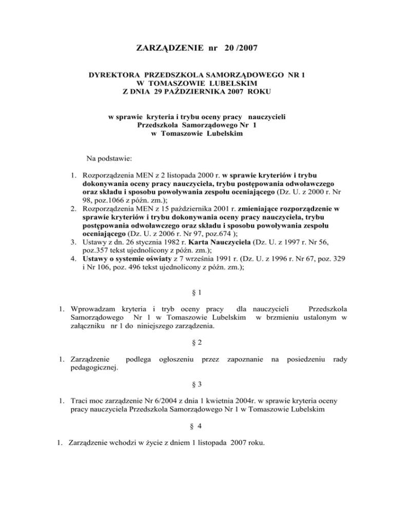 ZARZĄDZENIE nr 20 /2007 DYREKTORA PRZEDSZKOLA SAMORZĄDOWEGO NR 1 W TOMASZOWIE LUBELSKIM Z DNIA 29 PAŹDZIERNIKA 2007 ROKU w sprawie kryteria i trybu oceny pracy nauczycieli Przedszkola Samorządowego Nr 1 w Tomaszowie Lubelskim Na podstawie: 1. Rozporządzenia MEN z 2 listopada 2000 r. w sprawie kryteriów i trybu dokonywania oceny pracy nauczyciela, trybu postępowania odwoławczego oraz składu i sposobu powoływania zespołu oceniającego (Dz. U. z 2000 r. Nr 98, poz.1066 z późn. zm.); 2. Rozporządzenia MEN z 15 października 2001 r. zmieniające rozporządzenie w sprawie kryteriów i trybu dokonywania oceny pracy nauczyciela, trybu postępowania odwoławczego oraz składu i sposobu powoływania zespołu oceniającego (Dz. U. z 2006 r. Nr 97, poz.674 ); 3. Ustawy z dn. 26 stycznia 1982 r. Karta Nauczyciela (Dz. U. z 1997 r. Nr 56, poz.357 tekst ujednolicony z późn. zm.); 4. Ustawy o systemie oświaty z 7 września 1991 r. (Dz. U. z 1996 r. Nr 67, poz. 329 i Nr 106, poz. 496 tekst ujednolicony z późn. zm.); §1 1. Wprowadzam kryteria i tryb oceny pracy dla nauczycieli Przedszkola Samorządowego Nr 1 w Tomaszowie Lubelskim w brzmieniu ustalonym w załączniku nr 1 do niniejszego zarządzenia. §2 1. Zarządzenie podlega pedagogicznej. ogłoszeniu przez zapoznanie na posiedzeniu rady §3 1. Traci moc zarządzenie Nr 6/2004 z dnia 1 kwietnia 2004r. w sprawie kryteria oceny pracy nauczyciela Przedszkola Samorządowego Nr 1 w Tomaszowie Lubelskim § 4 1. Zarządzenie wchodzi w Ŝycie z dniem 1 listopada 2007 roku. „NAJMNIEJ DZIAŁA SIĘ TYM, CO SIĘ MÓWI, WIĘCEJ TYM, CO SIĘ ROBI, A NAJWIĘCEJ TYM, KIM SIĘ JEST”. SENEKA Procedura, kryteria oceny pracy nauczyciela Podstawa prawna: -Rozporządzenie Ministra Edukacji Narodowej z 2 listopada 2000 r. w sprawie kryteriów i trybu dokonywania oceny pracy nauczyciela, trybu postępowania odwoławczego oraz składu i sposobu powoływania zespołu oceniającego (Dz. U. Nr 98,poz. 1066 ze zmianami) -Kryterium oceny pracy nauczyciela stanowi stopień realizacji zadań określonych w (Rozporządzeniu MEN §2, ust.6): -Art. 6 Karty Nauczyciela: Nauczyciel obowiązany jest rzetelnie realizować zadania związane z powierzonym mu stanowiskiem oraz podstawowymi funkcjami szkoły: dydaktyczną, wychowawczą i opiekuńczą wspierać kaŜdego ucznia w jego rozwoju oraz dąŜyć do pełni własnego rozwoju osobowego. Nauczyciel obowiązany jest kształcić i wychowywać młodzieŜ w umiłowaniu Ojczyzny, w poszanowaniu Konstytucji Rzeczypospolitej Polskiej, w atmosferze wolności sumienia i szacunku dla kaŜdego człowieka; dbać o kształtowanie u uczniów postaw moralnych i obywatelskich zgodnie z ideą demokracji, pokoju i przyjaźni między ludźmi róŜnych narodów, ras i światopoglądów; -Art. 4 Ustawy o systemie oświat: "Nauczyciel w swoich działaniach dydaktycznych, wychowawczych i opiekuńczych ma obowiązek kierowania się dobrem ucznia, troską o zdrowie a takŜe szanowania godności osobistej ucznia; -Art. 42, ust. 2 Karty Nauczyciela. W ramach czasu pracy, o którym mowa w ust. 1, oraz ustalonego wynagrodzenia nauczyciel obowiązany jest realizować: Zajęcia dydaktyczne, wychowawcze i opiekuńcze prowadzone bezpośrednio z uczniami lub wychowankami albo na ich rzecz, w wymiarze określonym w ust. 3 lub ustalonym na podstawie ust. 4a albo ust. 7, Inne czynności wynikające z zadań statutowych przedszkola, Zajęcia i czynności związane z przygotowaniem się do zajęć, samokształceniem i doskonaleniem zawodowym. Stopień realizacji w/w zadań jest ustalony w wyniku sprawowania nadzoru pedagogicznego. "Na ocenę pracy nauczyciela nie mogą mieć wpływu jego przekonania religijne, poglądy polityczne, a takŜe fakt odmowy wykonania polecenia słuŜbowego, gdy odmowa taka wynikała z uzasadnionego przekonania nauczyciela, iŜ wydane polecenie było sprzeczne z dobrem ucznia, dobrem słuŜby albo dobrem publicznym". (Romp. MEN, § 2, ust.7). §1 1. Praca nauczyciela z wyjątkiem nauczyciela staŜysty podlega ocenie. §2 1. Ocena pracy nauczyciela moŜe być dokonana w kaŜdym czasie, nie wcześniej jednak niŜ po upływie roku od dokonania oceny poprzedniej lub oceny dorobku zawodowego 2. Ocena pracy nauczyciela moŜe być dokonana z inicjatywy dyrektora szkoły lub na wniosek: 1. samego nauczyciela, 2. organu sprawującego nadzór pedagogiczny, 3. organu prowadzącego szkołę, 4. rady rodziców. 3. Oceny pracy nauczyciela dokonuje się w okresie nie dłuŜszym niŜ 3 miesiące od dnia złoŜenia wniosku, o którym mowa w paragrafie § 2, ust. 2. 4. Do okresu, o którym mowa w ust. 3 nie wlicza się okresów usprawiedliwionej nieobecności w pracy nauczyciela, trwającej dłuŜej niŜ miesiąc i okresów ferii wynikających z przepisów w sprawie organizacji roku szkolnego. 5. W przypadku dokonywania oceny z inicjatywy dyrektora szkoły, organu sprawującego nadzór pedagogiczny, organu prowadzącego, rady rodziców, dyrektor szkoły powiadamia o tym na piśmie nauczyciela co najmniej na miesiąc przed dokonaniem oceny. §3 1. Ocena pracy nauczyciela ma charakter opisowy i jest zakończona stwierdzeniem uogólniającym: 1.1.ocena wyróŜniająca, 1.2.ocena dobra, 1.3.ocena negatywna. §4 1. Oceny pracy nauczyciela dokonuje dyrektor przedszkola, który na pisemny wniosek nauczyciela przy jej dokonywaniu moŜe zasięgnąć opinii przewodniczącego zespołu samokształceniowego lub przedstawiciela związku zawodowego. §5 1. Dyrektor ustala ocenę pracy po zapoznaniu nauczyciela z pisemnym projektem, oraz po wysłuchaniu jego uwag i zastrzeŜeń. 2. Od ustalonej oceny, w terminie 14 dni od dnia jej doręczenia, przysługuje: 2.1.nauczycielowi - prawo wniesienia odwołania za pośrednictwem dyrektora szkoły do organu sprawującego nadzór pedagogiczny nad szkołą, 2.2.nauczycielowi, któremu powierzono stanowisko dyrektora szkoły - prawo złoŜenia wniosku o ponowne ustalenie oceny jego pracy do organu który, tę ocenę ustal
