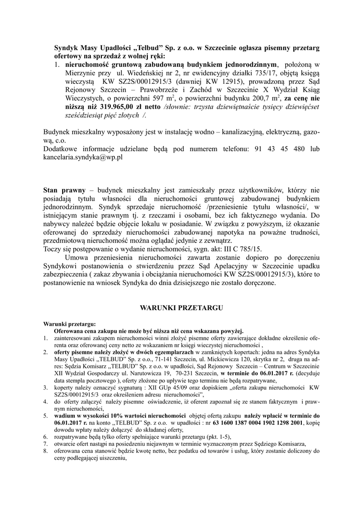 Syndyk Masy Upadłości ,,Telbud’’ Sp. z o.o. w Szczecinie ogłasza pisemny przetarg ofertowy na sprzedaż z wolnej ręki: 1. nieruchomość gruntową zabudowaną budynkiem jednorodzinnym, położoną w Mierzynie przy ul. Wiedeńskiej nr 2, nr ewidencyjny działki 735/17, objętą księgą wieczystą KW SZ2S/00012915/3 (dawniej KW 12915), prowadzoną przez Sąd Rejonowy Szczecin – Prawobrzeże i Zachód w Szczecinie X Wydział Ksiąg Wieczystych, o powierzchni 597 m2, o powierzchni budynku 200,7 m2, za cenę nie niższą niż 319.965,00 zł netto /słownie: trzysta dziewiętnaście tysięcy dziewięćset sześćdziesiąt pięć złotych /. Budynek mieszkalny wyposażony jest w instalację wodno – kanalizacyjną, elektryczną, gazową, c.o. Dodatkowe informacje udzielane będą pod numerem telefonu: 91 43 45 480 lub [email protected] Stan prawny – budynek mieszkalny jest zamieszkały przez użytkowników, którzy nie posiadają tytułu własności dla nieruchomości gruntowej zabudowanej budynkiem jednorodzinnym. Syndyk sprzedaje nieruchomość /przeniesienie tytułu własności/, w istniejącym stanie prawnym tj. z rzeczami i osobami, bez ich faktycznego wydania. Do nabywcy należeć będzie objęcie lokalu w posiadanie. W związku z powyższym, iż okazanie oferowanej do sprzedaży nieruchomości zabudowanej napotyka na poważne trudności, przedmiotową nieruchomość można oglądać jedynie z zewnątrz. Toczy się postępowanie o wydanie nieruchomości, sygn. akt: III C 785/15. Umowa przeniesienia nieruchomości zawarta zostanie dopiero po doręczeniu Syndykowi postanowienia o stwierdzeniu przez Sąd Apelacyjny w Szczecinie upadku zabezpieczenia ( zakaz zbywania i obciążania nieruchomości KW SZ2S/00012915/3), które to postanowienie na wniosek Syndyka do dnia dzisiejszego nie zostało doręczone. WARUNKI PRZETARGU Warunki przetargu: Oferowana cena zakupu nie może być niższa niż cena wskazana powyżej. 1. zainteresowani zakupem nieruchomości winni złożyć pisemne oferty zawierające dokładne określenie oferenta oraz oferowanej ceny netto ze wskazaniem nr księgi wieczystej nieruchomości , 2. oferty pisemne należy złożyć w dwóch egzemplarzach w zamkniętych kopertach: jedna na adres Syndyka Masy Upadłości ,,TELBUD” Sp. z o.o., 71-141 Szczecin, ul. Mickiewicza 120, skrytka nr 2, druga na adres: Sędzia Komisarz ,,TELBUD” Sp. z o.o. w upadłości, Sąd Rejonowy Szczecin – Centrum w Szczecinie XII Wydział Gospodarczy ul. Narutowicza 19, 70-231 Szczecin, w terminie do 06.01.2017 r. (decyduje data stempla pocztowego ), oferty złożone po upływie tego terminu nie będą rozpatrywane, 3. koperty należy oznaczyć sygnaturą : XII GUp 45/09 oraz dopiskiem „oferta zakupu nieruchomości KW SZ2S/00012915/3 oraz określeniem adresu nieruchomości”, 4. do oferty załączyć należy pisemne oświadczenie, iż oferent zapoznał się ze stanem faktycznym i prawnym nieruchomości, 5. wadium w wysokości 10% wartości nieruchomości objętej ofertą zakupu należy wpłacić w terminie do 06.01.2017 r. na konto ,,TELBUD” Sp. z o.o. w upadłości : nr 63 1600 1387 0004 1902 1298 2001, kopię dowodu wpłaty należy dołączyć do składanej oferty, 6. rozpatrywane będą tylko oferty spełniające warunki przetargu (pkt. 1-5), 7. otwarcie ofert nastąpi na posiedzeniu niejawnym w terminie wyznaczonym przez Sędziego Komisarza, 8. oferowana cena stanowić będzie kwotę netto, bez podatku od towarów i usług, który zostanie doliczony do ceny podlegającej uiszczeniu, 9. 10. 11. 12. 13. 14. 15. 16. 17. oferent, którego oferta została wybrana jest związany ofertą i jest zobowiązany do przystąpienia w terminie i miejscu wskazanym przez Syndyka do umowy przenoszącej własność nieruchomości. Wskazana przez Syndyka data nie będzie później niż 30 dnia od daty otwarcia ofert. Miejsce zostanie wskazane jako siedziba kancelarii notarialnej z terenu miasta Szczecin, oferent, którego oferta została wybrana jest zobowiązany wpłacić całą kwotę tytułem ceny, powiększoną o należny podatek VAT i pomniejszoną o wpłacone wadium, najpóźniej w dniu poprzedzającym zawarcie umowy przenoszącej własność nieruchomości, Syndyk zastrzega, iż zapłata musi nastąpić w formie pieniężnej, nie ma możliwości potrącenia z ceny przysługujących wierzytelności, wadium przepada na rzecz masy jeśli oferent, którego oferta została przyjęta uchyli się od zawarcia umowy sprzedaży w miejscu i dniu wskazanym przez sprzedającego. Wadium zaliczone zostanie w kwocie nominalnej na poczet ceny nabycia. Wadium zostanie zwrócone oferentom, których oferta nie została przyjęta w wartości nominalnej w terminie 7 dni od daty rozpatrzenia ofert, wszelkie koszty zawarcia umowy oraz wszelkie należności publicznoprawne związane z przeniesieniem własności ponosi Nabywca, Nabywca nie może żądać unieważnienia nabycia ani zmniejszenia ceny z powodu wad nieruchomości. Poprzez przystąpienie do przetargu oferent potwierdza, iż zapoznał się ze stanem prawnym i faktycznym nie ruchomości, zgodnie z art. 313 prawa upadłościowego i naprawczego sprzedaż dokonana w postępowaniu upadłościowym ma skutki sprzedaży egzekucyjnej. Sprzedaż nieruchomości powoduje wygaśnięcie praw oraz praw i roszczeń osobistych ujawnionych przez wpis do księgi wieczystej lub nieujawnionych w ten sposób, lecz zgłoszonych sędziemu-komisarzowi w terminie określonym w art. 51 ust. 1 pkt 5. Skutek ten powstaje z chwilą zawarcia umowy sprzedaży przy czym podstawą do wykreślenia praw, które wygasły na skutek sprzedaży, w tym hipotek obciążających przedmiotową nieruchomość jest prawomocny plan podziału sumy uzyskanej ze sprzedaży nieruchomości obciążonej, jeżeli nabywca nie przystąpi do umowy w miejscu i czasie ustalonym w pisemnym porozumieniu, a w przypadku braku takiego porozumienia w miejscu i czasie wskazanym przez Syndyka, Syndyk przestaje być zwi
