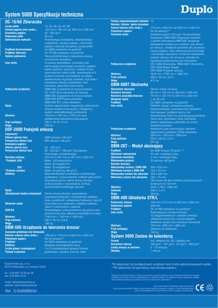 System 5000 Specyfikacja techniczna DC-10/60 Zbieraczka Liczba pó∏ek Format papieru (min./maks.) Gramatura papieru PojemnoÊç pó∏ki Automatyczne wykrycie Pr´dkoÊç broszurowania Pr´dkoÊç zbierania System podawania Inne cechy Pod∏àczone urzàdzenia Opcje Wymiary Pràd zasilajàcy Waga 10, 20, 30, 40, 50, 60 120 mm x 148 mm do 350 mm x 500 mm 40 - 300 g/m2 60 mm Podwójnego podawania, niew∏aÊciwego podawania, zaci´cia papieru, obecnoÊci papieru, blokady transportu, pustej pó∏ki do 5000 zestawów na godzin´* do 10 000 zestawów na godzin´* Pas podciÊnieniowy z separacjà arkuszy strumieniem powietrza 5-cyfrowy wyÊwietlacz; podwójny pas transmisyjny pionowego transportu papieru; wybór wyjÊcia z lewej lub z prawej strony; automatyczny wybór pó∏ki; realizowana w 4 krokach kontrola zachodzenia na siebie; wielokrokowa regulacja ustawieƒ; tryb bloku; wstawianie arkuszy przek∏adek; taca odrzutów; jednostka hand-marry DBM-500 Urzàdzenie do broszurowania DC-12JR Tylna równiarka do arkuszy DBM-300 Urzàdzenie do broszurowania DBM-400 STR Prawa uk∏adarka DBM-400 STL Lewa uk∏adarka System zapewniania integralnoÊç dokumentu (skaner kodów kreskowych), inteligentny system wielopa∏kowego podawania 740 mm x 750 mm x 1972 mm przy pod∏àczonej jednostce podnoszàcej 230 V; 50 Hz; 4,5 A 320 kg Pami´ç programowalnych ustawieƒ Naro˝ne / boczne / górne zszywanie Format arkusza (min./maks.) PojemnoÊç papieru Pozosta∏e cechy Pod∏àczane urzàdzenia Wymiary Pràd zasilania Waga Mechanizm obcinania Rozmiary broszury Rozmiary przyci´tej broszury Margines ci´cia Pr´dkoÊç Inne cechy Pod∏àczane urzàdzenia PojemnoÊç: G∏ówna (górna) taca Pomocnicza (dolna) taca Gramatura papieru: G∏ówna (górna) taca Pomocnicza (dolna) taca Wymiary Pràd zasilania Waga Rozmiary arkuszy *Pr´dkoÊç (A4) (A3) *GruboÊç zestawu Detekcja Opcje: Odczytywanie kodów kreskowych Âledzenie zadaƒ DCM Kit Wymiary Pràd zasilania Waga 60 - 130 g/m2 60 - 250 g/m2 (160 g/m2 dla papieru kredowego i powlekanego) 210 mm x 297 mm to 457 mm x 320 mm Maks. 150 arkuszy/min Maks. 60 ksià˝ek/min Maks. 52 ksià˝ek/min Maks. 25 arkuszy (80 g/m2) Nieprawid∏owego podawania; podwójnego podawania; rozpoznawanie znaków optycznych (Standard) górna i dolna strona arkusza; funkcja liczenia i sprawdzania; funkcja wyszukiwania ostatniego arkusza Górna strona arkusza; sprawdzanie poprawnej kolejnoÊci; kompletnoÊci zestawu; braku powtórzeƒ; wstawionych arkuszy z tacy B Automatyczne ustawianie z etykiety zadania; raport o zakoƒczeniu zadania, Rozdzielajàce no˝e powietrzne dla górnej oraz pomocniczej tacy, aktywna antystatyczna belka 1100 mm x 750 mm x 1020 mm 230 V; 50 Hz; 0,9 A 136 kg DBM-500 Urzàdzenie do tworzenia broszur Zszywanie grzbietowe oraz falcowanie Rozmiar arkusza (min./maks.) 120 mm x 170 mm to 350 mm x 500 mm PojemnoÊç papieru Do 25 arkuszy** Pr´dkoÊç do 5000 zestawów na godzin´* Detekcja Detekcja przeciàgni´cia drutu Liczba g∏owic zszywajàcych 1-4 (2 standardowo) g∏owice Hohner Pozycje zszywania grzbietowe, naro˝ne, boczne, brak Duplo Polska sp. z o.o. 02-574 Warszawa, ul. ¸owicka 19/U2 tel.: 0-22 845 70 23 do 26 fax: 0-22 845 70 27 email: [email protected] website: www.duplopolska.pl Ref: E-S5000BR/04 170 mm x 250 mm do 250 mm x 350 mm Do 30 arkuszy** Dotykowy panel LCD oraz 10-przyciskowa klawiatura; DBM-500T Regulacja ustawieƒ z panela sterowania DBM-500; akceptuje podawanie zestawu po zestawie oraz arkusz po arkuszu; dost´pne przeÊwity dla usuwania zaci´ç papieru; taca odbiorcza dla bocznego i naro˝nego zszywania; modu∏ do wstawiania luênych arkuszy do broszury; zewn´trzna regulacja przekoszenia przy falcowaniu DC-10/60 Zbieraczka, DBM-500T Obcinarka, DSF-2000 Sheet Feeder, DSF-2000 Podajnik arkuszy 1610 mm x 700 mm x 1005 mm 230 V; 50 Hz; 3,8 A 412 kg DBM-500T Obcinarka DSF-2000 Podajnik arkuszy 2000 arkuszy x 80 g/m2 600 arkuszy x 80 g/m2 12 Górne i dolne Êcinanie 85 mm x 120 mm to 250 mm x 350 mm 75 mm x 120 mm to 250 mm x 350 mm 1 do 25 mm Do 5000 zestawów na godzin´* Detektor zaci´ç; zamykane pokrywy bezpieczeƒstwa; automatycznie ustawiane rolki wysuwu; podajnik r´czny dla dokumentów, które nie potrzebujà przycinania (face trim); obcinanie / brak obcinania; sensor zape∏nienia pojemnika na Êcinki; Êciskanie grzbietu Wyd∏u˝ony pas transmisyjny; element wypychania pakietów, krótka uk∏adarka 584 mm x 700 mm x 1094 mm 230 V; 50 Hz; 3,3 A 241 kg DBM-2KT – Modu∏ obcinajàcy Pr´dkoÊç Obcinanie maksymalne Obcinanie minimalne Maksymalna gruboÊç Rozmiar broszury: Maksymalny rozmiar z DBM-500 Minimalny rozmiar z DBM-500 Maksymalny rozmiar bez obcinania Minimalny rozmiar bez obcinania Wymiary Zasilanie Waga do 4000 broszur A5/godz.** 25 mm z ka˝dego boku 2 mm z ka˝dego boku 50 arkuszy (80 g/m2) 356 x 250 mm 124 x 75 mm 356 x 250 mm 120 x 75 mm Obcinanie nie jest mo˝liwe przy broszurach krótszych ni˝ 124 mm 2540 x 750 x 1100 mm 200 V; 5.4 A 365 kg DBM-400 Uk∏adarka STR/L PojemnoÊç arkuszy PojemnoÊç papieru Pr´dkoÊç Inne cechy Wymiary Pràd zasilajàcy Waga 140 mm x 210 mm to 350 mm x 500 mm 430 mm Do 10 000 zestawów na godzin´* Automatyczna zmiana formatu; 12 programowalnych ustawieƒ pami´ci; uk∏adanie proste lub z przesuni´ciem; detektory zaci´ç oraz otwartych drzwiczek 750 mm x 880 mm x 890 mm Zasilanie ze zbieraczki 148 kg System 5000 Zestaw do kalendarzy Format Gramatura arkuszy Liczba arkuszy w zestawie Ok∏adka A4 / ok∏adka A3, A5 / ok∏adka A4 105 g/m2 - 157 g/m2; 157 g/m2 - 250 g/m2 3 - 12 arkuszy 1 arkusz *W zale˝noÊci od pod∏àczonych urzàdzeƒ oraz liczby wykorzystywanych pó∏ek. **W zale˝noÊci od gramatury oraz formatu papieru WydajnoÊç produkcji podana w oparciu o optymalne warunki dzia∏ania, mo˝e zmieniaç si´ zale˝nie od u˝ytego materia∏u oraz innych czynników wp∏ywajàcych na dzia∏anie systemu. W zwiàzku z naszym programem sta∏ego doskonalen