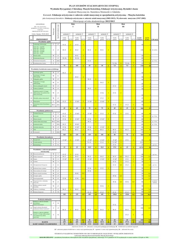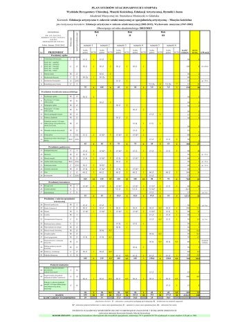 PLAN STUDIÓW STACJONARNYCH I STOPNIA Wydziału Dyrygentury Chóralnej, Muzyki Kościelnej, Edukacji Artystycznej, Rytmiki i Jazzu Akademii Muzycznej im. Stanisława Moniuszki w Gdańsku Kierunek: Edukacja artystyczna w zakresie sztuki muzycznej ze specjalnością artystyczną – Muzyka kościelna jako kontynuacja kierunków: Edukacja artystyczna w zakresie sztuki muzycznej (2002-2012), Wychowanie muzyczne (1947-2002) Obowiązuje od roku akademickiego 2012/2013 Uchw. Senatu: 29.03.2012 Rodzaj zajęć RW: 5.03 i 26.03.2012, KOREKTA 1.07.2013, 16.09.2013, 19.09.2016 OBOWIĄZUJE OD 19.09.2016 Sposób prowadzenia zajęć zatwierdzone: PRZEDMIOT Lp. Rok I semestr 1 liczba godzin Rok II semestr 2 semestr 3 ECTS liczba godzin ECTS liczba godzin Rok III semestr 4 ECTS liczba godzin semestr 5 ECTS liczba godzin semestr 6 ECTS liczba godzin ILOŚĆ ECTS GODZIN ECTS SUMA UWAGI Przedmioty ogólne 1 Technologie informacyjne C Z 15 Z 1 15 Z 1 2 Język obcy - angielski Język obcy - niemiecki Język obcy - francuski Język obcy - szwedzki Język obcy - włoski C Z 30 Z 2 30 Z 2 3 Historia sztuki W Z 30 E 4 Wychowanie fizyczne C Z 30 Zx 1 30 Zx 5 Seminarium licencjackie S Z/G 6 Konsultacje pracy licencj. C I 30 2 120 8 2 30 2 1 60 2 30 Z 15 Z 75 4 30 Z 2 105 6 45 2 30 E 2 1 3 30 2 15 1 7,5 Zx 4 7,5 Zx 7 15 11 7,5 4 7,5 7 270 26 30 2 30 2 30 2 30 2 15 2 30 2 30 3 do wyboru gr. 10 os. Przedmioty kształcenia nauczycielskiego 7 Psychologia ogólna W Z 8 Psychologia I i II etapu edukacyjnego W E 9 Pedagogika ogólna W Z 10 Pedagogika I i II etapu edukacyjnego W E 11 Historia pedagogiki muzyki W Z 12 Podstawy dydaktyki W Z 13 Dydaktyka muzyki I i II etapu edukacyjnego oraz podstawowej szkoły muzycznej W Z 15 K 1 14 Metodyka audycji muzycznych W Z 15 Z 1 15 15 Emisja głosu C I/G 15 K* 2 60 16 Interpretacja tekstu literackiego z dykcją W/C Z/G 30 Z 2 30 Z 2 30 Z 2 15 Z 30 Z 15 Z 2 15 K* 2 15 K* 2 2 2 15 E 2 15 Z 1 15 Z 2 30 1 8 3 45 4 45 4 75 6 75 6 45 5 15 2 300 27 15 K* 3 15 K* 3 15 Z 3 15 Z 3 15 E 3 90 18 30 2 60 8 30 2 gr. 10 os. 60 4 gr. 10 os. 60 8 360 18 Przedmioty podstawowe 17 Fortepian klasyczny C I 15 Z 3 18 Harmonia W Z 30 Z 2 19 Historia muzyki W Z 15 K 2 15 K* 2 20 Analiza dzieła muzycznego W/C Z/G 21 Kształcenie słuchu C Z/G 30 Z 2 30 K* 2 22 Literatura muzyczna W Z 15 K 2 15 K* 2 15 K 2 15 K* 2 23 Chór C Z 60 Z 3 60 Z 3 60 Z 3 60 Z 3 24 Kontrapunkt C Z/G 15 K 2 30 Z 2 15 K* 2 60 Z 3 15 Z 1 60 Z 3 15 1 165 14 135 12 135 12 105 10 90 7 75 6 705 61 15 K* 2 15 K* 3 15 K* 7,5 Z 3 1 15 K* 7,5 Z 3 1 15 K* 7,5 K* 2 3 15 E 3 90 22,5 16 5 15 Z 1 15 1 15 2 15 3 22,5 4 22,5 4 37,5 6 15 3 127,5 22 0,5 30 Z 1 30 180 2 5,5 12 gr. 10 os. Przedmioty kierunkowe 25 Dyrygowanie W I 26 Czytanie partytur C I 27 Instrumentacja C G gr. 2 os. Przedmioty z zakresu specjalności artystycznej 28 Harmonia praktyczna W I 29 Schola Cantorum I C Z 15 Z 30 Z 1 1 15 Z 30 Z 1 1 30 Z 1 30 Z 1 30 Z 30 Organy W I 15 K* 1 15 K* 1 15 K* 1 15 K* 2 15 K* 2 15 E 5 90 31 Carillon W I 15 Z 1 15 Z 1 30 2 32 Akompaniament liturgiczny C G 15 Z 0,5 15 Z 1 30 1,5 33 Realizacja basso continuo C I 30 2 34 Wprowadzenie do teologii W Z 35 Historia muzyki kościelnej W Z 36 Liturgika ogólna W Z 37 Chorał gregoriański W Z 38 Organoznawstwo z akustyką muzyczną W Z 39 Biblijne podstawy muzyki kościelnej W Z 40 Podstawy j. łacińskiego C Z 41 Praktyka liturgiczna C G 30 K 0,5 15 K 0,5 15 K 1 30 K 1 15 E 1 30 K 15 K 1 30 K 30 K 30 Z 1 30 Z 0,5 105 5 135 4,5 15 Z 105 0,5 4,5 15 Z 105 0,5 0,5 30 K 0,5 2 1 7 15 Z 150,0 1 15 Z 1 6 15 Z 120,0 30 1 30 0,5 30 0,5 30 1,5 60 1 30 2 60 1,5 1 60 3,5 9,5 720 36,5 Praktyki studenckie 42 Praktyka w zakresie metodyki prowadzenia audycji muzycznych C G 43 Zespół wokalny dla praktyk studenckich Schola Cantorum II C Z 44 Praktyka w zakresie dydaktyki muzyki I i II etapu edukacyjnego oraz podstawowej szkoły muzycznej C 30 Z 1 30 Z 0,5 30 Z 0,5 30 Z 1 30 Z 1 G RAZEM ILOŚĆ GODZIN TYGODNIOWO 30 435 29 1 30 30 465 31 0,5 30 30 412,5 27,5 0,5 30 30 367,5 24,5 1 30 45 375 25 2 30 30 Z 0,5 15 Z 2 45 277,5 18,5 2,5 30 15 1 180 4,5 15 2 210 2332,5 7,5 180 objaśnienia skrótów: Z – zaliczenie z oceną przez pedagoga prowadzącego, K – kolokwium na ostatnich zajęciach K*- zaliczenie poprzez kolokwium w czasie sesji egzaminacyjnej, E – egzamin w czasie sesji egzaminacyjnej, Zx – zaliczenie bez oceny STUDENTA W KAŻDYM Z SEMESTRÓW OD I DO VI OBOWIĄZUJE ZALICZENIE 3 WYKŁADÓW ZMIENNYCH (zaliczenia dokonuje Kierownik Katedry Muzyki Kościelnej) KOLOR ZIELONY - przedmioty kierunkowe obowiązkowe dla wszystkich specjalności, stanowiące 70 % punktów ECTS uzyskanych w czasie studiów (126 pkt ze 180) gr. 2 os. gr. 2 os. przedmiot ruchomy