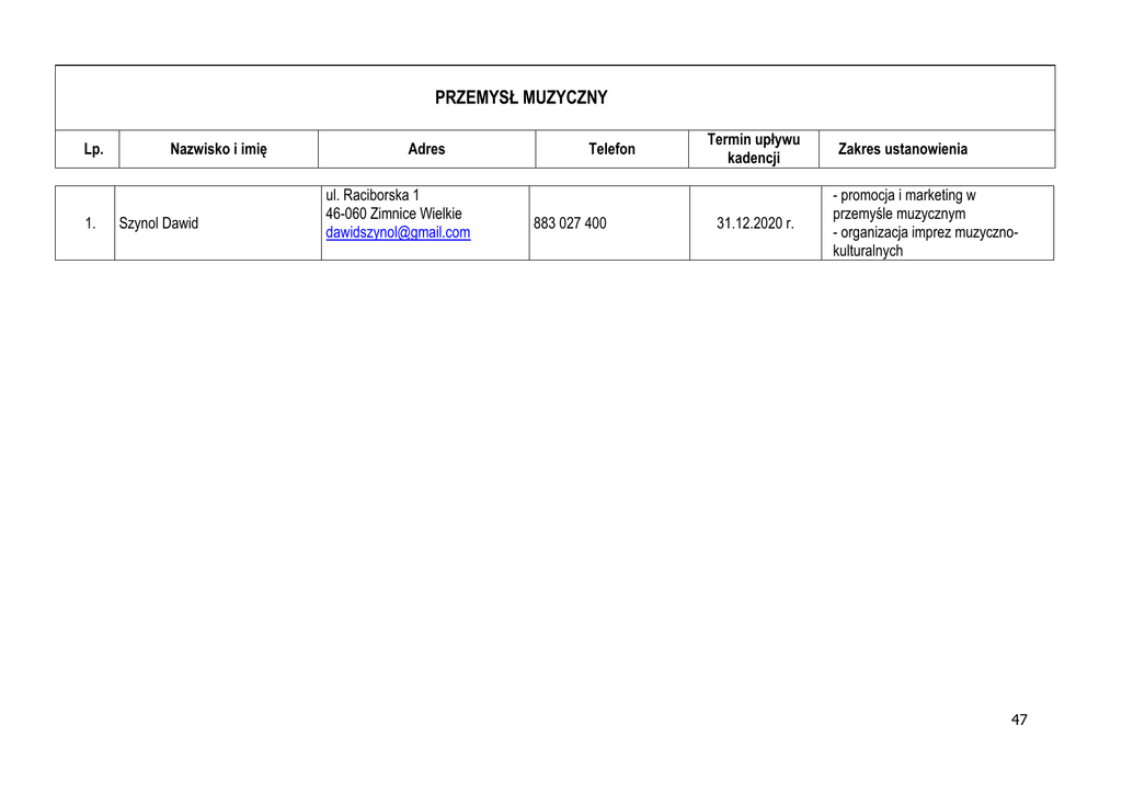 PRZEMYSŁ MUZYCZNY Lp. 1. Nazwisko i imię Szynol Dawid Adres ul. Raciborska 1 46-060 Zimnice Wielkie [email protected] Telefon 883 027 400 Termin upływu kadencji 31.12.2020 r. Zakres ustanowienia - promocja i marketing w przemyśle muzycznym - organizacja imprez muzycznokulturalnych 47