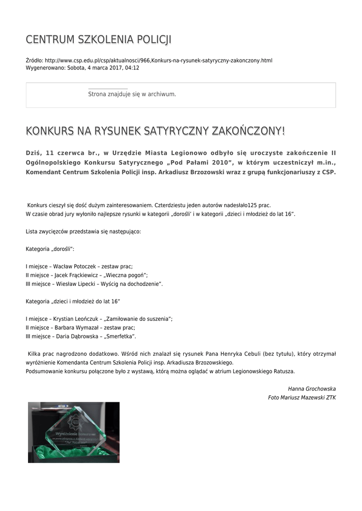 CENTRUM SZKOLENIA POLICJI Źródło: http://www.csp.edu.pl/csp/aktualnosci/966,Konkurs-na-rysunek-satyryczny-zakonczony.html Wygenerowano: Sobota, 4 marca 2017, 04:12 Strona znajduje się w archiwum. KONKURS NA RYSUNEK SATYRYCZNY ZAKOŃCZONY! Dziś, 11 czerwca br., w Urzędzie Miasta Legionowo odbyło się uroczyste zakończenie II Ogólnopolskiego Konkursu Satyrycznego „Pod Pałami 2010”, w którym uczestniczył m.in., Komendant Centrum Szkolenia Policji insp. Arkadiusz Brzozowski wraz z grupą funkcjonariuszy z CSP. Konkurs cieszył się dość dużym zainteresowaniem. Czterdziestu jeden autorów nadesłało125 prac. W czasie obrad jury wyłoniło najlepsze rysunki w kategorii „dorośli’ i w kategorii „dzieci i młodzież do lat 16”. Lista zwycięzców przedstawia się następująco: Kategoria „dorośli”: I miejsce – Wacław Potoczek – zestaw prac; II miejsce – Jacek Frąckiewicz – „Wieczna pogoń”; III miejsce – Wiesław Lipecki – Wyścig na dochodzenie”. Kategoria „dzieci i młodzież do lat 16” I miejsce – Krystian Leończuk – „Zamiłowanie do suszenia”; II miejsce – Barbara Wymazał – zestaw prac; III miejsce – Daria Dąbrowska – „Smerfetka”. Kilka prac nagrodzono dodatkowo. Wśród nich znalazł się rysunek Pana Henryka Cebuli (bez tytułu), który otrzymał wyróżnienie Komendanta Centrum Szkolenia Policji insp. Arkadiusza Brzozowskiego. Podsumowanie konkursu połączone było z wystawą, którą można oglądać w atrium Legionowskiego Ratusza. Hanna Grochowska Foto Mariusz Mazewski ZTK Ocena: 0/5 (0) Tweetnij