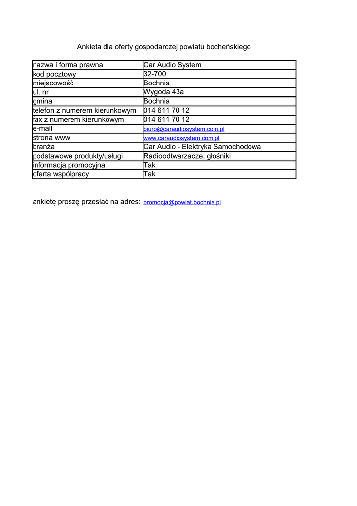 Ankieta dla oferty gospodarczej powiatu bocheńskiego nazwa i forma prawna kod pocztowy miejscowość ul. nr gmina telefon z numerem kierunkowym fax z numerem kierunkowym e-mail strona www branża podstawowe produkty/usługi informacja promocyjna oferta współpracy Car Audio System 32-700 Bochnia Wygoda 43a Bochnia 014 611 70 12 014 611 70 12 [email protected] www.caraudiosystem.com.pl Car Audio - Elektryka Samochodowa Radioodtwarzacze, głośniki Tak Tak ankietę proszę przesłać na adres: [email protected] Ankieta dla oferty gospodarczej powiatu oświęcimskiego nazwa i forma prawna kod pocztowy miejscowość ul. nr gmina telefon z numerem kierunkowym fax z numerem kierunkowym e-mail strona www branża podstawowe produkty/usługi informacja promocyjna oferta współpracy ankietę proszę przesłać na adres: "Fenix" PPHU Spółka Cywilna 32-650 Kęty Bulwarowa 8 Kęty (033)854-33-51 (033)854-33-52 [email protected] www.fenix.pl budowlana, transportowa materiały budowlne, usługi budowlne, transport materiałów budowlanych Firma oferuje szeroki asortyment materiałów budowlanych, świadczy usługi budowy domów "pod klucz" oraz wykonuje drobne i kompleksowe remonty budynków. Upusty dla stałych klientów. Posiadam 200 m wolnej powierzchni magazynowej. Poszukuję dostawców stolarki budowlanej. Zatrudnię 10 murarzy do pracy sezonowej [email protected]