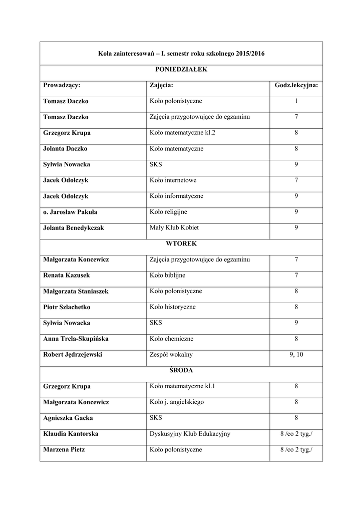 Koła zainteresowań – I. semestr roku szkolnego 2015/2016 PONIEDZIAŁEK Prowadzący: Zajęcia: Tomasz Daczko Koło polonistyczne 1 Tomasz Daczko Zajęcia przygotowujące do egzaminu 7 Grzegorz Krupa Koło matematyczne kl.2 8 Jolanta Daczko Koło matematyczne 8 Sylwia Nowacka SKS 9 Jacek Odolczyk Koło internetowe 7 Jacek Odolczyk Koło informatyczne 9 o. Jarosław Pakuła Koło religijne 9 Jolanta Benedykczak Mały Klub Kobiet 9 Godz.lekcyjna: WTOREK Małgorzata Koncewicz Zajęcia przygotowujące do egzaminu 7 Renata Kazusek Koło biblijne 7 Małgorzata Staniaszek Koło polonistyczne 8 Piotr Szlachetko Koło historyczne 8 Sylwia Nowacka SKS 9 Anna Trela-Skupińska Koło chemiczne 8 Robert Jędrzejewski Zespół wokalny 9, 10 ŚRODA Grzegorz Krupa Koło matematyczne kl.1 8 Małgorzata Koncewicz Koło j. angielskiego 8 Agnieszka Gacka SKS 8 Klaudia Kantorska Dyskusyjny Klub Edukacyjny 8 /co 2 tyg./ Marzena Pietz Koło polonistyczne 8 /co 2 tyg./ Joanna Pąk Koło biologiczne Robert Jędrzejewski Zespół wokalny Marcin Jabłoński SKS 9 Monika Miazgowska Koło matemtyczne 9 8 /co 2 tyg./ 9 CZWARTEK Tomasz Daczko Teatr SŁOWO 7-8 Bożena Bęzel Koło fizyczne 8 Renata Kazusek Koło biblijne 8 Piotr Szlachetko Koło z wos-u 8 Agnieszka Gacka SKS 9 Marcin Jabłoński SKS 9 PIĄTEK Zbigniew Biederka Koło filozoficzne 7 Klaudia Kantorska Zajęcia przygotowujące do konkursu 8 Anna Szczepanik Zajęcia przygotowujące do egzaminu 8 Hanna Turczyńska Koło geograficzne 8 Magdalena Andrzejewska Zajęcia przygotowujące do egzaminu 8 Krzysztof Haber Koło historyczne 8 Jolanta Benedykczak Mały Klub Kobiet 8
