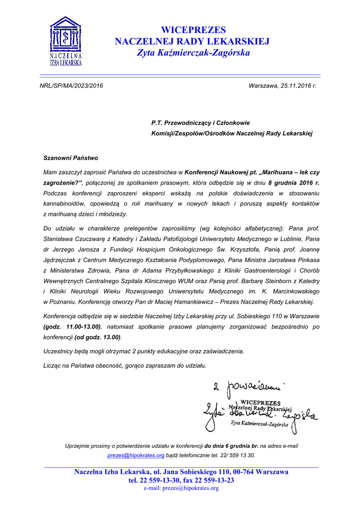 WICEPREZES NACZELNEJ RADY LEKARSKIEJ Zyta Kaźmierczak-Zagórska NRL/SP/MA/2023/2016 Warszawa, 25.11.2016 r. P.T. Przewodniczący i Członkowie Komisji/Zespołów/Ośrodków Naczelnej Rady Lekarskiej Szanowni Państwo Mam zaszczyt zaprosić Państwa do uczestnictwa w Konferencji Naukowej pt. „Marihuana – lek czy zagrożenie?”, połączonej ze spotkaniem prasowym, która odbędzie się w dniu 8 grudnia 2016 r. Podczas konferencji zaproszeni eksperci wskażą na polskie doświadczenia w stosowaniu kannabinoidów, opowiedzą o roli marihuany w nowych lekach i poruszą aspekty kontaktów z marihuaną dzieci i młodzieży. Do udziału w charakterze prelegentów zaprosiliśmy (wg kolejności alfabetycznej): Pana prof. Stanisława Czuczwarę z Katedry i Zakładu Patofizjologii Uniwersytetu Medycznego w Lublinie, Pana dr Jerzego Jarosza z Fundacji Hospicjum Onkologicznego Św. Krzysztofa, Panią prof. Joannę Jędrzejczak z Centrum Medycznego Kształcenia Podyplomowego, Pana Ministra Jarosława Pinkasa z Ministerstwa Zdrowia, Pana dr Adama Przybyłkowskiego z Kliniki Gastroenterologii i Chorób Wewnętrznych Centralnego Szpitala Klinicznego WUM oraz Panią prof. Barbarę Steinborn z Katedry i Kliniki Neurologii Wieku Rozwojowego Uniwersytetu Medycznego im. K. Marcinkowskiego w Poznaniu. Konferencję otworzy Pan dr Maciej Hamankiewicz – Prezes Naczelnej Rady Lekarskiej. Konferencja odbędzie się w siedzibie Naczelnej Izby Lekarskiej przy ul. Sobieskiego 110 w Warszawie (godz. 11.00-13.00), natomiast spotkanie prasowe planujemy zorganizować bezpośrednio po konferencji (od godz. 13.00). Uczestnicy będą mogli otrzymać 2 punkty edukacyjne oraz zaświadczenia. Licząc na Państwa obecność, gorąco zapraszam do udziału. Uprzejmie prosimy o potwierdzenie udziału w konferencji do dnia 6 grudnia br. na adres e-mail [email protected] bądź telefonicznie tel. 22/ 559 13 30. Naczelna Izba Lekarska, ul. Jana Sobieskiego 110, 00-764 Warszawa tel. 22 559-13-30, fax 22 559-13-23 e-mail: [email protected]