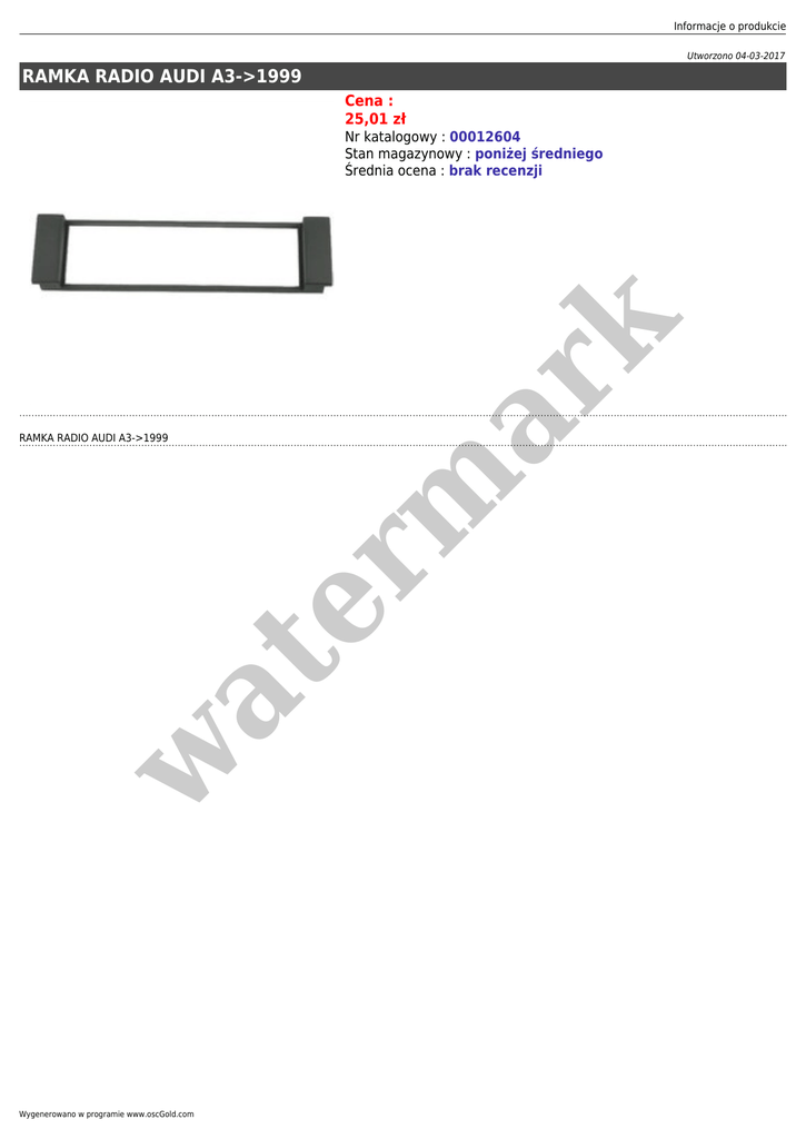 Informacje o produkcie Utworzono 04-03-2017 RAMKA RADIO AUDI A3->1999 Cena : 25,01 zł w at RAMKA RADIO AUDI A3->1999 er m ar k Nr katalogowy : 00012604 Stan magazynowy : poniżej średniego Średnia ocena : brak recenzji Wygenerowano w programie www.oscGold.com