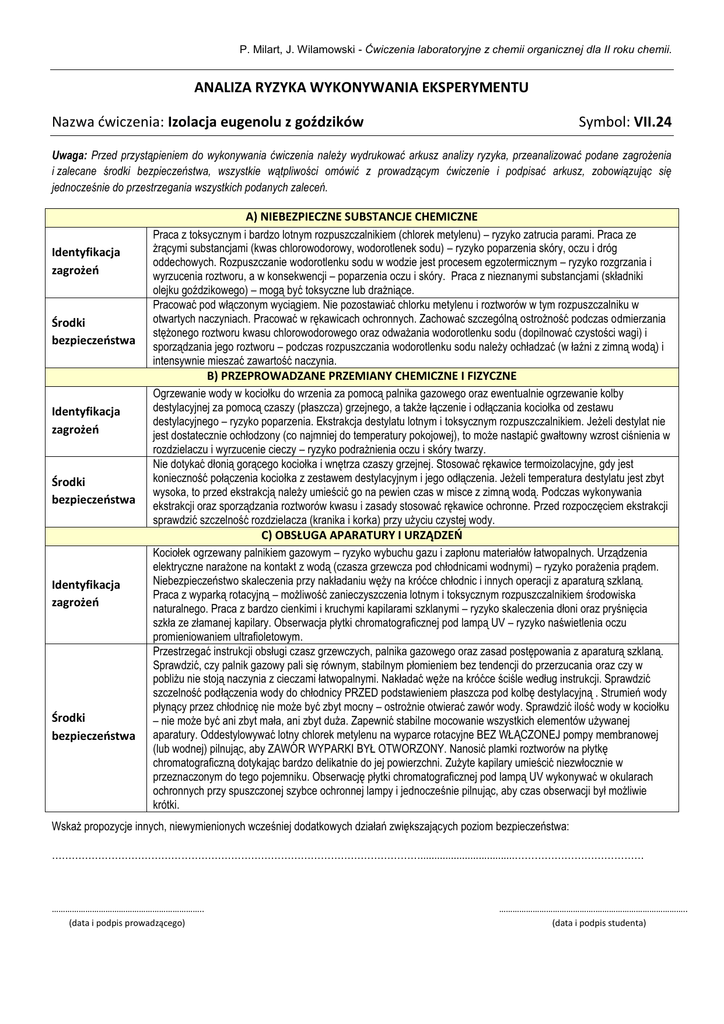 P. Milart, J. Wilamowski - Ćwiczenia laboratoryjne z chemii organicznej dla II roku chemii. ANALIZA RYZYKA WYKONYWANIA EKSPERYMENTU Nazwa ćwiczenia: Izolacja eugenolu z goździków Symbol: VII.24 Uwaga: Przed przystąpieniem do wykonywania ćwiczenia należy wydrukować arkusz analizy ryzyka, przeanalizować podane zagrożenia i zalecane środki bezpieczeństwa, wszystkie wątpliwości omówić z prowadzącym ćwiczenie i podpisać arkusz, zobowiązując się jednocześnie do przestrzegania wszystkich podanych zaleceń. A) NIEBEZPIECZNE SUBSTANCJE CHEMICZNE Identyfikacja zagrożeń Środki bezpieczeństwa Praca z toksycznym i bardzo lotnym rozpuszczalnikiem (chlorek metylenu) – ryzyko zatrucia parami. Praca ze żrącymi substancjami (kwas chlorowodorowy, wodorotlenek sodu) – ryzyko poparzenia skóry, oczu i dróg oddechowych. Rozpuszczanie wodorotlenku sodu w wodzie jest procesem egzotermicznym – ryzyko rozgrzania i wyrzucenia roztworu, a w konsekwencji – poparzenia oczu i skóry. Praca z nieznanymi substancjami (składniki olejku goździkowego) – mogą być toksyczne lub drażniące. Pracować pod włączonym wyciągiem. Nie pozostawiać chlorku metylenu i roztworów w tym rozpuszczalniku w otwartych naczyniach. Pracować w rękawicach ochronnych. Zachować szczególną ostrożność podczas odmierzania stężonego roztworu kwasu chlorowodorowego oraz odważania wodorotlenku sodu (dopilnować czystości wagi) i sporządzania jego roztworu – podczas rozpuszczania wodorotlenku sodu należy ochładzać (w łaźni z zimną wodą) i intensywnie mieszać zawartość naczynia. B) PRZEPROWADZANE PRZEMIANY CHEMICZNE I FIZYCZNE Identyfikacja zagrożeń Środki bezpieczeństwa Ogrzewanie wody w kociołku do wrzenia za pomocą palnika gazowego oraz ewentualnie ogrzewanie kolby destylacyjnej za pomocą czaszy (płaszcza) grzejnego, a także łączenie i odłączania kociołka od zestawu destylacyjnego – ryzyko poparzenia. Ekstrakcja destylatu lotnym i toksycznym rozpuszczalnikiem. Jeżeli destylat nie jest dostatecznie ochłodzony (co najmniej do temperatury pokojowej), to może nastąpić gwałtowny wzrost ciśnienia w rozdzielaczu i wyrzucenie cieczy – ryzyko podrażnienia oczu i skóry twarzy. Nie dotykać dłonią gorącego kociołka i wnętrza czaszy grzejnej. Stosować rękawice termoizolacyjne, gdy jest konieczność połączenia kociołka z zestawem destylacyjnym i jego odłączenia. Jeżeli temperatura destylatu jest zbyt wysoka, to przed ekstrakcją należy umieścić go na pewien czas w misce z zimną wodą. Podczas wykonywania ekstrakcji oraz sporządzania roztworów kwasu i zasady stosować rękawice ochronne. Przed rozpoczęciem ekstrakcji sprawdzić szczelność rozdzielacza (kranika i korka) przy użyciu czystej wody. C) OBSŁUGA APARATURY I URZĄDZEŃ Identyfikacja zagrożeń Środki bezpieczeństwa Kociołek ogrzewany palnikiem gazowym – ryzyko wybuchu gazu i zapłonu materiałów łatwopalnych. Urządzenia elektryczne narażone na kontakt z wodą (czasza grzewcza pod chłodnicami wodnymi) – ryzyko porażenia prądem. Niebezpieczeństwo skaleczenia przy nakładaniu węży na króćce chłodnic i innych operacji z aparaturą szklaną. Praca z wyparką rotacyjną – możliwość zanieczyszczenia lotnym i toksycznym rozpuszczalnikiem środowiska naturalnego. Praca z bardzo cienkimi i kruchymi kapilarami szklanymi – ryzyko skaleczenia dłoni oraz pryśnięcia szkła ze złamanej kapilary. Obserwacja płytki chromatograficznej pod lampą UV – ryzyko naświetlenia oczu promieniowaniem ultrafioletowym. Przestrzegać instrukcji obsługi czasz grzewczych, palnika gazowego oraz zasad postępowania z aparaturą szklaną. Sprawdzić, czy palnik gazowy pali się równym, stabilnym płomieniem bez tendencji do przerzucania oraz czy w pobliżu nie stoją naczynia z cieczami łatwopalnymi. Nakładać węże na króćce ściśle według instrukcji. Sprawdzić szczelność podłączenia wody do chłodnicy PRZED podstawieniem płaszcza pod kolbę destylacyjną . Strumień wody płynący przez chłodnicę nie może być zbyt mocny – ostrożnie otwierać zawór wody. Sprawdzić ilość wody w kociołku – nie może być ani zbyt mała, ani zbyt duża. Zapewnić stabilne mocowanie wszystkich elementów używanej aparatury. Oddestylowywać lotny chlorek metylenu na wyparce rotacyjne BEZ WŁĄCZONEJ pompy membranowej (lub wodnej) pilnując, aby ZAWÓR WYPARKI BYŁ OTWORZONY. Nanosić plamki roztworów na płytkę chromatograficzną dotykając bardzo delikatnie do jej powierzchni. Zużyte kapilary umieścić niezwłocznie w przeznaczonym do tego pojemniku. Obserwację płytki chromatograficznej pod lampą UV wykonywać w okularach ochronnych przy spuszczonej szybce ochronnej lampy i jednocześnie pilnując, aby czas obserwacji był możliwie krótki. Wskaż propozycje innych, niewymienionych wcześniej dodatkowych działań zwiększających poziom bezpieczeństwa: …………………………………………………………………………………………………..................................………………………………… ………………………………………………………….. (data i podpis prowadzącego) …………………………………….………………………………….. (data i podpis studenta)
