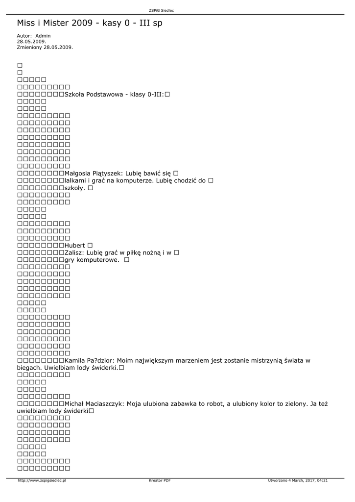 ZSPiG Siedlec Miss i Mister 2009 - kasy 0 - III sp Autor: Admin 28.05.2009. Zmieniony 28.05.2009. Szkoła Podstawowa - klasy 0-III: Małgosia Piątyszek: Lubię bawić się lalkami i grać na komputerze. Lubię chodzić do szkoły. Hubert Zalisz: Lubię grać w piłkę nożną i w gry komputerowe. Kamila Pa?dzior: Moim największym marzeniem jest zostanie mistrzynią świata w biegach. Uwielbiam lody świderki. Michał Maciaszczyk: Moja ulubiona zabawka to robot, a ulubiony kolor to zielony. Ja też uwielbiam lody świderki http://www.zspigsiedlec.pl Kreator PDF Utworzono 4 March, 2017, 04:21 ZSPiG Siedlec Martyna Kaczmarek: Jestem spod znaku Bli?niąt. Lubię się bawić, śmiać, je?dzić rowerem i wszystko, co ma kolor różowy. Adrian Birk: Lubię bawić się z kolegami, jestem niespokojnym duchem. Tym czasowo brak zdjęcia Julia Wawrzynowicz: Jestem Julka a I a, chyba każdy mnie tu zna. Jestem wesoła i kocham się śmiać. Staram się być samodzielna. Jestem osobą towarzyską, energiczną, szaloną, odważną, rzadko zamyka mi się buzia. Oto cała JA. Kamil Duda: Mam na imię Kamil. Mieszkam w Kiełkowie. Interesuję się motocyklami i lubię je?dzić na rowerze i łyżworolkach Sara Matysik: Sara to figlarka wesoła, lubi śpiewać, tańczyć i kręcić się dookoła. http://www.zspigsiedlec.pl Kreator PDF Utworzono 4 March, 2017, 04:21 ZSPiG Siedlec Mateusz Łukaszewski: Ten nasz Mateusz to taka dobra dusza, figle, psoty, nic go nie rusza. Klaudia Ratajczak: W leśnym ?ródle jeleń pije wodę, a Klaudia podziwia swoją urodę. Kacper Raczkowiak: Dębowe listeczki drzewa się trzymają, a w II a wszystkie dzieci Kacpra słuchają. Milena Błoszyk: Jest miła i radosna, uśmiechnięta jak Pani Wiosna. Filip Swat: Bardzo zdolny jest, zrobi wszystko, czego chcesz. http://www.zspigsiedlec.pl Kreator PDF Utworzono 4 March, 2017, 04:21 ZSPiG Siedlec Maja Stachowiak: Maja to dziewczynka przebojowa, do zwycięstwa dziś gotowa, więc głosujcie na nią licznie, dziękujemy za to ślicznie. Kamil Sip: To chłopak wyborowy, od stóp do czubka głowy. Przez wszystkich lubiany, MISTEREM ma być wybrany. Julia Ry?lewicz: Nasza Julia cud dziewczyna, piękna, zgrabna i powabna. Głosuj na nią, a będziesz zdrów. Hubert Wawrzkiewicz: Hubert chłopak miód, z IIIa jest ten cud. Ola Przybyła: Nasza Ola kochana buzię ma uśmiechniętą od rana. Z modą jest za pan brat. To klasy III b kwiat. Michał Lewandowski: Cała III b zgadza się z tym, że we wszystkim wiedzie prym! Nie ma fochów i humorów, nie brakuje mu wigoru! W piłkę nożną świetnie gra wielu kolegów ma. http://www.zspigsiedlec.pl Kreator PDF Utworzono 4 March, 2017, 04:21 ZSPiG Siedlec Julia Michalska: Julkę chłopcy uwielbiają, ukradkiem uśmiechy jej posyłają. Ona oczkami na chłopców niewinnie spoziera i czasem nosek do góry zadziera. Damian Rurkowski: Z Damiana to niezły gagatek& Na boisku celnie strzela gole, w dodatku najładniejszy jest w szkole. Wiecznie głosem i uśmiechem dziewczyny czaruje, lecz gdy o nich się mówi - zaraz się denerwuje. - Kandydaci - gimnazjum - Kandydaci IV - VI sp http://www.zspigsiedlec.pl Kreator PDF Utworzono 4 March, 2017, 04:21