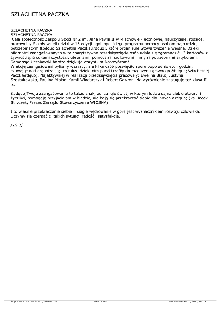 Zespół Szkół Nr 2 im. Jana Pawła II w Miechowie SZLACHETNA PACZKA SZLACHETNA PACZKA SZLACHETNA PACZKA Cała społeczność Zespołu Szkół Nr 2 im. Jana Pawła II w Miechowie - uczniowie, nauczyciele, rodzice, pracownicy Szkoły wzięli udział w 13 edycji ogólnopolskiego programu pomocy osobom najbardziej potrzebującym „Szlachetna Paczka”, które organizuje Stowarzyszenie Wiosna. Dzięki ofiarności zaangażowanych w to charytatywne przedsięwzięcie osób udało się zgromadzić 13 kartonów z żywnością, środkami czystości, ubraniami, pomocami naukowymi i innymi potrzebnymi artykułami. Samorząd Uczniowski bardzo dziękuje wszystkim Darczyńcom! W akcję zaangażowani byliśmy wszyscy, ale kilka osób poświęciło sporo popołudniowych godzin, czuwając nad organizacją; to także dzięki nim paczki trafiły do magazynu głównego „Szlachetnej Paczki”. Najaktywniej w realizacji przedsięwzięcia pracowały: Ewelina Błaut, Justyna Szostakowska, Paulina Misior, Kamil Włodarczyk i Robert Gawron. Na wyróżnienie zasługuje też klasa II ts. „Twoje zaangażowanie to także znak, że istnieje świat, w którym ludzie są na siebie otwarci i życzliwi, pomagają przyjaciołom w biedzie, nie boją się przekraczać siebie dla innych.” (ks. Jacek Stryczek, Prezes Zarządu Stowarzyszenie WIOSNA) I to właśnie przekraczanie siebie i ciągłe wędrowanie w górę jest wyznacznikiem rozwoju człowieka. Uczymy się czerpać z takich sytuacji radość i satysfakcję. /ZS 2/ http://www.zs2.miechow.pl/zs2miechow Kreator PDF Utworzono 4 March, 2017, 02:15