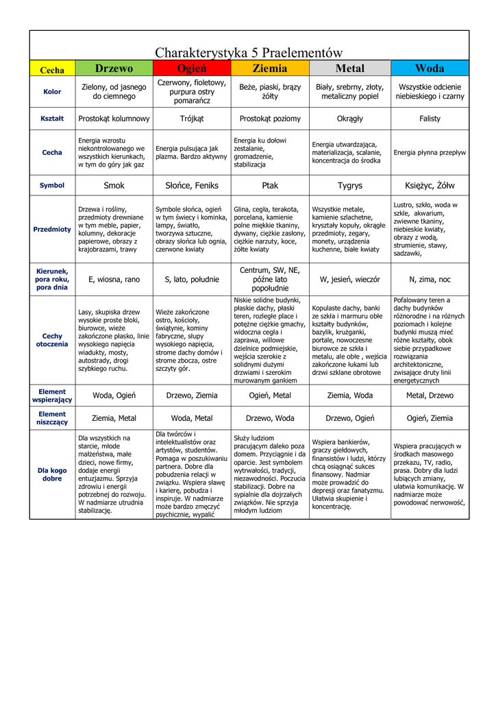 Charakterystyka 5 Praelementów Cecha Drzewo Ogień Ziemia Metal Woda Kolor Zielony, od jasnego do ciemnego Czerwony, fioletowy, purpura ostry pomarańcz Beże, piaski, brązy żółty Biały, srebrny, złoty, metaliczny popiel Wszystkie odcienie niebieskiego i czarny Kształt Prostokąt kolumnowy Trójkąt Prostokąt poziomy Okrągły Falisty Cecha Energia wzrostu niekontrolowanego we wszystkich kierunkach, w tym do góry jak gaz Symbol Przedmioty Kierunek, pora roku, pora dnia Smok Drzewa i rośliny, przedmioty drewniane w tym meble, papier, kolumny, dekoracje papierowe, obrazy z krajobrazami, trawy E, wiosna, rano Energia pulsująca jak plazma. Bardzo aktywny Energia ku dołowi zestalanie, gromadzenie, stabilizacja Energia utwardzająca, materializacja, scalanie, koncentracja do środka Energia płynna przepływ Słońce, Feniks Ptak Tygrys Symbole słońca, ogień w tym świecy i kominka, lampy, światło, tworzywa sztuczne, obrazy słońca lub ognia, czerwone kwiaty Glina, cegła, terakota, porcelana, kamienie polne miękkie tkaniny, dywany, ciężkie zasłony, ciężkie narzuty, koce, żółte kwiaty Wszystkie metale, kamienie szlachetne, kryształy kopuły, okrągłe przedmioty, zegary, monety, urządzenia kuchenne, białe kwiaty S, lato, południe Centrum, SW, NE, późne lato popołudnie W, jesień, wieczór N, zima, noc Niskie solidne budynki, płaskie dachy, płaski teren, rozległe place i potężne ciężkie gmachy, widoczna cegła i zaprawa, willowe dzielnice podmiejskie, wejścia szerokie z solidnymi dużymi drzwiami i szerokim murowanym gankiem Kopulaste dachy, banki ze szkła i marmuru obłe kształty budynków, bazylik, krużganki, portale, nowoczesne biurowce ze szkła i metalu, ale obłe , wejścia zakończone łukami lub drzwi szklane obrotowe Pofalowany teren a dachy budynków różnorodne i na różnych poziomach i kolejne budynki muszą mieć różne kształty, obok siebie przypadkowe rozwiązania architektoniczne, zwisające druty linii energetycznych Wieże zakończone ostro, kościoły, świątynie, kominy fabryczne, słupy wysokiego napięcia, strome dachy domów i strome zbocza, ostre szczyty gór. Księżyc, Żółw Lustro, szkło, woda w szkle, akwarium, zwiewne tkaniny, niebieskie kwiaty, obrazy z wodą, strumienie, stawy, sadzawki, Cechy otoczenia Lasy, skupiska drzew wysokie proste bloki, biurowce, wieże zakończone płasko, linie wysokiego napięcia wiadukty, mosty, autostrady, drogi szybkiego ruchu. Element wspierający Woda, Ogień Drzewo, Ziemia Ogień, Metal Ziemia, Woda Metal, Drzewo Element niszczący Ziemia, Metal Woda, Metal Drzewo, Woda Drzewo, Ogień Ogień, Ziemia Dla kogo dobre Dla wszystkich na starcie, młode małżeństwa, małe dzieci, nowe firmy, dodaje energii entuzjazmu. Sprzyja zdrowiu i energii potrzebnej do rozwoju. W nadmiarze utrudnia stabilizację. Dla twórców i intelektualistów oraz artystów, studentów. Pomaga w poszukiwaniu partnera. Dobre dla pobudzenia relacji w związku. Wspiera sławę i karierę, pobudza i inspiruje. W nadmiarze może bardzo zmęczyć psychicznie, wypalić Służy ludziom pracującym daleko poza domem. Przyciągnie i da oparcie. Jest symbolem wytrwałości, tradycji, niezawodności. Poczucia stabilizacji. Dobre na sypialnie dla dojrzałych związków. Nie sprzyja młodym ludziom Wspiera bankierów, graczy giełdowych, finansistów i ludzi, którzy chcą osiągnąć sukces finansowy. Nadmiar może prowadzić do depresji oraz fanatyzmu. Ułatwia skupienie i koncentrację. Wspiera pracujących w środkach masowego przekazu, TV, radio, prasa. Dobry dla ludzi lubiących zmiany, ułatwia komunikację. W nadmiarze może powodować nerwowość,