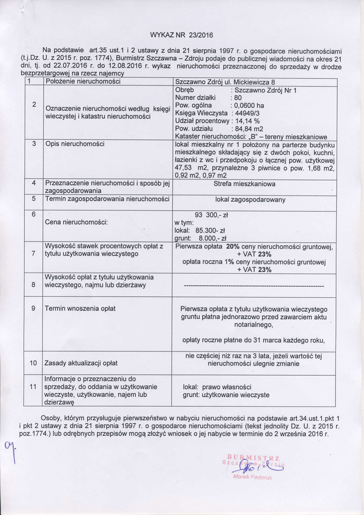 WYKAZ NR 2312016 Na podstawie ad.35 ust'1 i 2 ustawyz dnia 21 sierpnia'1997r' o gospodarcenieruchomościami (t'j.Dz.U. z 2015 |' poz. ,|774)'Burmist|zszczawna- zdrojupodajedo pub|icznej wiadomości na okres2'l dni' t!' od 22.07.2016|' do 12'08'2016r. Wykaz nieruchomości pŻeznaczonejdo spŻedażyw drodze na tzecz 1 Położenie nieruchomości szczawnozdróju|.Mickiewicza 8 obręb : szczawnozdroj Nr'l Numerdziałki : 80 PoW.ogó|na :0,0600ha oznaczenienieruchomości Wedługksięgi Księga Wieczysta : 44949/3 wieczysteji katastrunieruchomości Udziałprocenlory ..14,14 o/o PoW'udzjału :84'84 m2 -terenv mieszkaniowe Katasternieruchomości|..B,' 3 opis nieruchomości położony |oka|mieszka|nynr 1 na pańeze budynku mieszkalnegoskładajqcysię z dwóch pokoi,kuchni' łazienkiz Wc i przedpokojuo łącznejpow. użytkowej 47,53 m2, pŻyna|eżne3 piwniceo pow. 1'68 m2' O,g2m2,0,97m2 4 Pzeznaczenie nieruchomości i sposóbjej Strefamieszkaniowa zaoospodarowania 5 Terminzagospodarowania nieruchomości lokalzagospodarowany cena nieruchomościI 7 Wysokość stawekprocentowych opłatz tytułuużytkowania Wieczystego I Wysokośó opłat z tytułu uŹytkowania Wieczystego' najmulubdzieżawy 9 Terminwnoszeniaopłat 93 300'-zł w tym: |oka|:85.300-zł qrunt: 8'0o0.-zł Pierwszaopłata20%ceny nieruchomości gruntowej, + vAr 230/r opłataroczna1yoceny nieruchomości gruntowej +vAT 23% Pierwszaopłataz tytułuużytkowania Wieczystego jednorazowopzed zawarciemaKu gruntupłatna notarialnego, opłatyrocznepłatnedo 31 marcakażdegoroku' 1 0 zasady aktuaIizacji opłat Informacje o pŻeznaczeniudo 1 1 spŻedaży,do oddanjaW użytkowanie Wieczyste,użytkowanie, najemIub dzierżawe nie częściej niżraz na 3 lata'jeże|iwańośótej nieruchomości u|egniezmianie |okal:prawoWłasności grunt|użytkowanie wieczyste osoby' którympzysługujepieMszeństwow nabyciunieruchomości na podstawieart.34'ust.1.pkt1 i pkt 2 ustawyz dnia 21 sierpnia1997 r' o gospodarcenieruchomościami (tekstjedno|ityDz' U' z2015 r. poz.1774.)|ubodrębnychpŻepisóWmogązłożyć Wnioseko jej nabycięw terminiedo 2 Września 2016r.