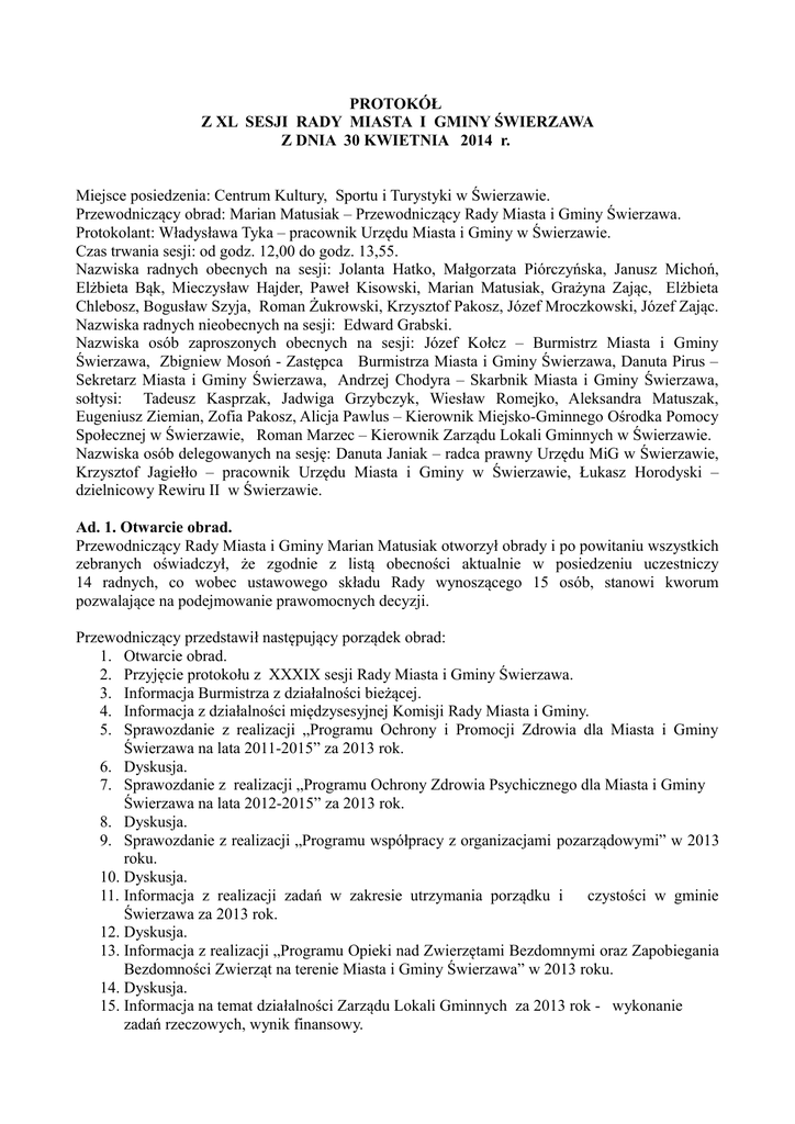 PROTOKÓŁ Z XL SESJI RADY MIASTA I GMINY ŚWIERZAWA Z DNIA 30 KWIETNIA 2014 r. Miejsce posiedzenia: Centrum Kultury, Sportu i Turystyki w Świerzawie. Przewodniczący obrad: Marian Matusiak – Przewodniczący Rady Miasta i Gminy Świerzawa. Protokolant: Władysława Tyka – pracownik Urzędu Miasta i Gminy w Świerzawie. Czas trwania sesji: od godz. 12,00 do godz. 13,55. Nazwiska radnych obecnych na sesji: Jolanta Hatko, Małgorzata Piórczyńska, Janusz Michoń, Elżbieta Bąk, Mieczysław Hajder, Paweł Kisowski, Marian Matusiak, Grażyna Zając, Elżbieta Chlebosz, Bogusław Szyja, Roman Żukrowski, Krzysztof Pakosz, Józef Mroczkowski, Józef Zając. Nazwiska radnych nieobecnych na sesji: Edward Grabski. Nazwiska osób zaproszonych obecnych na sesji: Józef Kołcz – Burmistrz Miasta i Gminy Świerzawa, Zbigniew Mosoń - Zastępca Burmistrza Miasta i Gminy Świerzawa, Danuta Pirus – Sekretarz Miasta i Gminy Świerzawa, Andrzej Chodyra – Skarbnik Miasta i Gminy Świerzawa, sołtysi: Tadeusz Kasprzak, Jadwiga Grzybczyk, Wiesław Romejko, Aleksandra Matuszak, Eugeniusz Ziemian, Zofia Pakosz, Alicja Pawlus – Kierownik Miejsko-Gminnego Ośrodka Pomocy Społecznej w Świerzawie, Roman Marzec – Kierownik Zarządu Lokali Gminnych w Świerzawie. Nazwiska osób delegowanych na sesję: Danuta Janiak – radca prawny Urzędu MiG w Świerzawie, Krzysztof Jagiełło – pracownik Urzędu Miasta i Gminy w Świerzawie, Łukasz Horodyski – dzielnicowy Rewiru II w Świerzawie. Ad. 1. Otwarcie obrad. Przewodniczący Rady Miasta i Gminy Marian Matusiak otworzył obrady i po powitaniu wszystkich zebranych oświadczył, że zgodnie z listą obecności aktualnie w posiedzeniu uczestniczy 14 radnych, co wobec ustawowego składu Rady wynoszącego 15 osób, stanowi kworum pozwalające na podejmowanie prawomocnych decyzji. Przewodniczący przedstawił następujący porządek obrad: 1. Otwarcie obrad. 2. Przyjęcie protokołu z XXXIX sesji Rady Miasta i Gminy Świerzawa. 3. Informacja Burmistrza z działalności bieżącej. 4. Informacja z działalności międzysesyjnej Komisji Rady Miasta i Gminy. 5. Sprawozdanie z realizacji „Programu Ochrony i Promocji Zdrowia dla Miasta i Gminy Świerzawa na lata 2011-2015” za 2013 rok. 6. Dyskusja. 7. Sprawozdanie z realizacji „Programu Ochrony Zdrowia Psychicznego dla Miasta i Gminy Świerzawa na lata 2012-2015” za 2013 rok. 8. Dyskusja. 9. Sprawozdanie z realizacji „Programu współpracy z organizacjami pozarządowymi” w 2013 roku. 10. Dyskusja. 11. Informacja z realizacji zadań w zakresie utrzymania porządku i czystości w gminie Świerzawa za 2013 rok. 12. Dyskusja. 13. Informacja z realizacji „Programu Opieki nad Zwierzętami Bezdomnymi oraz Zapobiegania Bezdomności Zwierząt na terenie Miasta i Gminy Świerzawa” w 2013 roku. 14. Dyskusja. 15. Informacja na temat działalności Zarządu Lokali Gminnych za 2013 rok - wykonanie zadań rzeczowych, wynik finansowy. - 2 16. Dyskusja. 17. Przedstawienie projektów uchwał, dyskusja i podjęcie uchwał: 1) nr 194 w sprawie przyjęcia „Oceny zasobów pomocy społecznej za rok 2013 dla miasta i gminy Świerzawa”, 2) nr 195 w sprawie zmian w budżecie na 2014 rok. 18. Interpelacje i zapytania radnych. 19. Odpowiedzi na interpelacje. 20. Wolne wnioski. 21. Sprawy różne. 22. Zamknięcie sesji. Nikt nie zgłosił uwag do przedstawionego porządku obrad. Przewodniczący zgłosił wniosek, aby po pkt. 3 „Informacja Burmistrza z działalności bieżącej” udzielić głosu członkowi Zarządu Województwa Dolnośląskiego p. Włodzimierzowi Chleboszowi oraz dyrektorowi Wydziału Obszarów Wiejskich w Urzędzie Marszałkowskim p. Pawłowi Czyszczoniowi. Nikt z radnych nie zgłosił sprzeciwu do tego wniosku, w związku z czym Przewodniczący Rady poinformował, że porządek obrad został przyjęty przez aklamację. Ad. 2. Przyjęcie protokołu z XXXIX sesji Rady Miasta i Gminy Świerzawa. Nikt z radnych nie zgłosił uwag do protokołu. W głosowaniu: za – 14, przeciw – 0, wstrzymujących się – 0 radnych protokół został przyjęty. Ad 3. Informacja Burmistrza z działalności bieżącej. Burmistrz J. Kołcz przedstawił informację z działalności bieżącej (załącznik nr 1). Nikt z radnych nie zabierał głosu w dyskusji nad informacją Burmistrza. Przewodniczący Rady MiG poprosił o zabranie głosu członka Zarządu Województwa Dolnośląskiego p. Włodzimierza Chlebosz. W. Chlebosz podziękował za zaproszenie na sesję Rady Miasta i Gminy Świerzawa, a następnie wręczył Burmistrzowi MiG umowę na przekazanie gminie Świerzawa kwoty 1 mln 130 tysięcy złotych z przeznaczeniem na budowę II etapu kanalizacji dla wsi Stara Kraśnica. W. Chlebosz podkreślił, że na tle całego województwa dolnośląskiego, gmina Świerzawa postrzegana jest jako gmina aktywna, a jej mieszkańcy zaangażowani w życie społeczne swoich miejscowości. Starania władz gminy Świerzawa o pozyskanie funduszy zewnętrznych na różne inwestycje, przynoszą wymierne efekty. W ciągu ostatnich lat, poza innymi programami, gmina pozyskała m.in. 3 mln złotych z Programu Rozwoju Obszarów Wiejskich. W. Chlebosz zadeklarował, że będzie czynił starania w Dolnośląskim Zarządzie Urządzeń i Melioracji Wodnych o jak najszybsze usuniecie szkód wywołanych ostatnimi dużymi opadami deszczu w Dobkowie. Uszkodzeniu uległo tam około trzech kilometrów drogi. W. Chlebosz wyraził Burmistrzowi MiG uznanie za przedstawienie bardzo dokładnej i szczegółowej informacji z działalności Burmistrza w okresie miedzysesyjnym. Dyrektor Wydziału Obszarów Wiejskich w Urzędzie Marszałkowskim Paweł Czyszczoń poinformował, że przyszła perspektywa finansowa na lata 2014-2020 na PROW jest nieco gorsza od poprzedniej i przeznacza mniej środków finansowych na wsparcie inwestycji gminnych. Nie oznacza to jednak, że gminy nie będą miały możliwości uzyskania funduszy. W ramach RPO zostały zabezpiecz