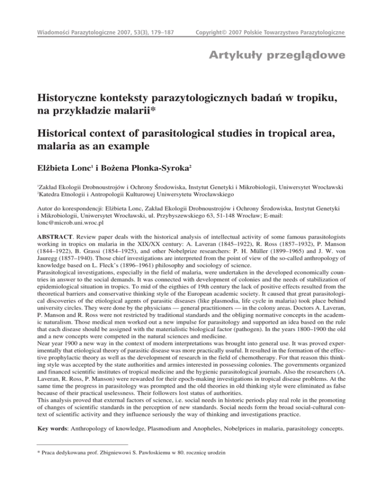 Wiadomoœci Parazytologiczne 2007, 53(3), 179–187 Copyright© 2007 Polskie Towarzystwo Parazytologiczne Artykuły przeglądowe Historyczne konteksty parazytologicznych badań w tropiku, na przykładzie malarii* Historical context of parasitological studies in tropical area, malaria as an example Elżbieta Lonc1 i Bożena Płonka−Syroka2 Zakład Ekologii Drobnoustrojów i Ochrony Środowiska, Instytut Genetyki i Mikrobiologii, Uniwersytet Wrocławski Katedra Etnologii i Antropologii Kulturowej Uniwersytetu Wrocławskiego 1 2 Autor do korespondencji: Elżbieta Lonc, Zakład Ekologii Drobnoustrojów i Ochrony Środowiska, Instytut Genetyki i Mikrobiologii, Uniwersytet Wrocławski, ul. Przybyszewskiego 63, 51−148 Wrocław; E−mail: [email protected] ABSTRACT. Review paper deals with the historical analysis of intellectual activity of some famous parasitologists working in tropics on malaria in the XIX/XX century: A. Laveran (1845–1922), R. Ross (1857–1932), P. Manson (1844–1922), B. Grassi (1854–1925), and other Nobelprize researchers: P. H. Müller (1899–1965) and J. W. von Jauregg (1857–1940). Those chief investigations are interpreted from the point of view of the so−called anthropology of knowledge based on L. Fleck's (1896–1961) philosophy and sociology of science. Parasitological investigations, especially in the field of malaria, were undertaken in the developed economically countries in answer to the social demands. It was connected with development of colonies and the needs of stabilization of epidemiological situation in tropics. To mid of the eigthies of 19th century the lack of positive effects resulted from the theoretical barriers and conservative thinking style of the European academic society. It caused that great parasitological discoveries of the etiological agents of parasitic diseases (like plasmodia, life cycle in malaria) took place behind university circles. They were done by the physicians — general practitioners — in the colony areas. Doctors A. Laveran, P. Manson and R. Ross were not restricted by traditional standards and the obliging normative concepts in the academic naturalism. Those medical men worked out a new impulse for parasitology and supported an idea based on the rule that each disease should be assigned with the materialistic biological factor (pathogen). In the years 1800–1900 the old and a new concepts were competed in the natural sciences and medicine. Near year 1900 a new way in the context of modern interpretations was brought into general use. It was proved experimentally that etiological theory of parasitic disease was more practically usuful. It resulted in the formation of the effective prophylactic theory as well as the development of research in the field of chemotherapy. For that reason this thinking style was accepted by the state authorities and armies interested in possessing colonies. The governments organized and financed scientific institutes of tropical medicine and the hygienic parasitological journals. Also the researchers (A. Laveran, R. Ross, P. Manson) were rewarded for their epoch−making investigations in tropical disease problems. At the same time the progress in parasitology was prompted and the old theories in old thinking style were eliminated as false because of their practical uselessness. Their followers lost status of authorities. This analysis proved that external factors of science, i.e. social needs in historic periods play real role in the promoting of changes of scientific standards in the perception of new standards. Social needs form the broad social−cultural context of scientific activity and they influence seriously the way of thinking and investigations practice. Key words: Anthropology of knowledge, Plasmodium and Anopheles, Nobelprices in malaria, parasitology concepts. * Praca dedykowana prof. Zbigniewowi S. Pawłoskiemu w 80. rocznicę urodzin 180 Wprowadzenie U podstaw wielkich odkryć parazytologicznych, podobnie jak geograficznych i innych przyrodniczych, czyli u źródeł współczesnej wiedzy biologicznej [1], leży przesłanie Franciszka Bacona, który w 1585 r. napisał, „że nie powinniśmy wyobrażać sobie ani przypuszczać, ale odkrywać, co natura czyni, lub zmuszona, uczynić może”. To postrenesansowe przesłanie zapoczątkowało w Europie na przełomie XVI i XVII w. epokę modernizacji nauk przyrodniczych [2]. Akceptacja w europejskim przyrodoznawstwie empirycznego standardu interpretacyjnego, spowodowała ukierunkowanie badań biologicznych, w tym parazytologicznych, na tworzenie systemu opartego na faktach, czyli wiedzy pozytywnej [3]. Postulowana przez F. Bacona wielka odnowa nauk była w opozycji do średniowiecznego ideału poznania kontemplacyjnego, polegającego na poszukiwaniu prawdy poprzez wnikanie w istotę rzeczy [4]. Nowe reguły metodologiczne miały na celu stworzenie nauki, w której „prawda poznania zostanie sprzężona ze swobodą działania” [5]. Historycy nauki nowożytnej podkreślają, że odtąd nauka miała spełniać nie tylko funkcje poznawcze, dostarczając ludziom wiedzy o otaczającym świecie i o ich własnej naturze, ale przede wszystkim wiedzy, która pozwoli im zapanować nad światem i dostosować go do ludzkich potrzeb. W przypadku parazytologii rozwój ten związany był w dużej mierze z postępami w medycynie tropikalnej, której naukowy i praktyczny rozwój stymulowany był z kolei podbojami kolonialnymi i pilną potrzebą zabezpieczenia w tropikach ochrony zdrowia przede wszystkim kolonizatorów [6]. Chodziło głównie o pokonanie śmiertelnej dla europejskich przybyszów „gorączki tropików”, czyli malarii. Słowo to pochodzi od włoskiego mala (złe) i aria (powietrze) i ma dziewiętnastowieczną genezę. Posłużył się nim Macculloch w brytyjskiej literaturze dopiero w 1827 r. Na przełomie XIX i XX w. malaria była ważna z punktu widzenia przesłanek społeczno−politycznych, ponieważ powstrzymywa