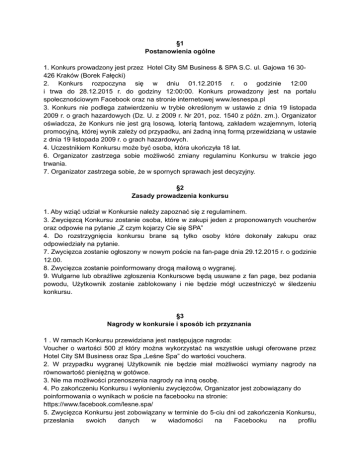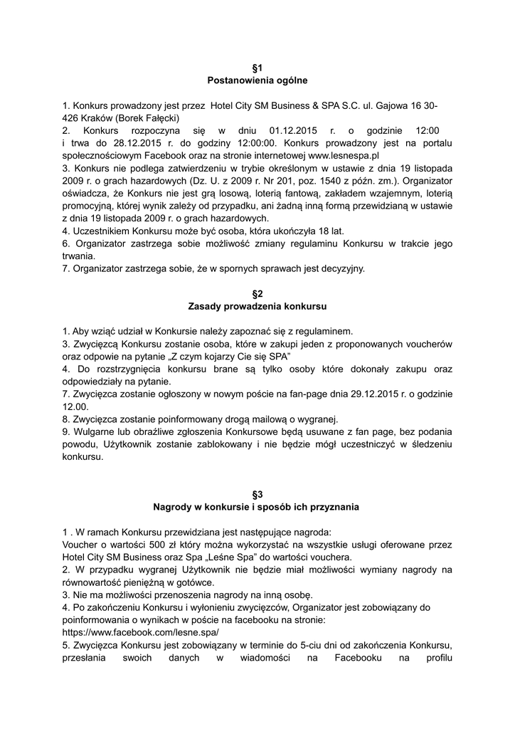 §1 Postanowienia ogólne 1. Konkurs prowadzony jest przez Hotel City SM Business & SPA S.C. ul. Gajowa 16 30426 Kraków (Borek Fałęcki) 2. Konkurs rozpoczyna się w dniu 01.12.2015 r. o godzinie 12:00 i trwa do 28.12.2015 r. do godziny 12:00:00. Konkurs prowadzony jest na portalu społecznościowym Facebook oraz na stronie internetowej www.lesnespa.pl 3. Konkurs nie podlega zatwierdzeniu w trybie określonym w ustawie z dnia 19 listopada 2009 r. o grach hazardowych (Dz. U. z 2009 r. Nr 201, poz. 1540 z późn. zm.). Organizator oświadcza, że Konkurs nie jest grą losową, loterią fantową, zakładem wzajemnym, loterią promocyjną, której wynik zależy od przypadku, ani żadną inną formą przewidzianą w ustawie z dnia 19 listopada 2009 r. o grach hazardowych. 4. Uczestnikiem Konkursu może być osoba, która ukończyła 18 lat. 6. Organizator zastrzega sobie możliwość zmiany regulaminu Konkursu w trakcie jego trwania. 7. Organizator zastrzega sobie, że w spornych sprawach jest decyzyjny. §2 Zasady prowadzenia konkursu 1. Aby wziąć udział w Konkursie należy zapoznać się z regulaminem. 3. Zwycięzcą Konkursu zostanie osoba, które w zakupi jeden z proponowanych voucherów oraz odpowie na pytanie „Z czym kojarzy Cie się SPA” 4. Do rozstrzygnięcia konkursu brane są tylko osoby które dokonały zakupu oraz odpowiedziały na pytanie. 7. Zwycięzca zostanie ogłoszony w nowym poście na fan-page dnia 29.12.2015 r. o godzinie 12.00. 8. Zwycięzca zostanie poinformowany drogą mailową o wygranej. 9. Wulgarne lub obraźliwe zgłoszenia Konkursowe będą usuwane z fan page, bez podania powodu, Użytkownik zostanie zablokowany i nie będzie mógł uczestniczyć w śledzeniu konkursu. §3 Nagrody w konkursie i sposób ich przyznania 1 . W ramach Konkursu przewidziana jest następujące nagroda: Voucher o wartości 500 zł który można wykorzystać na wszystkie usługi oferowane przez Hotel City SM Business oraz Spa „Leśne Spa” do wartości vouchera. 2. W przypadku wygranej Użytkownik nie będzie miał możliwości wymiany nagrody na równowartość pieniężną w gotówce. 3. Nie ma możliwości przenoszenia nagrody na inną osobę. 4. Po zakończeniu Konkursu i wyłonieniu zwycięzców, Organizator jest zobowiązany do poinformowania o wynikach w poście na facebooku na stronie: https://www.facebook.com/lesne.spa/ 5. Zwycięzca Konkursu jest zobowiązany w terminie do 5-ciu dni od zakończenia Konkursu, przesłania swoich danych w wiadomości na Facebooku na profilu https://www.facebook.com/lesne.spa/ w celu wysyłki nagrody, opatrzonych klauzulą: “wyrażam zgodę na przetwarzanie moich danych osobowych”. §4 Reklamacje 1. Reklamacje należy zgłaszać do Organizatora Konkursu. 2. Reklamacja może byś złożona do 10 dni po zakończeniu Konkursu. 3. Reklamacje powinny zawierać imię, nazwisko i dokładny adres Uczestnika, jak również dokładny opis i wskazanie przyczyny reklamacji. Reklamacje rozpatrywane będą niezwłocznie, jednak nie później niż w terminie 10 dni od daty ich otrzymania przez Organizatora. 4. Organizator rozstrzyga reklamacje na podstawie niniejszego Regulaminu. 5. Uczestnik składający reklamację zostanie powiadomiony o decyzji Organizatora za pomocą wiadomości e-mail lub wiadomości na Facebooku, w terminie 10 dni od daty rozpatrzenia reklamacji. 6. Wszelkie informacje na temat Konkursu Uczestnicy mogą uzyskać kontaktując się z Organizatorem. §5 Postanowienia końcowe 1. Regulamin konkursu jest dostępny na stronie organizatora oraz w siedzibie Organizatora. 2. Uczestnicy Konkursu jak i Organizator będą dążyć do rozwiązywania wszelkich sporów powstałych na tle Regulaminu Konkursu w sposób ugodowy, na drodze negocjacji. §6 Wejście w życie regulaminu konkursu Niniejszy Regulamin Konkursowy wchodzi w życie z dniem 01.12.2015 r., o godzinie 12:00.