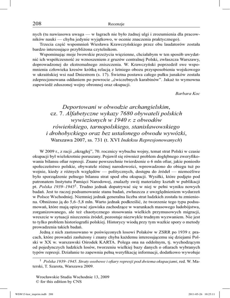 208 Recenzje nych (tu nawiasowa uwaga — w łagrach nie było żadnej ulgi i zrozumienia dla pracowników nauki — chyba jedynie wyjątkowo, w ocenie znaczenia praktycznego). Trzecia część wspomnień Wiesława Krawczyńskiego przez obu laudatorów została bardzo interesująco przybliżona czytelnikom. Wspominając moje lwowskie przeżycia więzienne, chciałabym w ten sposób uwydatnić ich współczesność ze wznoszeniem z gruzów centralnej Polski, zwłaszcza Warszawy, doprowadzonej do ekstremalnego zniszczenia. W. Krawczyński poprzedził swe wspomnienia człowieka kresów krótką relacją z letniego obozu przysposobienia wojskowego w ukraińskiej wsi nad Dniestrem (s. 17). Świetna postawa całego pułku junaków została zdeprecjonowana oddaniem po powrocie „ćwiczebnych karabinów”. Jakaż to wymowna zapowiedź zduszonej wojny obronnej oraz okupacji. Barbara Koc Deportowani w obwodzie archangielskim, cz. 7. Alfabetyczne wykazy 7680 obywateli polskich wywiezionych w 1940 r. z obwodów rówieńskiego, tarnopolskiego, stanisławowskiego i drohobyckiego oraz bez ustalonego obwodu wywózki, Warszawa 2007, ss. 731 (t. XVI Indeksu Represjonowanych) W 2009 r., z racji „okrągłej”, 70. rocznicy wybuchu wojny, temat strat Polski w czasie okupacji był wielokrotnie poruszany. Pojawił się również problem dogłębnego zweryfikowania bilansu ofiar represji. Znane powszechnie twierdzenie o 6 mln ofiar, jakie poniosło społeczeństwo polskie, obywatele różnej narodowości, wprowadzono do obiegu tuż po wojnie, kiedy z różnych względów — politycznych, dostępu do źródeł — niemożliwe było sporządzenie pełnego bilansu strat spod obu okupacji. Wysiłki, które podjęto pod patronatem Instytutu Pamięci Narodowej, znalazły swój materialny kształt w publikacji pt. Polska 1939–19451. Trudno jednak dopatrywać się w niej w pełni wyniku nowych badań. Jest to raczej podsumowanie stanu badań, zwłaszcza z uwzględnieniem wydarzeń w Polsce Wschodniej. Niemniej jednak generalna liczba strat ludzkich została tu zmieniona. Obniżono ją do 5,6–5,8 mln. Warto jednak podkreślić, że tworzenie tego typu podsumowań, które mają opisywać zjawiska zachodzące w warunkach masowego ludobójstwa, zorganizowanego, ale też chaotycznego stosowania wielkich przymusowych migracji, wreszcie w sytuacji niszczenia źródeł, pozostaje niezwykle trudnym wyzwaniem. Nie jest to tylko problem historiografii polskiej. Historycy wiodą przy tym ważkie spory o metody prowadzenia takich badań. Jedną z nich zastosowano w poświęconych losowi Polaków w ZSRR po 1939 r. pracach, które prowadzi zasłużony i znany chyba każdemu interesującemu się dziejami Polski w XX w. warszawski Ośrodek KARTA. Polega ona na oddolnym, tj. wychodzącym od pojedynczych ludzkich losów, tworzeniu wielkiej bazy danych o ofiarach wybranych typów represji. Działanie to zapewnia pełną weryfikację informacji, dodatkowo wywołuje 1 Polska 1939–1945. Straty osobowe i ofiary represji pod dwiema okupacjami, red. W. Materski, T. Szarota, Warszawa 2009. Wrocławskie Studia Wschodnie 13, 2009 © for this edition by CNS WSW13-kor_imprim.indb 208 2011-05-26 10:25:11 Recenzje 209 z anonimowej zbiorowości setek tysięcy bezimiennych ofiar konkretnych ludzi, znanych odtąd z imienia, nazwiska, często także twarzy... Jest to doskonały sposób przełamywania pewnego zobojętnienia, które pojawia się w nas w konfrontacji z tak wielką liczbą. Tutaj konkretnych ludzi wyrywa się niejako z kategorii statystycznej i nadaje im na powrót kształt jednostki ludzkiej, z jej własnym obliczem i losami. W sytuacji, gdy świadkowie historii, a zwłaszcza jej najstraszliwszego wymiaru — masowych represji, opuszczają nas i siłą rzeczy słabnie bezpośredni i emocjonalny przekaz, jakiego doświadczaliśmy za ich pośrednictwem, takie personalizowanie przeszłości wydaje się rzeczą jak najbardziej pożądaną. Zatem prowadzony już od 1988 r. Indeks Represjonowanych ma obecnie podwójne znaczenie. Jest profesjonalnym przedsięwzięciem dokumentacyjno-naukowym, polegającym na tworzeniu zbioru biogramów i towarzyszącym mu badaniu przebiegu represji. Spełnia także funkcję papierowego/wirtualnego pomnika pamięci o ofiarach, które z przyczyn politycznych przez wiele lat „odpychano” od głównego nurtu zarówno badania, jak i upamiętniania represji wojennych. Zaplecze projektu stanowią ankiety personalne represjonowanych, zbierane początkowo przez Archiwum Wschodnie KARTY, które wzbogacane są rozmaitymi materiałami źródłowymi. W tej podstawowej bazie danych znajduje się ponad 900 tys. biogramów (trzeba jednak pamiętać, że rzeczywista liczba osób jest mniejsza, gdyż każda informacja źródłowa wprowadzana jest oddzielnie i ta sama osoba może występować kilkakrotnie). Oczywiście Indeks... nie przybrałby takiego kształtu bez współpracy z rosyjskimi historykami i archiwistami. Już w 1991 r. partnerem KARTY w tych pracach stało się Stowarzyszenie „Memoriał”, które wzięło na siebie główny ciężar żmudnego przeszukiwania archiwów rosyjskich, zlokalizowanych przecież bardzo często w oddalonych miejscach represji i wyławiania z nich obywateli polskich. Informacje te są następnie opracowywane i weryfikowane przez porównanie z dostępnymi materiałami polskimi. Końcowym efektem tej współpracy jest sporządzenie biogramu represjonowanego według przyjętego modelu, a następnie zaliczenie go do konkretnej, wyodrębnionej kategorii. Udostępniane są one w tomach serii wydawniczej Indeks Represjonowanych (dotąd 17 tomów zawierających ponad 157 tys. biogramów), jak również w Internetowym Centrum Indeksu Represjonowanych (ICIR), którego baza jest o prawie 100 tys. biogramów większa. Zawiera ona bowiem dwa niezweryfikowane jak dotąd zestawienia — tzw. listę ukraińską oraz wykaz spraw prowadzonych przez organa NKWD Ukrainy Zachodniej i Białorusi Zac