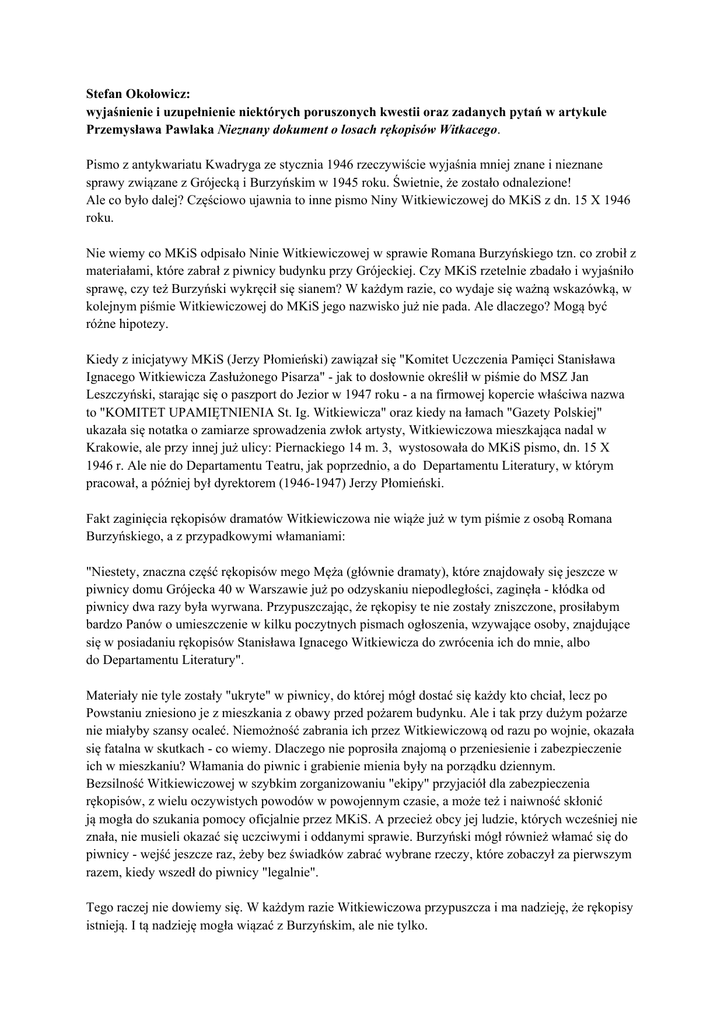 Stefan Okołowicz: wyjaśnienie i uzupełnienie niektórych poruszonych kwestii oraz zadanych pytań w artykule Przemysława Pawlaka Nieznany dokument o losach rękopisów Witkacego. Pismo z antykwariatu Kwadryga ze stycznia 1946 rzeczywiście wyjaśnia mniej znane i nieznane sprawy związane z Grójecką i Burzyńskim w 1945 roku. Świetnie, że zostało odnalezione! Ale co było dalej? Częściowo ujawnia to inne pismo Niny Witkiewiczowej do MKiS z dn. 15 X 1946 roku. Nie wiemy co MKiS odpisało Ninie Witkiewiczowej w sprawie Romana Burzyńskiego tzn. co zrobił z materiałami, które zabrał z piwnicy budynku przy Grójeckiej. Czy MKiS rzetelnie zbadało i wyjaśniło sprawę, czy też Burzyński wykręcił się sianem? W każdym razie, co wydaje się ważną wskazówką, w kolejnym piśmie Witkiewiczowej do MKiS jego nazwisko już nie pada. Ale dlaczego? Mogą być różne hipotezy. Kiedy z inicjatywy MKiS (Jerzy Płomieński) zawiązał się "Komitet Uczczenia Pamięci Stanisława Ignacego Witkiewicza Zasłużonego Pisarza" - jak to dosłownie określił w piśmie do MSZ Jan Leszczyński, starając się o paszport do Jezior w 1947 roku - a na firmowej kopercie właściwa nazwa to "KOMITET UPAMIĘTNIENIA St. Ig. Witkiewicza" oraz kiedy na łamach "Gazety Polskiej" ukazała się notatka o zamiarze sprowadzenia zwłok artysty, Witkiewiczowa mieszkająca nadal w Krakowie, ale przy innej już ulicy: Piernackiego 14 m. 3, wystosowała do MKiS pismo, dn. 15 X 1946 r. Ale nie do Departamentu Teatru, jak poprzednio, a do Departamentu Literatury, w którym pracował, a później był dyrektorem (1946-1947) Jerzy Płomieński. Fakt zaginięcia rękopisów dramatów Witkiewiczowa nie wiąże już w tym piśmie z osobą Romana Burzyńskiego, a z przypadkowymi włamaniami: "Niestety, znaczna część rękopisów mego Męża (głównie dramaty), które znajdowały się jeszcze w piwnicy domu Grójecka 40 w Warszawie już po odzyskaniu niepodległości, zaginęła - kłódka od piwnicy dwa razy była wyrwana. Przypuszczając, że rękopisy te nie zostały zniszczone, prosiłabym bardzo Panów o umieszczenie w kilku poczytnych pismach ogłoszenia, wzywające osoby, znajdujące się w posiadaniu rękopisów Stanisława Ignacego Witkiewicza do zwrócenia ich do mnie, albo do Departamentu Literatury". Materiały nie tyle zostały "ukryte" w piwnicy, do której mógł dostać się każdy kto chciał, lecz po Powstaniu zniesiono je z mieszkania z obawy przed pożarem budynku. Ale i tak przy dużym pożarze nie miałyby szansy ocaleć. Niemożność zabrania ich przez Witkiewiczową od razu po wojnie, okazała się fatalna w skutkach - co wiemy. Dlaczego nie poprosiła znajomą o przeniesienie i zabezpieczenie ich w mieszkaniu? Włamania do piwnic i grabienie mienia były na porządku dziennym. Bezsilność Witkiewiczowej w szybkim zorganizowaniu "ekipy" przyjaciół dla zabezpieczenia rękopisów, z wielu oczywistych powodów w powojennym czasie, a może też i naiwność skłonić ją mogła do szukania pomocy oficjalnie przez MKiS. A przecież obcy jej ludzie, których wcześniej nie znała, nie musieli okazać się uczciwymi i oddanymi sprawie. Burzyński mógł również włamać się do piwnicy - wejść jeszcze raz, żeby bez świadków zabrać wybrane rzeczy, które zobaczył za pierwszym razem, kiedy wszedł do piwnicy "legalnie". Tego raczej nie dowiemy się. W każdym razie Witkiewiczowa przypuszcza i ma nadzieję, że rękopisy istnieją. I tą nadzieję mogła wiązać z Burzyńskim, ale nie tylko. Może więc nie wymienienie nazwiska Burzyńskiego w drugim piśmie do MKiS, jako sprawcy zabrania "znacznej części rękopisów" podyktowane było rozsądkiem i "zabiegiem" po to, żeby dać mu szansę na ich oddanie, kiedy ukazałoby się ogłoszenie w prasie. Z drugiej strony, gdyby przypuszczała, że to właśnie Burzyński posiada "znaczną części rękopisów", to przecież mogłaby pertraktować z nim za pośrednictwem odpowiednich osób, które wyjaśniłyby mu wagę sprawy, jeżeli sam do tego nie doszedł. Mogła też przecież skontaktować się z nim bezpośrednio, kiedy przyjechała już do Warszawy. Istotne też, jaką świadomość "artystyczną" miał Burzyński w ogóle oraz odnośnie osoby Witkiewicza-artysty i jego sztuki. Jeżeli taką jak niektórzy krytycy, to nie wróżyło to nic dobrego. Jako wysłannik ministerstwa mógł służbowo "odwalić" robotę i dalej sprawą nie interesować się - stąd może opóźnienie w wysłaniu rzeczy do Witkiewiczowej. A zabrane materiały po przejrzeniu mógł zlekceważyć jako jego zdaniem nieciekawe i nic nie warte. Ale rola Leszczyńskiego, jeżeli chodzi o Grójecką i znajdujące się w piwnicy materiały, jest znana i przez niego wyjaśniona. Nie miał powodu ukrywania faktycznego obrazu jaki zastał. Wielokrotnie o tym profesor opowiadał w rozmowach towarzyskich i spotkaniach "roboczych". Opisywał to co zobaczył. Nie mógł wiedzieć co Burzyński wyniósł wcześniej z Grójeckiej, a co zniszczyli wandale (wycierając ręce, a może i co innego po zjedzeniu śledzia :) W każdy razie Leszczyński opowiedział dokładnie jak zbierał podeptane papiery leżące w kałużach wody i wśród gruzu - ślady zniszczeń widnieją na rękopisach do dzisiaj. Jeżeli stos rękopisów zabrał ktoś rozumny celowo, nawet Burzyński, to raczej przez tyle lat była szans na ich ujawnienie. A może i nie. "Bywa różnie" - jak mówi pewna osoba. Więc czy należy przychylić się do wersji, że mogły także posłużyć wandalom w celach przyziemnych? Rolę Leszczyńskiego, a także szczegóły jego działań co do Grójeckiej wyjaśniła sama Nina Witkiewiczowa, właśnie we wspomnianym już liście do Departamentu Literatury MKiS z dn. 15 X 1946 roku: "Ponieważ ze względu na zły stan mego zdrowia trudno mi się z Panami osobiście porozumieć, uprzejmie proszę o udzielenie łaskawe wszelkich informacji w tej sprawie panu Janowi Leszc