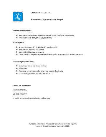 Oferta Nr: 45/2017/R Stanowisko: Wprowadzanie danych Zakres obowiązków: Wprowadzanie danych powierzonych przez firmę do bazy firmy Przetwarzanie danych na użytek firmy Wymagania: Komunikatywność, dokładność, sumienność Znajomość pakietu MS Office Umiejętność pracy w zespole Orzeczenie o niepełnosprawności w stopniu znacznym lub umiarkowanym Informacje dodatkowe: Umowa o pracę na okres próbny Pełny etat Praca na otwartym rynku pracy na terenie Radomia CV należy przesłać do dnia 15.02.2017 Osoba do kontaktu: Marlena Burska, tel: 883 506 509 e- mail: [email protected] Fundacja „Normalna Przyszłość” została wpisana do rejestru Agencji Zatrudnienia pod numerem 8330.