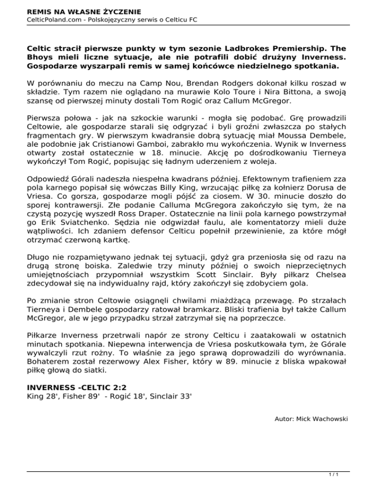 REMIS NA WŁASNE ŻYCZENIE CelticPoland.com - Polskojęzyczny serwis o Celticu FC Celtic stracił pierwsze punkty w tym sezonie Ladbrokes Premiership. The Bhoys mieli liczne sytuacje, ale nie potrafili dobić drużyny Inverness. Gospodarze wyszarpali remis w samej końcówce niedzielnego spotkania. W porównaniu do meczu na Camp Nou, Brendan Rodgers dokonał kilku roszad w składzie. Tym razem nie oglądano na murawie Kolo Toure i Nira Bittona, a swoją szansę od pierwszej minuty dostali Tom Rogić oraz Callum McGregor. Pierwsza połowa - jak na szkockie warunki - mogła się podobać. Grę prowadzili Celtowie, ale gospodarze starali się odgryzać i byli groźni zwłaszcza po stałych fragmentach gry. W pierwszym kwadransie dobrą sytuację miał Moussa Dembele, ale podobnie jak Cristianowi Gamboi, zabrakło mu wykończenia. Wynik w Inverness otwarty został ostatecznie w 18. minucie. Akcję po dośrodkowaniu Tierneya wykończył Tom Rogić, popisując się ładnym uderzeniem z woleja. Odpowiedź Górali nadeszła niespełna kwadrans później. Efektownym trafieniem zza pola karnego popisał się wówczas Billy King, wrzucając piłkę za kołnierz Dorusa de Vriesa. Co gorsza, gospodarze mogli pójść za ciosem. W 30. minucie doszło do sporej kontrawersji. Złe podanie Calluma McGregora zakończyło się tym, że na czystą pozycję wyszedł Ross Draper. Ostatecznie na linii pola karnego powstrzymał go Erik Sviatchenko. Sędzia nie odgwizdał faulu, ale komentatorzy mieli duże wątpliwości. Ich zdaniem defensor Celticu popełnił przewinienie, za które mógł otrzymać czerwoną kartkę. Długo nie rozpamiętywano jednak tej sytuacji, gdyż gra przeniosła się od razu na drugą stronę boiska. Zaledwie trzy minuty później o swoich nieprzeciętnych umiejętnościach przypomniał wszystkim Scott Sinclair. Były piłkarz Chelsea zdecydował się na indywidualny rajd, który zakończył się zdobyciem gola. Po zmianie stron Celtowie osiągnęli chwilami miażdżącą przewagę. Po strzałach Tierneya i Dembele gospodarzy ratował bramkarz. Bliski trafienia był także Callum McGregor, ale w jego przypadku strzał zatrzymał się na poprzeczce. Piłkarze Inverness przetrwali napór ze strony Celticu i zaatakowali w ostatnich minutach spotkania. Niepewna interwencja de Vriesa poskutkowała tym, że Górale wywalczyli rzut rożny. To właśnie za jego sprawą doprowadzili do wyrównania. Bohaterem został rezerwowy Alex Fisher, który w 89. minucie z bliska wpakował piłkę głową do siatki. INVERNESS -CELTIC 2:2 King 28', Fisher 89' - Rogić 18', Sinclair 33' Autor: Mick Wachowski 1/1 Powered by TCPDF (www.tcpdf.org)