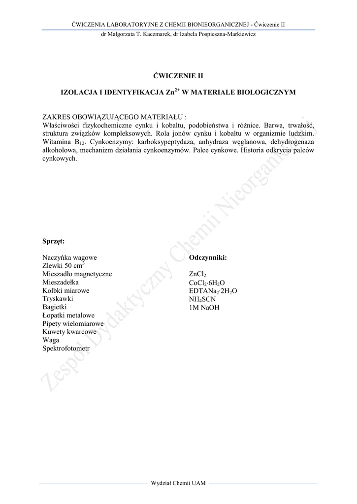 ĆWICZENIA LABORATORYJNE Z CHEMII BIONIEORGANICZNEJ - Ćwiczenie II dr Małgorzata T. Kaczmarek, dr Izabela Pospieszna-Markiewicz ĆWICZENIE II IZOLACJA I IDENTYFIKACJA Zn2+ W MATERIALE BIOLOGICZNYM ZAKRES OBOWIĄZUJĄCEGO MATERIAŁU : Właściwości fizykochemiczne cynku i kobaltu, podobieństwa i różnice. Barwa, trwałość, struktura związków kompleksowych. Rola jonów cynku i kobaltu w organizmie ludzkim. Witamina B12. Cynkoenzymy: karboksypeptydaza, anhydraza węglanowa, dehydrogenaza alkoholowa, mechanizm działania cynkoenzymów. Palce cynkowe. Historia odkrycia palców cynkowych. Sprzęt: Naczyńka wagowe Zlewki 50 cm3 Mieszadło magnetyczne Mieszadełka Kolbki miarowe Tryskawki Bagietki Łopatki metalowe Pipety wielomiarowe Kuwety kwarcowe Waga Spektrofotometr Odczynniki: ZnCl2 CoCl26H2O EDTANa2∙2H2O NH4SCN 1M NaOH Wydział Chemii UAM ĆWICZENIA LABORATORYJNE Z CHEMII BIONIEORGANICZNEJ - Ćwiczenie II dr Małgorzata T. Kaczmarek, dr Izabela Pospieszna-Markiewicz I.Preparatyka kompleksu chlorku cynku z EDTA – powiązanie z historią odkrycia palców cynkowych. Odkryciu palców cynkowych (1982) – białek zawierających cynk – pomógł przypadek. EDTA, używany przy ekstrakcji badanych białek, powodował znaczne obniżenie ilości otrzymywanego białka. Okazało się, że w roztworze, który pozostawał po ekstrakcji, znajduje się cynk, usuwany z białka w postaci kompleksu z EDTA. Kwas etylenodiaminotetraoctowy (EDTA, H4Y) jest słabym kwasem. Stężenie anionu Y4biorącego udział w reakcjach kompleksowania, czyli wiążącego jony metali, zależne jest od pH. Obniżenie pH powoduje obniżenie stałej dysocjacji kwasu i tym samym obniżenie stężenia Y4- w roztworze. EDTA kompleksuje silniej jony metali w środowisku alkalicznym. Trwałość kompleksów z EDTA wrasta ze wzrostem stopnia utlenienia kationu. Wykonanie ćwiczenia: Równomolową ilość (w przeliczeniu na ZnCl2) wersenianiu disodowego (EDTANa2) należy rozpuścić w 10 ml wody na gorąco, a następnie do roztworu dodać 0,5 g ZnCl2. Po rozpuszczeniu roztwór ogrzać do wrzenia delikatnie mieszając na mieszadle magnetycznym (pod wyciągiem). Ogrzewać w temperaturze wrzenia bez przykrycia do momentu, aż pary wrzącego roztworu nie będą zawierać par HCl (sprawdzamy za pomocą papierka wskaźnikowego). Następnie do wrzącego roztworu dodajemy kroplami 1M roztwór wodorotlenku sodu w celu uzyskania alkalicznego pH (kontrola papierkiem wskaźnikowym). Po uzyskaniu żądanego pH kontynuować ogrzewanie do uzyskania 2 ml roztworu. Roztwór pozostawić do ochłodzenia w celu otrzymania krystalicznego białego osadu, jeżeli osad się nie wytrąci ponownie zredukować ilość rozpuszczalnika i ochłodzić mieszaninę. Następnie wykonać widmo UV-Vis otrzymanego związku. W tym celu umieścić w kolbce miarowej na 10 cm3 0,01 mmola kompleksu i uzupełnić wodą destylowaną do kreski. Widmo UV-Vis wykonać w zakresie 600-200 nm, używając jako odnośnika wody destylowanej. Dla porównania wykonać widmo UV-Vis EDTANa2 w tych samych warunkach. II. Porównanie trwałości kompleksów cynku i kobaltu; układ modelowy: rodankowy kompleks cynku – rodankowy kompleks kobaltu W badaniach układów biologicznych zawierających cynk wykorzystuje się możliwość izomorficznego podstawienia jonów cynku jonami kobaltu. Nie obserwuje się przy tym zaniku aktywności. Wykorzystanie różnic we właściwościach spektroskopowych i magnetycznych tych dwóch jonów stwarza lepsze możliwości poznania budowy i funkcji metaloprotein. 1.Preparatyka kompleksu CoCl2 z NH4SCN W zlewce na 50 ml umieścić odważone 4 mmola NH4SCN, dodać 10 ml wody destylowanej, następnie dodać 1 mmola CoCl2, wymieszać. Łagodnie ogrzewać na płycie grzejnej do odparowania H2O, pozostawić w zlewce około 1 ml produktu, ochłodzić. Po ochłodzeniu na dnie zlewki wypadanie drobnokrystaliczny granatowy osadu kompleksu kobaltu, osad suszyć na powietrzu. Jeżeli osad się nie wytrąci ponownie zredukować ilość rozpuszczalnika i ochłodzić mieszaninę. Odważyć 0,01 mmola kompleksu, umieścić w kolbce miarowej na 10 cm3i rozpuścić w 10 ml H2O, dokładnie wymieszać. Wykonać widmo UV-Vis w zakresie Wydział Chemii UAM ĆWICZENIA LABORATORYJNE Z CHEMII BIONIEORGANICZNEJ - Ćwiczenie II dr Małgorzata T. Kaczmarek, dr Izabela Pospieszna-Markiewicz 600-200 nm, jako odnośnik zastosować wodę. Dla porównania wykonać widmo UV-Vis NH4SCN w tych samych warunkach. 2.Preparatyka kompleksu ZnCl2 z NH4SCN Uwaga!!! Przed reakcją zważyć zlewkę! W zlewce na 50 ml umieścić odważone 4 mmola NH4SCN, dodać 10 ml wody destylowanej, dodać 1 mmola stałego ZnCl2, wymieszać. Łagodnie ogrzewać na płycie grzejnej do odparowania H2O, pozostawić w zlewce około 1 ml produktu, ochłodzić. Wytrącony drobnokrystaliczny osadu kompleksu cynku suszyć na powietrzu. Jeżeli osad się nie wytrąci ponownie zredukować ilość rozpuszczalnika i ochłodzić mieszaninę. Odważyć 0,01 mmola kompleksu, umieścić w kolbce miarowej na 10 cm3 i rozpuścić w 10 ml H2O, dokładnie wymieszać. Wykonać widmo UV-Vis w zakresie 600-200 nm, jako odnośnik zastosować wodę. Porównać z widmem UV-Vis NH4SCN. 3.Podstawianie jonów Zn2+ w kompleksie rodankowym jonami Co2+ Odważyć 0,1 mmola kompleksu Zn2+ otrzymanego w zadaniu 2, rozpuścić w 10 ml H2O i dodać równomolową ilość soli Co2+. Łagodnie ogrzewać na płycie grzejnej do odparowania wody, ochłodzić. Jeżeli osad się nie wytrąci ponownie zredukować ilość rozpuszczalnika i ochłodzić mieszaninę. Drobnokrystaliczny osad suszyć na powietrzu. Odważyć 0,1 mmola otrzymanej substancji, umieścić w kolbce miarowej na 10 cm3 i rozpuścić w 10 ml H2O, dokładnie wymieszać. Wykonać widmo UV-Vis w zakresie 600-200 nm, jako odnośnik zastosować wodę. Przy obliczeniach proszę pamiętać o tym, że sole metali mogą być związkami uwodnionymi. Roztwory do analizy UV-Vis przygotowac w ko