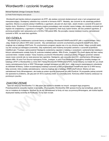 Wordworth i czcionki truetype Michał Rybiński (Amiga Computer Studio) (c) Polski Portal Amigowy (www.ppa.pl) Wordworth jest bardzo dobrym programem do DTP, ale zestaw czcionek dostarczonych wraz z tym programem jest niewystarczający. Dostajemy zaledwie trzy czcionki w formacie AGFY. Niestety, ale czcionki te nie zawierają polskich ogonków. Można co prawda zdobyć Intellifonty z ogonkami, ale jest ich zbyt mało. Jeżeli chodzi o czcionki ttf to jest ich bardzo dużo. Wordworth 7.0 ma wbudowany engine pozwalający nam wczytać nasze trutajpy, ale niestety czcionek tych nigdzie nie znajdziemy z ogonkami w AmigaPL. Czyli będziemy mieli duży wybór fontów, ale bez polskich ogonków. Z pomocą przyjdzie nam opisywany już w ACS'ie 7/99 pakiet ttflib. Na początku naszej instalacji musimy zainstalować czcionki w WW, na razie bez ogonków. DO DZIEŁA w .p pa .p l Wordworth przy instalowaniu czcionek tworzy w katalogu Wordworth7/WWFonts/UFST pliki z rozszerzeniem .font i .otag. Dzięki tym plikom WW widzi czcionki. Aby zainstalować czcionki uruchamiamy programik InstallFonts, który znajduje się w katalogu WWTools. Po uruchomieniu program zapyta nas o to czy chcemy dodać nowe czcionki (add), czy też usunąć już istniejące (overwrite). Gdy wybierzemy add możemy korzystać zarówno z czcionek w formacie Intellifont jak i Truetype jednocześnie! Następnie zostaniemy zapytani o katalog z czcionkami, wybieramy ten katalog w którym zainstalowane zostały fonty ttf, podczas instalacji pakietu ttflib (Fonts:_truetype). Po chwili ukażą się nam nazwy czcionek które instaler znalazł. Teraz możemy uruchomić Wordwortha i zobaczyć efekty. Program powinien widzieć nasze nowe czcionki ale na razie jeszcze bez ogonków. Następnie, gdy wszystko jest O.K. uruchamiamy ttfmanager z pakietu ttflib. W polu Font Source wpisujemy Fonts:_truetype, w polu Font Destination wpisujemy ścieżkę dostępu do katalogu UFST w Wordworthie (u mnie HD1:Teksty/Wordworth7/WWFonts/UFST). Teraz klikamy na Install All i po chwili mamy zainstalowane fonty w WW! Ttfmanager zastąpił istniejące już pliki .font i .otag nowymi zawierającymi odwołania do biblioteki ttf.library. Celem wcześniejszej instalacji czcionek w WW programikiem InstallFonts było to iż WW tworzy listę czcionek, które zostały zainstalowane. Lista ta znajduję się w katalogu WWFonts/FontList. Można od razu zainstalować fonty ttfmanagerem, ale trzeba je potem ręcznie dopisywać do pliku FontList. W przypadku jednej czcionki nie sparawia to problemu, ale gdy jest ich 50 to szybciej zrobić to automatycznie. Końcowy efekt możemy zobaczyć na poniższym rysunku. ZAKOŃCZENIE w w Opis ten dotyczył Wordwortha 7.0. Nie wiem jak będzie to działało na innych wersjach tego programu. Prawdopodobnie wszystko będzie w porządku. W przypadku Wordwortha 4SE sprawa trochę się komplikuje, gdyż nie ma on instalera do trutajpów. Możliwe że da się zainstalować te fonty od razu za pomocą ttfmanagera, ale trzeba będzie dopisywać każdą czcionkę do FontListy. To by było na tyle. Strona 1