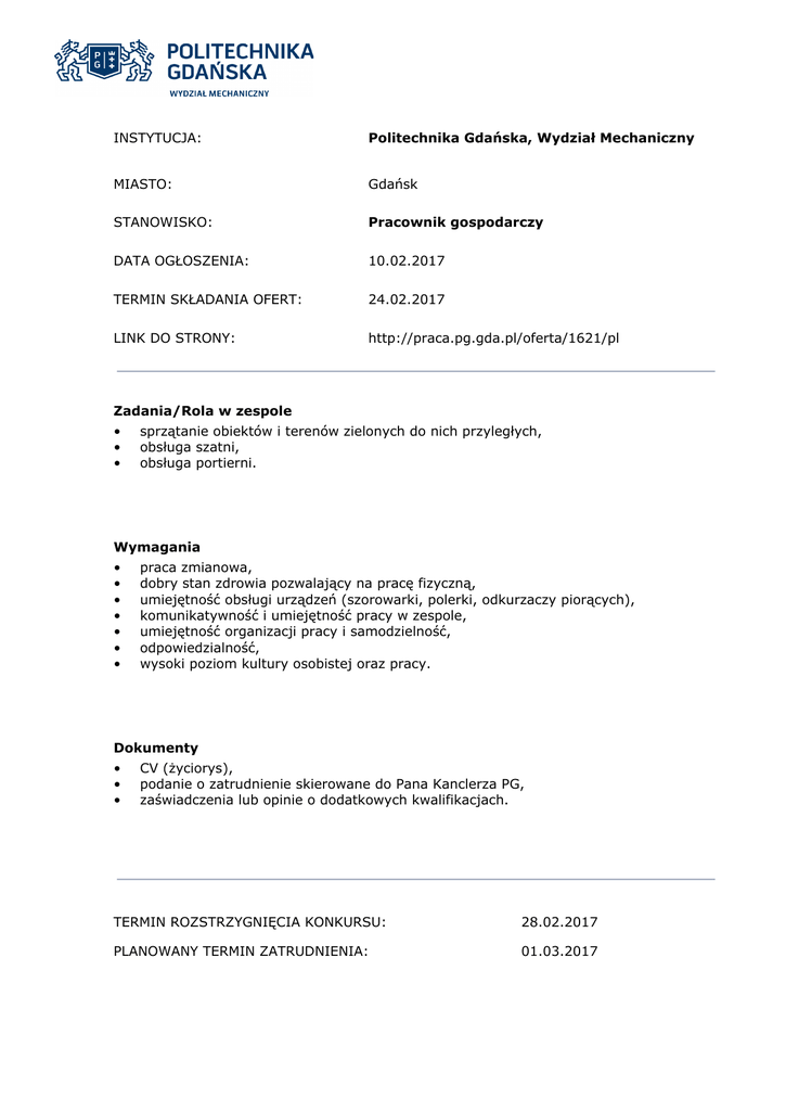 INSTYTUCJA: Politechnika Gdańska, Wydział Mechaniczny MIASTO: Gdańsk STANOWISKO: Pracownik gospodarczy DATA OGŁOSZENIA: 10.02.2017 TERMIN SKŁADANIA OFERT: 24.02.2017 LINK DO STRONY: http://praca.pg.gda.pl/oferta/1621/pl Zadania/Rola w zespole • • • sprzątanie obiektów i terenów zielonych do nich przyległych, obsługa szatni, obsługa portierni. Wymagania • • • • • • • praca zmianowa, dobry stan zdrowia pozwalający na pracę fizyczną, umiejętność obsługi urządzeń (szorowarki, polerki, odkurzaczy piorących), komunikatywność i umiejętność pracy w zespole, umiejętność organizacji pracy i samodzielność, odpowiedzialność, wysoki poziom kultury osobistej oraz pracy. Dokumenty • • • CV (życiorys), podanie o zatrudnienie skierowane do Pana Kanclerza PG, zaświadczenia lub opinie o dodatkowych kwalifikacjach. TERMIN ROZSTRZYGNIĘCIA KONKURSU: 28.02.2017 PLANOWANY TERMIN ZATRUDNIENIA: 01.03.2017 Dokumenty należy składać osobiście w Biurze Wydziału Mechanicznego budynek nr 40, 80-233 Gdańsk, ul. Narutowicza 11/12, pok. 310 Prosimy o umieszczenie klauzuli: "Wyrażam zgodę na przetwarzanie danych osobowych zawartych w mojej ofercie dla potrzeb niezbędnych przy procesie rekrutacji (zgodnie z Ustawą z dnia 29 sierpnia 1997 r. o Ochronie Danych Osobowych j.t. Dz. U. z 2016 r. poz. 922). Jednocześnie zgodnie z art. 24 ust. 1 ustawy o ochronie danych osobowych z dnia 29 sierpnia 1997 r. (j.t. Dz. U. z 2016 r. poz. 922) przyjmuję do wiadomości, że administratorem zebranych danych osobowych jest Politechnika Gdańska z siedzibą w Gdańsku na ul. Narutowicza 11/12. Podanie danych jest dobrowolne, ale niezbędne do realizacji procesu rekrutacji. Mam prawo dostępu do treści podanych danych i ich poprawiania". Konkurs może zostać zamknięty bez wyłonienia kandydata. Skontaktujemy się z wybranymi osobami. Nadesłanych pocztą ofert nie odsyłamy. Zlecający zastrzegają sobie prawo do odpowiedzi jedynie na wybrane oferty.