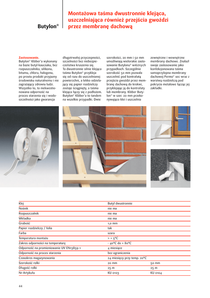Monta˝owa taśma dwustronnie klejąca, uszczelniająca równie˝ przejścia gwoździ przez membranę dachową Butylon® Zastosowanie. Butylon® Klöber’a wykonany na bazie butyl-kauczuku, bez rozpuszczalnika, silikonu, bitumu, chloru, halogenu, po prostu produkt przyjazny środowisku naturalnemu i nie zagra˝ający zdrowiu ludzi. Wszystko to, to niekwestionowana odporność na proces starzenia się i wodoszczelności jako gwarancja d⌅ugotrwa⌅ej przyczepności, szczelności bez niebezpieczeƒstwa kruszenia się. Ta dwustronnie silnie klejąca taśma Butylon® przykleja się od razu do uszczelnianej powierzchni, a lekko odzielający się papier rozdzielczy zostaje ściągnięty, a taśma klejąca ⌅ączy się z pod⌅o˝em. Butylon® Klöber’a to tandem na wszelkie przypadki. Dwie szerokości, 20 mm i 50 mm umo˝liwiają wielorakie zastosowanie Butylonu® w ró ˝ n y c h przypadkach. Szczególnie szerokość 50 mm pozwala uszczelnić pod kontra⌅atą przejścia gwoździ przez membranę dachową do krokwi, przyklejając ją do kontra⌅aty lub membrany. Klöber Butylon® w szer. 20 mm przekonywująco klei i uszczelnia zewnętrzne i wewnętrzne membrany dachowe. Znalaz⌅ swoje zastosowanie jako konfekcjonowana taśma samoprzylepna membrany dachowej Permo® sec wraz z warstwą rozdzielczą pod pokrycia metalowe ⌅ącząc jej zak⌅adki. Klej Butyl dwustronnie Nośnik nie ma Rozpuszczalnik nie ma Wk⌅adka nie ma Grubość 1,0 mm Papier rozdzielczy / folia tak Farba szara Temperatura monta˝u > + 5ºC Zakres odporności na temperaturę - 40ºC do + 80ºC Odporność na promieniowanie UV EN13859-1 4 miesiące Odporność na proces starzenia bez ograniczenia Czasokres magazynowania 24 miesięcy przy temp. 20ºC Szerokość rolki 20 mm 50 mm D⌅ugość rolki 25 m 25 m Nr-Artyku⌅u KU 0103 KU 0104 44