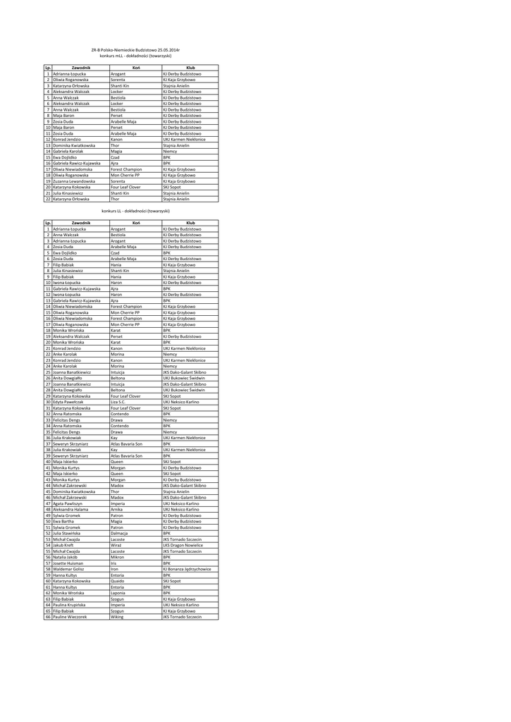 ZR-B Polsko-Niemieckie Budzistowo 25.05.2014r konkurs mLL - dokładności (towarzyski) Lp. 1 2 3 4 5 6 7 8 9 10 11 12 13 14 15 16 17 18 19 20 21 22 Zawodnik Adrianna Łopucka Oliwia Roganowska Katarzyna Orłowska Aleksandra Walczak Anna Walczak Aleksandra Walczak Anna Walczak Maja Baron Zosia Duda Maja Baron Zosia Duda Konrad Jendzio Dominika Kwiatkowska Gabriela Karolak Ewa Dojlidko Gabriela Rawicz-Kujawska Oliwia Niewiadomska Oliwia Roganowska Zuzanna Lewandowska Katarzyna Kokowska Julia Kinasiewicz Katarzyna Orłowska Koń Arogant Sorenta Shanti Kin Locker Bestiola Locker Bestiola Perset Arabelle Maja Perset Arabelle Maja Kanon Thor Magia Czad Ajra Forest Champion Mon Cherrie PP Sorenta Four Leaf Clover Shanti Kin Thor Klub KJ Derby Budzistowo KJ Kaja Grzybowo Stajnia Anielin KJ Derby Budzistowo KJ Derby Budzistowo KJ Derby Budzistowo KJ Derby Budzistowo KJ Derby Budzistowo KJ Derby Budzistowo KJ Derby Budzistowo KJ Derby Budzistowo UKJ Karmen Niekłonice Stajnia Anielin Niemcy BPK BPK KJ Kaja Grzybowo KJ Kaja Grzybowo KJ Kaja Grzybowo SKJ Sopot Stajnia Anielin Stajnia Anielin konkurs LL - dokładności (towarzyski) Lp. 1 2 3 4 5 6 7 8 9 10 11 12 13 14 15 16 17 18 19 20 21 22 23 24 25 26 27 28 29 30 31 32 33 34 35 36 37 38 39 40 41 42 43 44 45 46 47 48 49 50 51 52 53 54 55 56 57 58 59 60 61 62 63 64 65 66 Zawodnik Adrianna Łopucka Anna Walczak Adrianna Łopucka Zosia Duda Ewa Dojlidko Zosia Duda Filip Babiak Julia Kinasiewicz Filip Babiak Iwona Łopucka Gabriela Rawicz-Kujawska Iwona Łopucka Gabriela Rawicz-Kujawska Oliwia Niewiadomska Oliwia Roganowska Oliwia Niewiadomska Oliwia Roganowska Monika Wrońska Aleksandra Walczak Monika Wrońska Konrad Jendzio Anke Karolak Konrad Jendzio Anke Karolak Joanna Banatkiewicz Anita Dowgiałło Joanna Banatkiewicz Anita Dowgiałło Katarzyna Kokowska Edyta Pawełczak Katarzyna Kokowska Anna Ratomska Felicitas Dengs Anna Ratomska Felicitas Dengs Julia Krakowiak Seweryn Skrzyniarz Julia Krakowiak Seweryn Skrzyniarz Maja Iskierko Monika Kurtys Maja Iskierko Monika Kurtys Michał Zakrzewski Dominika Kwiatkowska Michał Zakrzewski Agata Pawliszyn Aleksandra Halama Sylwia Gromek Ewa Bartha Sylwia Gromek Julia Stawińska Michał Cwajda Jakub Kreft Michał Cwajda Natalia Jakób Josette Huisman Waldemar Golisz Hanna Kultys Katarzyna Kokowska Hanna Kultys Monika Wrońska Filip Babiak Paulina Krupińska Filip Babiak Pauline Wieczorek Koń Arogant Bestiola Arogant Arabelle Maja Czad Arabelle Maja Hania Shanti Kin Hania Haron Ajra Haron Ajra Forest Champion Mon Cherrie PP Forest Champion Mon Cherrie PP Karat Perset Karat Kanon Morina Kanon Morina Intuicja Beltona Intuicja Beltona Four Leaf Clover Liza S.C. Four Leaf Clover Contendo Drawa Contendo Drawa Kay Atlas Bavaria Son Kay Atlas Bavaria Son Queen Morgan Queen Morgan Madox Thor Madox Imperia Arnika Patron Magia Patron Dalmacja Lacoste Wiraż Lacoste Mikron Iris Iron Entoria Quaido Entoria Laponia Szogun Imperia Szogun Wiking Klub KJ Derby Budzistowo KJ Derby Budzistowo KJ Derby Budzistowo KJ Derby Budzistowo BPK KJ Derby Budzistowo KJ Kaja Grzybowo Stajnia Anielin KJ Kaja Grzybowo KJ Derby Budzistowo BPK KJ Derby Budzistowo BPK KJ Kaja Grzybowo KJ Kaja Grzybowo KJ Kaja Grzybowo KJ Kaja Grzybowo BPK KJ Derby Budzistowo BPK UKJ Karmen Niekłonice Niemcy UKJ Karmen Niekłonice Niemcy JKS Dako-Galant Skibno UKJ Bukowiec Świdwin JKS Dako-Galant Skibno UKJ Bukowiec Świdwin SKJ Sopot UKJ Neksico Karlino SKJ Sopot BPK Niemcy BPK Niemcy UKJ Karmen Niekłonice BPK UKJ Karmen Niekłonice BPK SKJ Sopot KJ Derby Budzistowo SKJ Sopot KJ Derby Budzistowo JKS Dako-Galant Skibno Stajnia Anielin JKS Dako-Galant Skibno UKJ Neksico Karlino UKJ Neksico Karlino KJ Derby Budzistowo KJ Derby Budzistowo KJ Derby Budzistowo BPK JKS Tornado Szczecin LKS Dragon Nowielice JKS Tornado Szczecin BPK BPK KJ Bonanza Jędrzychowice BPK SKJ Sopot BPK BPK KJ Kaja Grzybowo UKJ Neksico Karlino KJ Kaja Grzybowo JKS Tornado Szczecin konkurs L - dwufazowy (towarzyski) Lp. 1 2 3 4 5 6 7 8 9 10 11 12 13 14 15 16 17 18 19 20 21 22 23 24 25 26 27 28 29 30 31 32 33 34 35 36 37 38 39 40 41 42 43 44 45 46 47 48 49 50 51 52 53 54 55 56 57 58 59 60 61 62 Zawodnik Koń Klub Filip Babiak Szogun KJ Kaja Grzybowo Hanna Kultys Entoria BPK Julia Krakowiak Kay UKJ Karmen Niekłonice Maja Iskierko Queen SKJ Sopot Michał Zakrzewski Madox JKS Dako-Galant Skibno Monika Rejman Nebasco BPK Jakub Kreft Wiraż LKS Dragon Nowielice Josette Huisman Iris BPK Jakub Kreft Wiraż LKS Dragon Nowielice Josette Huisman Iris BPK Julia Stawińska Dalmacja BPK Monika Wrońska Laponia BPK Julia Stawińska Dalmacja BPK Monika Wrońska Laponia BPK Natalia Jakób Mikron BPK Pauline Wieczorek Wiking JKS Tornado Szczecin Natalia Jakób Mikron BPK Pauline Wieczorek Wiking JKS Tornado Szczecin Karolina Rucińska Dakota BPK Maja Liszczak Domino BPK Karolina Rucińska Dakota BPK Maja Liszczak Domino BPK Jan Bobik Colorado LKS Dragon Nowielice Marzena Chociej Wrangler Forest JKS Tornado Szczecin Jan Bobik Colorado LKS Dragon Nowielice Marzena Chociej Wrangler Forest JKS Tornado Szczecin Aleksandra Daniel Magia BPK Olesia Skliarenko Cesotho Rosja Aleksandra Daniel Magia BPK Olesia Skliarenko Cesotho Rosja Małgorzata Michalska Jawa KJ Derby Budzistowo Monika Kurtys Morgan KJ Derby Budzistowo Sylwia Gromek Patron KJ Derby Budzistowo Aleksandra Halama Arnika UKJ Neksico Karlino Edyta Pawełczak Laza S.C. UKJ Neksico Karlino Ewa Bartha Magia KJ Derby Budzistowo Katarzyna Kokowska Quaido SKJ Sopot Paulina Krupińska Imperia UKJ Neksico Karlino Waldemar Golisz Iron KJ Bonanza Jędrzychowice Tadeusz Szuraj Cyranka UKJ Lida Lulewiczki Agnieszka Prusińska Mister Cantero SCSJ Coval Biały Bór Aneta Wilczewska-Jakób Alderon BPK Anna Karpińska Solandria JKS Tornado Szczecin Anna Kopeć Chillenta G BPK Anna Krupska Alchemia UKJ Neksico Karlino Danuta Jonko Gracja UKJ Neksico Karlino Emilia Kostrzewska Beltona UKJ Bukowiec Świdwin Ewelina Kostrzewska Harfa UKJ Bukowiec Świdwin Jakub Kreft Corrne