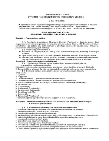 Zarządzenie nr 13/2016 Dyrektora Rejonowej Biblioteki Publicznej w Szubinie z dnia 16.12.2016r. W sprawie : nadania regulaminu organizacyjnego Rejonowej Biblioteki Publicznej w Szubinie. Na podstawie : art. 13 ust. 3 ustawy z dnia 25 października 1991r. O organizowaniu i prowadzeniu działalności kulturalnej ( Dz. U. Z 2012r. Poz 406) Zarządzam, co następuje: REGULAMIN ORGANIZACYJNY REJONOWEJ BIBLIOTEKI PUBLICZNEJ w SZUBINIE Rozdział 1. Postanowienia ogólne § 1. Regulamin organizacyjny Rejonowej Biblioteki Publicznej w Szubinie, zwany dalej „regulaminem” określa jej organizację wewnętrzną, główne zadania działów i filii Biblioteki, strukturę zatrudnienia oraz zadania dla zatrudnionych w Bibliotece pracowników działalności podstawowej, pracowników administracyjnych i obsługi. § 2. Ilekroć w regulaminie mowa o: 1) Bibliotece lub instytucji kultury – należy przez to rozumieć Rejonową Bibliotekę Publiczną w Szubinie, 2) dyrektorze – należy przez to rozumieć dyrektora Rejonowej Biblioteki Publicznej w Szubinie, 3) pracownikach Biblioteki – należy przez to rozumieć pracowników działalności podstawowej, pracowników administracyjnych i obsługi Rejonowej Biblioteki Publicznej w Szubinie. Rozdział 2. Organizacja wewnętrzna Biblioteki § 3. 1. Działalnością Biblioteki kieruje dyrektor, który reprezentuje Bibliotekę na zewnątrz i jest za nią odpowiedzialny. 2.W czasie nieobecności dyrektora zastępuje go wskazany przez dyrektora pracownik Biblioteki. 3. Delegacje i kartę urlopową Dyrektorowi podpisuje Burmistrz lub osoba przez niego upoważniona § 3. Biblioteka realizuje swoje zadania statutowe w następujących działach, oraz filiach: 1) Dyrektor; 2) księgowość 3) Dział Gromadzenia i Opracowania Zbiorów Bibliotecznych; 4) Dział Udostępniania Zbiorów i Działalności Informacyjno-Bibliograficznej 5) operator obsługi urządzeń technicznych, audiowizualnych, zestawów komputerowych, 6) filie biblioteczne: a) Chomętowo 25; b) Królikowo ul. Chraplewska1; c) Rynarzewo ul. Bydgoska 2; d) Samoklęski Małe 16a; e) Słonawy 28. f) Zamościu ul. Wierzbowa 1 …. 5. Schemat organizacyjny Biblioteki stanowi załącznik nr 1 do regulaminu. Rozdział 3. Podstawowe zadania działów i filii Biblioteki oraz obowiązki zatrudnionych w Bibliotece pracowników § 4. Do podstawowych obowiązków dyrektora Biblioteki należy: 1) kierowanie całością pracy Biblioteki oraz reprezentowanie Biblioteki na zewnątrz, 2) nadawanie regulaminu organizacyjnego Bibliotece, 3) zatrudnianie i zwalnianie pracowników instytucji; 4) wydawanie zarządzeń wewnętrznych w sprawach administracyjnych, pracowniczych i finansowych; 5) nadzór, kontrola i ocena pracy działów Biblioteki i pracowników zatrudnionych na poszczególnych stanowiskach pracy; 6) gospodarowanie majątkiem instytucji; 7) opracowanie rocznego planu działalności instytucji; 8) prowadzenie samodzielnej gospodarki finansowej w ramach posiadanych środków; 9) sporządzanie sprawozdań finansowych oraz przedkładanie ich do zatwierdzenia; 10) część swoich uprawnień dyrektor może przekazać podległym pracownikom na drodze upoważnień i pełnomocnictw zawartych w rejestrze. 1) 2) 3) 4) 5) 6) 7) 8) § 5.1. Główny księgowy Biblioteki jest odpowiedzialny za całokształt gospodarki finansowo - rzeczowej Biblioteki, prowadzonej na zasadach określonych dla instytucji kultury. 2. Do zadań głównego księgowego należy w szczególności: opracowywanie planów finansowych i zabezpieczenie ich prawidłowej realizacji, w oparciu o obowiązujące przepisy prawne i inne akty normatywne, sprawozdawczość finansowa i statystyczna, opracowywanie instrukcji obiegu dokumentów finansowych oraz nadzór i kontrola realizacji zaleceń w niej zawartych, jak również wszystkich innych operacji finansowo – rzeczowych realizowanych przez upoważnionych pracowników Biblioteki, nadzór nad prawidłowym wydawaniem, prowadzeniem i rozliczaniem wpływów z kwitariuszy przychodowych, raportów kasowych, zaliczek i innych zobowiązań finansowych, stała kontrola kasy Biblioteki, prowadzenie ksiąg inwentarzowych oraz nadzór nad gospodarką rzeczowo - materiałową i mieniem Biblioteki, współpracuje z Urzędem Skarbowym, Urzędem Miejskim w Szubinie w zakresie spraw finansowych, prowadzi akta osobowe pracowników Biblioteki oraz sprawy związane z wynagrodzeniem pracowników (odpowiada za ich prawidłowe rozliczenie z Urzędem Skarbowym i ZUS, prowadzenie dokumentacji dla ZUS). § 6. Do zadań kierowników działów należy: 1) planowanie i organizowanie pracy działu oraz ponoszenie odpowiedzialności za jego prawidłowe funkcjonowanie, 2) prowadzenie statystyki pracy działu, opracowywanie planów pracy oraz analiz, 3) kształtowanie prawidłowej struktury zbiorów bibliotecznych, 4) nadzorowanie systemu wypożyczeń książek. § 7. Do zadań Działu Gromadzenia i Opracowania Zbiorów oraz pracowników działalności podstawowej – bibliotekarzy należy: 1) bieżąca znajomość rynku wydawniczego, zapowiedzi wydawniczych oraz zawieranie umów z wydawnictwami i innymi punktami sprzedaży w zakresie zakupów zbiorów bibliotecznych, 2) gromadzenie książek poprzez zakup i z darów dla wszystkich działów i filii bibliotecznej, przy współpracy z pracownikami odpowiedzialnymi za dobór literatury i kształtowanie właściwej struktury księgozbioru, 3) prowadzenie szczegółowej ewidencji wpływów, dokumentacji zakupów, ubytków, inwentaryzacji na podstawie rozporządzenia Ministra Kultury i Dziedzictwa Narodowego w sprawie zasobu ewidencji materiałów bibliotecznych, 4) bieżąca melioracja katalogów, 5) nadzór nad bieżącą ewidencją zbiorów bibliotecznych we wszystkich działach biblioteki, 6) nadzór nad przeprowadzaniem skontrum w działach biblioteki, 7) prowadzi inwentarz Biblioteki Głównej, 8) realizuje zadania w zakresie zaopatrzenia w materiały biurowe, środki utrzymania czysto