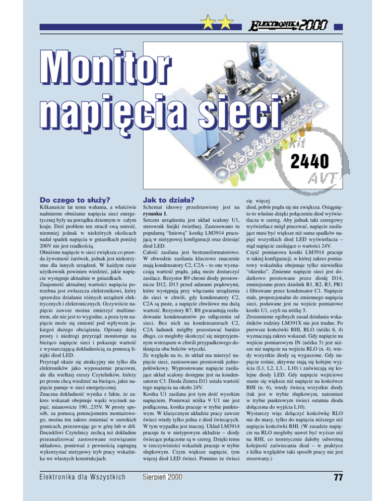 ★★ Monitor napięcia sieci 2440 Do czego to służy? Jak to działa? Kilkanaście lat temu wahania, a właściwie nadmierne obniżanie napięcia sieci energe− tycznej były na porządku dziennym w całym kraju. Dziś problem ten stracił swą ostrość, niemniej jednak w niektórych okolicach nadal spadek napięcia w gniazdkach poniżej 200V nie jest rzadkością. Obniżone napięcie w sieci zwiększa co praw− da żywotność żarówek, jednak jest niekorzy− stne dla innych urządzeń. W każdym razie użytkownik powinien wiedzieć, jakie napię− cie występuje aktualnie w gniazdkach. Znajomość aktualnej wartości napięcia po− trzebna jest zwłaszcza elektronikowi, który sprawdza działanie różnych urządzeń elek− trycznych i elektronicznych. Oczywiście na− pięcie zawsze można zmierzyć multime− trem, ale nie jest to wygodne, a poza tym na− pięcie może się zmienić pod wpływem ja− kiegoś dużego obciążenia. Opisany dalej prosty i niedrogi przyrząd monitoruje na bieżąco napięcie sieci i pokazuje wartość z wystarczającą dokładnością za pomocą li− nijki diod LED. Przyrząd okaże się atrakcyjny nie tylko dla elektroników jako wyposażenie pracowni, ale dla wielkiej rzeszy Czytelników, którzy po prostu chcą wiedzieć na bieżąco, jakie na− pięcie panuje w sieci energetycznej. Znaczna dokładność wynika z faktu, że za− kres wskazań obejmuje wąski wycinek na− pięć, mianowicie 190...235V. W prosty spo− sób, za pomocą potencjometru montażowe− go, można ten zakres zmieniać w szerokich granicach, przesuwając go w górę lub w dół. Dociekliwi Czytelnicy zechcą też dokładnie przeanalizować zastosowane rozwiązanie układowe, ponieważ z pewnością zapragną wykorzystać nietypowy tryb pracy wskaźni− ka we własnych konstrukcjach. Schemat ideowy przedstawiony jest na rysunku 1. Sercem urządzenia jest układ scalony U1, sterownik linijki świetlnej. Zastosowano tu popularną “liniową” kostkę LM3914 pracu− jącą w nietypowej konfiguracji oraz dziesięć diod LED. Całość zasilana jest beztransformatorowo. W obwodzie zasilania kluczowe znaczenie mają kondensatory C2, C2A – to one wyzna− czają wartość prądu, jaką może dostarczyć zasilacz. Rezystor R9 chroni diody prostow− nicze D12, D13 przed udarami prądowymi, które występują przy włączaniu urządzenia do sieci w chwili, gdy kondensatory C2, C2A są puste, a napięcie chwilowe ma dużą wartość. Rezystory R7, R8 gwarantują rozła− dowanie kondensatorów po odłączeniu od sieci. Bez nich na kondensatorach C2, C2A ładunek mógłby pozostawać bardzo długo, co mogłoby skończyć się nieprzyjem− nym wstrząsem w chwili przypadkowego do− tknięcia obu bolców wtyczki. Ze względu na to, że układ ma mierzyć na− pięcie sieci, zastosowano prostownik jedno− połówkowy. Wyprostowane napięcie zasila− jące układ scalony dostępne jest na konden− satorze C3. Dioda Zenera D11 ustala wartość tego napięcia na około 24V. Kostka U1 zasilana jest tym dość wysokim napięciem. Ponieważ nóżka 9 U1 nie jest podłączona, kostka pracuje w trybie punkto− wym. W klasycznym układzie pracy zawsze świeci wtedy tylko jedna z diod świecących. W tym wypadku jest inaczej. Układ LM3914 pracuje tu w nietypowym układzie – diody świecące połączone są w szereg. Dzięki temu w rzeczywistości wskaźnik pracuje w trybie słupkowym. Czym większe napięcie, tym więcej diod LED świeci. Pomimo że świeci Elektronika dla Wszystkich się więcej diod, pobór prądu się nie zwiększa. Osiągnię− to to właśnie dzięki połączeniu diod wyświe− tlacza w szereg. Aby jednak taki szeregowy wyświetlacz mógł pracować, napięcie zasila− jące musi być większe niż suma spadków na− pięć wszystkich diod LED wyświetlacza – stąd napięcie zasilające o wartości 24V. Część pomiarowa kostki LM3914 pracuje w takiej konfiguracji, w której zakres pomia− rowy wskaźnika obejmuje tylko niewielkie “okienko”. Zmienne napięcie sieci jest do− datkowo prostowane przez diodę D14, zmniejszane przez dzielnik R1, R2, R3, PR1 i filtrowane przez kondensator C1. Napięcie stałe, proporcjonalne do zmiennego napięcia sieci, podawane jest na wejście pomiarowe kostki U1, czyli na nóżkę 5. Zrozumienie ogólnych zasad działania wska− źników rodziny LM391X nie jest trudne. Po pierwsze końcówki RHI, RLO (nóżki 6, 4) wyznaczają zakres wskazań. Gdy napięcie na wejściu pomiarowym IN (nóżka 5) jest niż− sze niż napięcie na wejściu RLO (n. 4), wte− dy wszystkie diody są wygaszone. Gdy na− pięcie rośnie, aktywne stają się kolejne wyj− ścia (L1, L2, L3... L10) i zaświecają się ko− lejne diody LED. Gdy napięcie wejściowe stanie się większe niż napięcie na końcówce RHI (n. 6), wtedy świecą wszystkie diody (tak jest w trybie słupkowym, natomiast w trybie punktowym świeci ostatnia dioda dołączona do wyjścia L10). Wystarczy więc dołączyć końcówkę RLO nie do masy, tylko do napięcia niższego niż napięcie końcówki RHI. (W zasadzie napię− cie na RLO mogłoby nawet być wyższe niż na RHI, co teoretycznie dałoby odwrotną kolejność zaświecania diod – w praktyce z kilku względów taki sposób pracy nie jest stosowany.) 77 Rysunek 2 pomoże zrozumieć szczegóły, dzięki którym zakres pomiaru wskaźnika zo− stał rozciągnięty. Drugą ważną sprawą jest obecność “na po− kładzie” kostki dość precyzyjnego źródła napięcia odniesienia, o działaniu zbliżonym do działania popularnych stabilizatorów LM317. Mianowicie końcówka REFO (nóż− ka 7) jest wyjściem tego stabilizatora. We− wnętrzny układ stabilizatora stara się utrzy− mać napięcie równe 1,28V między końców− kami REFO i REFA (n. 7 i 8). Dołączając ze− wnętrzny dzielnik (dwa rezystory) można uzyskać dowolne napięcie, większe niż te 1,28V. Pokazuje