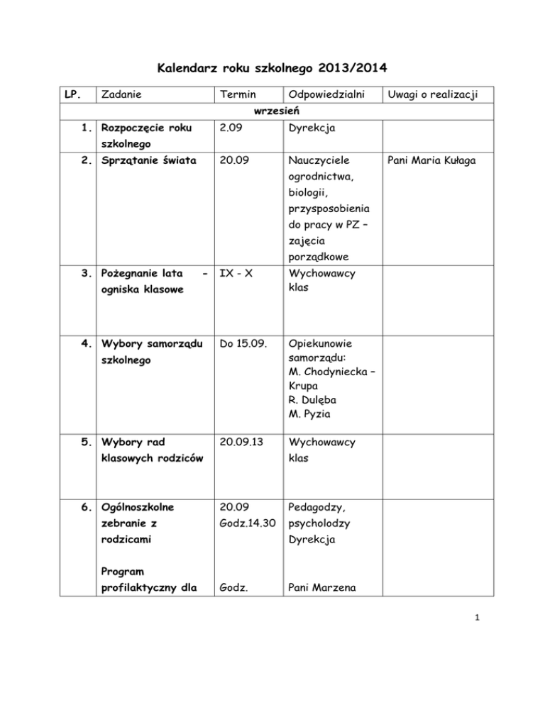 Kalendarz roku szkolnego 2013/2014 LP. Zadanie Termin Odpowiedzialni Uwagi o realizacji wrzesień 1. Rozpoczęcie roku 2.09 Dyrekcja 20.09 Nauczyciele szkolnego 2. Sprzątanie świata Pani Maria Kułaga ogrodnictwa, biologii, przysposobienia do pracy w PZ – zajęcia porządkowe 3. Pożegnanie lata - IX - X Wychowawcy klas Do 15.09. Opiekunowie samorządu: M. Chodyniecka – Krupa R. Dulęba M. Pyzia 20.09.13 Wychowawcy ogniska klasowe 4. Wybory samorządu szkolnego 5. Wybory rad klasowych rodziców 6. Ogólnoszkolne zebranie z klas 20.09 Pedagodzy, Godz.14.30 psycholodzy rodzicami Dyrekcja Program profilaktyczny dla Godz. Pani Marzena 1 rodziców klas 16.00 Suska 7. Wdrożenie konkursu na wzorowego ucznia i systemu wzmocnień pozytywnych 8. Dzień głośnego czytania 30.09 Samorząd szkolny Pedagodzy – po opracowaniu zmian w WSO K. Lesiecka J. Florek 9. Projekt „Ruch to zdrowie” – spotkanie z lekarzem Po P. Moskal uzgodnieniu z gościem gimnazjalnych – postępowanie z dziećmi w sytuacjach kryzysowych 29.09 Apel szkolny październik 10. Święto Edukacji 14.09 Narodowej Wychowawcy internatu M. Smelcerz M. Walaszek R. Dulęba B. Basta M. Jania S. Pasieka B. Bukowiec H. Bartnik 11. Projekt „Ruch to zdrowie – sportowy Ustalony M. Ciężadło na bieżąco okrągły stół 12. Projekt „Ruch to L. Staszek 2 zdrowie – Bieg P. Staszek Leliwitów P. Moskal 13. Projekt „Ruch to 12.10 A.Fudali – Rzepka zdrowie – II K. Niemiec Ogólnopolskie P. Moskal Zawody w Wspinaczce 14. Projekt „Ruch to D. Rucińska zdrowie – zawody pływackie 15. Projekt „Ruch to M. Smelcerz zdrowie – szkolne A. Mazur biegi przełajowe A. Sieniawska Zaklikiewicz 16. Wdrożenie projektu J. Małek „Radosna przyszłość E. Troszyńska – – zdrowy uśmiech” Pieprzycka w szkole A. Tyńska – podstawowej Klesiewicz M. Jania listopad 17. Święto Zmarłych 1.11.2013 Dzień ustawowo Piątek wolny 18. Dzień Misia U. Lonc Plebanek 19. Narodowe Święto Niepodległości 8.11 lub A.Szumlańska Forma dostosowana 12.11 A. Gzyl do możliwości M. Jeleń uczniów U.Lonc-Plebanek 20. Narodowe Święto Niepodległości 11.11.2013 Dzień ustawowo Poniedziałek wolny 3 21. Projekt „Ruch to S. Smelcerz zdrowie - Szkolny D. Rucińska turniej tenisa K. Siedlecka stołowego 22. Projekt „Ruch to zdrowie - A.Mazur Wychowawcy klas K. Siedlecka przygotowują Spotkanie ze dzieci do spotkania, sportowcem wyszukują materiały o karierze sportowej 23. Projekt „Ruch to zdrowie – mini kurs D. Rucińska Pogadanka i zajęcia E. Głąb praktyczne z pierwszej pomocy udziałem ratowników medycznych 24. Wycieczka do W. Wojtanowski Zwiedzanie PWSZ obiektów, w Tarnowie obserwacja treningu drużyny siatkarek 25. Zakończenie Apel szkolny Opiekunowie projektu „WF z samorządu klasą” szkolnego P. Moskal 26. Wdrożenie projektu E. Troszyńska - literackiego Pieprzycka „Poetycka podróż z M. Jania lokomotywą” w B. Basta klasach dla J. Małek autystyków 27. Święto Patrona Konkurs szkolny – twórczość 4 Juliana Tuwima dla dzieci G. Wróblewska D. Łukasik M. Gomułka 28. Festiwal „Śpiewaj z 17 -19.11.13 Bartnik H. Nami” Szumlańska A. Prusak M. 29. Andrzejki 27.11 Nauczyciele w – f: M. Trześniowska E. Głąb A. Bąk 30. Święto zdrowego G. Broda gotowania M. Łukasińska J. Damian grudzień 31. Mikołajki 6.12 Wychowawcy klas w miarę możliwości : M. Trześniowska E. Głąb B. Bukowiec – dzieci młodsze 32. Wigilie klasowe 18-20.12 Wychowawcy klas i grup 5 przedszkolnych 33. Opłatek 22.12.13 34. Zimowa przerwa 23.12 - świąteczna 35. Dni wolne od zajęć Katecheci 31.12 2.01.-3.01 dydaktycznych 36. Święto Trzech Króli 6.01.2014 styczeń 37. Szkolne kolędowanie Nauczyciele muzyki 38. Zabawa karnawałowa A.Tyńska M. Tatar M. Skwirut A. Bąk M. Łukasińska J. Damian 39. Projekt „Ruch to A.Zaklikiewicz zdrowie” – szkolny D. Rucińska turniej badmintona A. Mazur P. Moskal 40. Projekt „Ruch to zdrowie” – serduszkowce zawody pływackie WOŚP 41. Projekt „Ruch to zdrowie” – polscy Wychowawcy Opracowanie nauczyciele w-f informacji na mistrzowie temat ich kariery paraolimpijscy: sportowej i N. Partyka sukcesów M. Michalski życiowych, 6 K. Piekart korespondencja ze K. kucharczyk sportowcami. G. Pluta Korespondencja ze sportowcami 42. Projekt „Ruch to D. Rucińska Siemiechów zdrowie” -Wyjazdy M. Ciężało Lubinka narciarskie A .Mazur 43. Projekt „Ruch to Nauczyciele Wspólne oglądanie zdrowie” - świetlicy występów polskich Igrzyska olimpijskie szkolnej reprezentantów, w Soczi Wychowawcy kibicowanie w klas sportowej Nauczyciele atmosferze. informatyki Wyszukiwanie informacji w prasie i Internecie 44. Próbny sprawdzian i K. Chłopek egzamin gimnazjalny A. Gzyl luty 45. Walentynki 18.02 Samorząd szkolny B. Wajs D. Łukasik A. Bąk – klasy dla autystyków 46. Konkurs piosenek o miłości 47. Dzień języka ojczystego U. LoncPlebanek Nauczyciele języka polskiego Logopedzi 7 48. Ferie zimowe 3-16.02.13 marzec 49. Projekt „Ruch to K. Siedlecka Przeprowadzenie zdrowie” - Konkurs A. Mazur konkursu i plastyczny „Zimowe M. Trześniowska organizacja Igrzyska S. Pasieka wystawy w holu Olimpijskie” 50. Projekt „Ruch to szkolnym 21.03 Konkurs małych zdrowie” - form tanecznych powitanie wiosny 51. Projekt „Ruch to zdrowie” – nornic Prezentacja M. Ciężadło multimedialna M. Siedlecka wolking Nauka techniki i wyjście w plener w ramach lekcji w-f. kwiecień 52. Sprawdzian w kl.6 1.04 53. Rekolekcje 14- 16.04 PSZE, PSZN wielkopostne 54. Wiosenna przerwa 17 – 22.04 świąteczna M. Smelcerz R. Dulęba B. Basta M. Jania B. Bukowiec A. Miotła 55. Egzamin gimnazjalny 23.04 PSZE, PSZN 56. Egzamin gimnazjalny 24.04 PSZE, PSZN 57. Egzamin gimnazjalny 25.04 PSZE, PSZN 58. Dzień Ziemi Konkurs 26.04 8 ekologiczny K. Kłosowicz S. Pasieka P. Moskal U. Mędzelowska 59. Festiwal gier i zabaw sportowych 60. Dzień Papieski S. Smalcerz Zawody na M. Ciężadło wszy