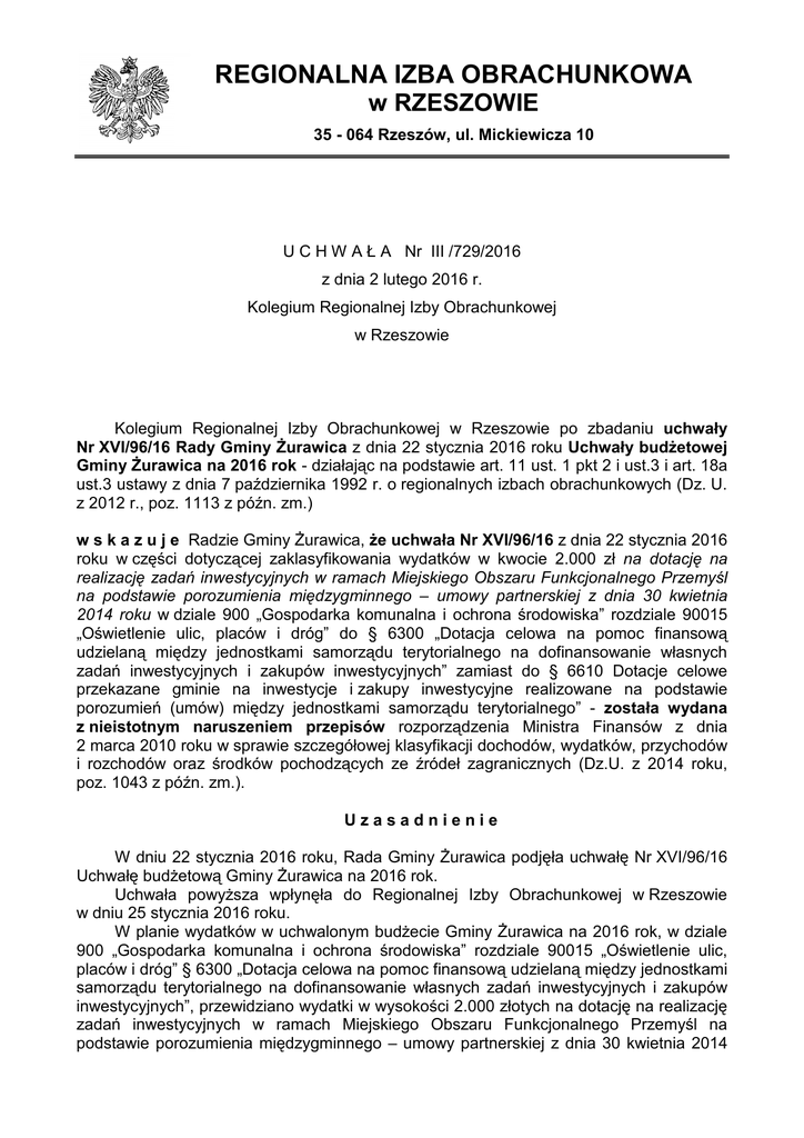 Uchwała nr III/0729/2016 - Regionalna Izba Obrachunkowa w