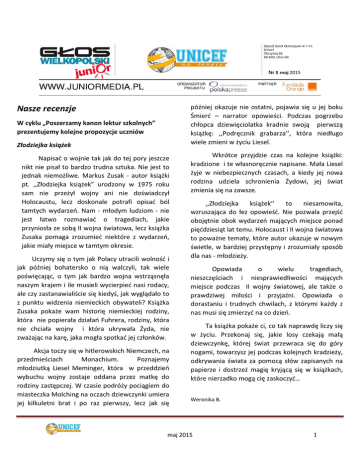 Nr 5 maj 2015 później okazuje nie ostatni, pojawia się u jej boku Śmierć – narrator opowieści. Podczas pogrzebu chłopca dziewięciolatka kradnie swoją pierwszą książkę: ,,Podręcznik grabarza’’, która niedługo wiele zmieni w życiu Liesel. Nasze recenzje W cyklu „Poszerzamy kanon lektur szkolnych” prezentujemy kolejne propozycje uczniów Złodziejka książek Napisać o wojnie tak jak do tej pory jeszcze nikt nie pisał to bardzo trudna sztuka. Nie jest to jednak niemożliwe. Markus Zusak - autor książki pt. ,,Złodziejka książek” urodzony w 1975 roku sam nie przeżył wojny ani nie doświadczył Holocaustu, lecz doskonale potrafi opisać ból tamtych wydarzeń. Nam - młodym ludziom - nie jest łatwo rozmawiać o tragediach, jakie przyniosła ze sobą II wojna światowa, lecz książka Zusaka pomaga zrozumieć niektóre z wydarzeń, jakie miały miejsce w tamtym okresie. Uczymy się o tym jak Polacy utracili wolność i jak później bohatersko o nią walczyli, tak wiele poświęcając, o tym jak bardzo wojna wstrząsnęła naszym krajem i ile musieli wycierpieć nasi rodacy, ale czy zastanawialiście się kiedyś, jak wyglądało to z punktu widzenia niemieckich obywateli? Książka Zusaka pokaże wam historię niemieckiej rodziny, która nie popierała działań Fuhrera, rodziny, która nie chciała wojny i która ukrywała Żyda, nie zważając na karę, jaka mogła spotkać jej członków. Akcja toczy się w hitlerowskich Niemczech, na przedmieściach Monachium. Poznajemy młodziutką Liesel Meminger, która w przeddzień wybuchu wojny zostaje oddana przez matkę do rodziny zastępczej. W czasie podróży pociągiem do miasteczka Molching na oczach dziewczynki umiera jej kilkuletni brat i po raz pierwszy, lecz jak się Wkrótce przyjdzie czas na kolejne książki: kradzione i te własnoręcznie napisane. Mała Liesel żyje w niebezpiecznych czasach, a kiedy jej nowa rodzina udziela schronienia Żydowi, jej świat zmienia się na zawsze. ,,Złodziejka książek’’ to niesamowita, wzruszająca do łez opowieść. Nie pozwala przejść obojętnie obok wydarzeń mających miejsce ponad pięćdziesiąt lat temu. Holocaust i II wojna światowa to poważne tematy, które autor ukazuje w nowym świetle, w bardziej przystępny i zrozumiały sposób dla nas - młodzieży. Opowiada o wielu tragediach, nieszczęściach i niesprawiedliwości mających miejsce podczas II wojny światowej, ale także o prawdziwej miłości i przyjaźni. Opowiada o dorastaniu i trudnych chwilach, z którymi każdy z nas musi się zmierzyć na co dzień. Ta książka pokaże ci, co tak naprawdę liczy się w życiu. Przekonaj się, jakie losy czekają małą dziewczynkę, której świat przewraca się do góry nogami, towarzysz jej podczas kolejnych kradzieży, odkrywania świata za pomocą słów zapisanych na papierze i dostrzeż magię kryjącą się w książkach, które nierzadko mogą cię zaskoczyć… Weronika B. maj 2015 1 Nr 5 maj 2015 Polak pesymista My, dzieci z dworca zoo „My, dzieci z dworca zoo” to książka dokumentalna autorstwa Kai Hermann i Horsta Ricka opowiadająca o narastającej fali narkomanii wśród młodzieży w Berlinie zachodnim w latach siedemdziesiątych. Książka opowiada o nastolatce, która przeprowadza się do Berlina. Christiane jest córką rozwodników, nie ma znajomych, czuje się zagubiona i nieakceptowana w nowym otoczeniu. W wieku trzynastu lat zaczyna palić haszysz. Trafia w środowisko narkomanów, grupy młodzieży równie zagubionej i samotnej jak ona. Bohaterka zabiera nas w dwuletnią podróż po świecie twardych narkotyków, kradzieży i prostytucji. Moim zdaniem nic nie wpłynie na charakter młodego czytelnika tak bardzo jak ta książka. Pozostawia nas sam na sam z osobą Christiane, jej wspomnieniami i opisami szokujących wydarzeń z jej życia. Opowieść jest szczera i przedstawia prawdziwe życie bez moralizatorskiego tonu. Porusza i pozwala na wyciągnięcie wniosków. Według mnie powinna zostać lekturą szkolną, ponieważ daje o wiele więcej do myślenia niż najlepiej przeprowadzona lekcja wychowawcza. W okresie buntu sięgamy po alkohol, papierosy, a czasem nawet po narkotyki, lecz warto zastanowić się nad swoimi wyborami oraz ich konsekwencjami. GossipGirl Zapytaj Amerykanina: „How are you?”. To pewne, że nawet jeżeli przeżywa najtrudniejsze chwile swojego życia, odpowie, że ma się świetnie. Tak został wychowany. Zadaj to samo pytanie Polakowi. To niemal pewne, że nawet jeżeli właśnie wygrał na loterii, znajdzie powód, by ponarzekać. Tak został wychowany… Niedawno w telewizji oglądałam serwis informacyjny. Moją uwagę przykuł sondaż przeprowadzony w pięćdziesięciu czterech krajach. Wynika z niego, że Polak to pesymista. Tylko kilka narodów wyprzedza nas w czarnowidztwie. Badania wydają się wiarygodne, dlatego postanowiłam zastanowić się, dlaczego my - Polacy – mamy skłonność do wyolbrzymiania ujemnych stron życia. Może optymizm jest niezgodny z naszą naturą? Generalnie, my Polacy postrzegani jesteśmy jako naród bardzo ponury - co mnie szczerze martwi. Trudno jednak z tą opinią polemizować. Na stałe przecież do naszego słownika weszło powiedzenie „Co się cieszysz jak głupi do sera”. Sugeruje ono, że kto się śmieje, jest po prostu głupi, a my przecież chcemy być poważni. Najchętniej przyjmujemy posępny, odstraszający wyraz twarzy. Narzekanie tak nam weszło w krew, że czasami prześcigamy się w dyskusji, kto ma gorzej, kto ma większe wydatki, kto ma więcej chorób, kto po prostu jest bardziej maj 2015 2 Nr 5 maj 2015 nieszczęśliwy. Pozytywne opinie na jakiś temat uważamy za przejaw naiwności, a wręcz niewiedzy. Hurraoptymizm nas drażni. Przyszłość zazwyczaj widzimy w czarnych barwach . Zadaję więc pytanie: jak przezwyciężyć nasz narodowy pesymizm? Czy w Polsce naprawdę nie wypada być optymistą? Polaka. Życzę Wam i sobi