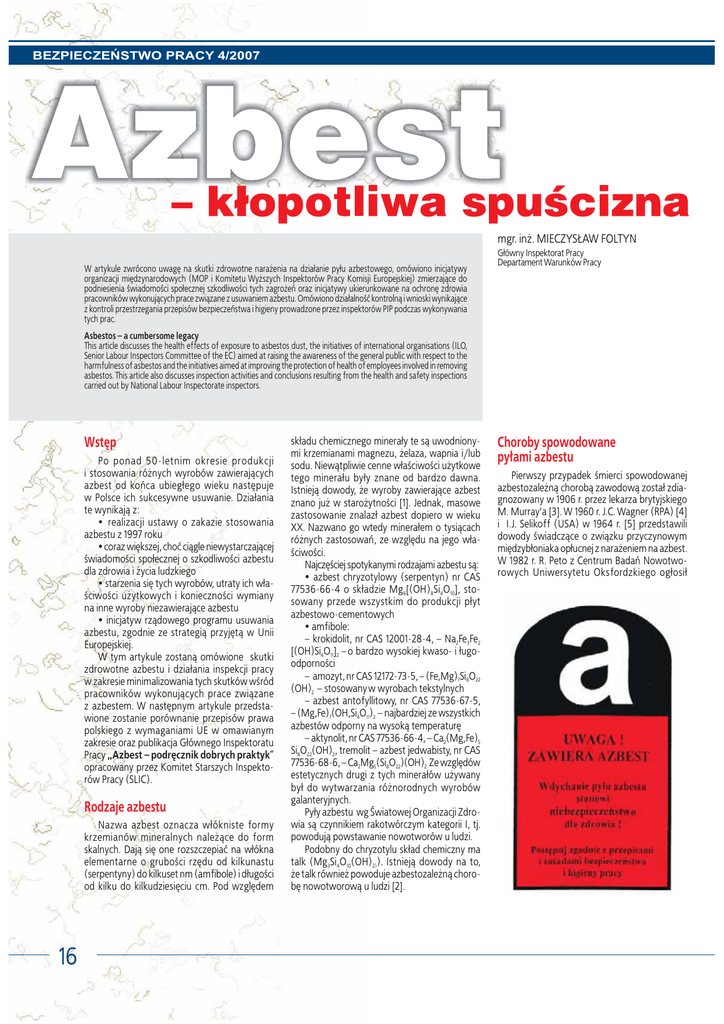 BEZPIECZEŃSTWO PRACY 4/2007 mgr. in¿. MIECZYS£AW FOLTYN W artykule zwrócono uwagê na skutki zdrowotne nara¿enia na dzia³anie py³u azbestowego, omówiono inicjatywy organizacji miêdzynarodowych (MOP i Komitetu Wy¿szych Inspektorów Pracy Komisji Europejskiej) zmierzaj¹ce do podniesienia świadomości spo³ecznej szkodliwości tych zagro¿eñ oraz inicjatywy ukierunkowane na ochronê zdrowia Wpracowników wykonuj¹cych prace zwi¹zane z usuwaniem azbestu. Omówiono dzia³alnośæ kontroln¹ i wnioski wynikaj¹ce z kontroli przestrzegania przepisów bezpieczeñstwa i higieny prowadzone przez inspektorów PIP podczas wykonywania tych prac. G³ówny Inspektorat Pracy Departament Warunków Pracy Asbestos – a cumbersome legacy This article discusses the health effects of exposure to asbestos dust, the initiatives of international organisations (ILO, Senior Labour Inspectors Committee of the EC) aimed at raising the awareness of the general public with respect to the harmfulness of asbestos and the initiatives aimed at improving the protection of health of employees involved in removing asbestos. This article also discusses inspection activities and conclusions resulting from the health and safety inspections carried out by National Labour Inspectorate inspectors. Wstêp Po ponad 50-letnim okresie produkcji i stosowania ró¿nych wyrobów zawieraj¹cych azbest od koñca ubieg³ego wieku nastêpuje w Polsce ich sukcesywne usuwanie. Dzia³ania te wynikaj¹ z: realizacji ustawy o zakazie stosowania azbestu z 1997 roku coraz wiêkszej, choæ ci¹gle niewystarczaj¹cej świadomości spo³ecznej o szkodliwości azbestu dla zdrowia i ¿ycia ludzkiego starzenia siê tych wyrobów, utraty ich w³aściwości u¿ytkowych i konieczności wymiany na inne wyroby niezawieraj¹ce azbestu inicjatyw rz¹dowego programu usuwania azbestu, zgodnie ze strategi¹ przyjêt¹ w Unii Europejskiej. W tym artykule zostan¹ omówione skutki zdrowotne azbestu i dzia³ania inspekcji pracy w zakresie minimalizowania tych skutków wśród pracowników wykonuj¹cych prace zwi¹zane z azbestem. W nastêpnym artykule przedstawione zostanie porównanie przepisów prawa polskiego z wymaganiami UE w omawianym zakresie oraz publikacja G³ównego Inspektoratu Pracy „Azbest – podrêcznik dobrych praktyk” opracowany przez Komitet Starszych Inspektorów Pracy (SLIC). Rodzaje azbestu Nazwa azbest oznacza w³ókniste formy krzemianów mineralnych nale¿¹ce do form skalnych. Daj¹ siê one rozszczepiaæ na w³ókna elementarne o grubości rzêdu od kilkunastu (serpentyny) do kilkuset nm (amfibole) i d³ugości od kilku do kilkudziesiêciu cm. Pod wzglêdem 16 sk³adu chemicznego minera³y te s¹ uwodnionymi krzemianami magnezu, ¿elaza, wapnia i/lub sodu. Niew¹tpliwie cenne w³aściwości u¿ytkowe tego minera³u by³y znane od bardzo dawna. Istniej¹ dowody, ¿e wyroby zawieraj¹ce azbest znano ju¿ w staro¿ytności [1]. Jednak, masowe zastosowanie znalaz³ azbest dopiero w wieku XX. Nazwano go wtedy minera³em o tysi¹cach ró¿nych zastosowañ, ze wzglêdu na jego w³aściwości. Najczêściej spotykanymi rodzajami azbestu s¹: azbest chryzotylowy (serpentyn) nr CAS 77536-66-4 o sk³adzie Mg6[(OH)8Si4O10], stosowany przede wszystkim do produkcji p³yt azbestowo-cementowych amfibole: – krokidolit, nr CAS 12001-28-4, – Na2Fe3Fe2 [(OH)Si4O11]2 – o bardzo wysokiej kwaso- i ³ugoodporności – amozyt, nr CAS 12172-73-5, – (Fe,Mg)7Si8O22 (OH)2 – stosowany w wyrobach tekstylnych – azbest antofyllitowy, nr CAS 77536-67-5, – (Mg,Fe)7(OH,Si4O11)2 – najbardziej ze wszystkich azbestów odporny na wysok¹ temperaturê – aktynolit, nr CAS 77536-66-4, – Ca2(Mg,Fe)5 Si8O22(OH)2, tremolit – azbest jedwabisty, nr CAS 77536-68-6, – Ca2Mg5(Si8O22)(OH)2. Ze wzglêdów estetycznych drugi z tych minera³ów u¿ywany by³ do wytwarzania ró¿norodnych wyrobów galanteryjnych. Py³y azbestu wg Światowej Organizacji Zdrowia s¹ czynnikiem rakotwórczym kategorii I, tj. powoduj¹ powstawanie nowotworów u ludzi. Podobny do chryzotylu sk³ad chemiczny ma talk (Mg3Si4O10(OH)2)). Istniej¹ dowody na to, ¿e talk równie¿ powoduje azbestozale¿n¹ chorobê nowotworow¹ u ludzi [2]. Choroby spowodowane py³ami azbestu Pierwszy przypadek śmierci spowodowanej azbestozale¿n¹ chorob¹ zawodow¹ zosta³ zdiagnozowany w 1906 r. przez lekarza brytyjskiego M. Murray’a [3]. W 1960 r. J.C. Wagner (RPA) [4] i I.J. Selikoff (USA) w 1964 r. [5] przedstawili dowody świadcz¹ce o zwi¹zku przyczynowym miêdzyb³oniaka op³ucnej z nara¿eniem na azbest. W 1982 r. R. Peto z Centrum Badañ Nowotworowych Uniwersytetu Oksfordzkiego og³osi³ BEZPIECZEŃSTWO PRACY 4/2007 prognozê 50 000 zgonów spowodowanych chorobami nowotworowymi w Wielkiej Brytanii w nadchodz¹cym 30-leciu. Wed³ug Miêdzynarodowej Organizacji Pracy azbest, z uwagi na w³aściwości rakotwórcze, nale¿y obecnie do najgroźniejszych przyczyn chorób zawodowych na świecie. Wdychanie niewidocznych dla oka py³ów azbestowych mo¿e powodowaæ takie choroby, jak [6]: pylica azbestowa (azbestoza), schorzenie polegaj¹ce na powolnym zw³óknieniu tkanki p³ucnej prowadz¹cym do niewydolności oddechowej gwa³townie rozwijaj¹cy siê rak p³uca, który mo¿e byæ nastêpstwem pylicy azbestowej, wystêpuj¹cy zwykle po 10 – 35 latach, licz¹c od pocz¹tku nara¿enia; rozwój nowotworu przyspiesza d³ugotrwa³a azbestoza i nikotynizm (7 – 12 razy) miêdzyb³oniak op³ucnej; bardzo z³ośliwy nowotwór specyficzny dla azbestu, spowodowany odk³adaniem siê w p³ucach mikroskopijnych respirabilnych w³ókien azbestu, które z czasem przenoszone s¹ na op³ucn¹ okalaj¹c¹ dolne czêści p³uc, powoduj¹ powstanie tam guzów ognisk nowotworowych. W nastêpstwie wyst¹pienia guzów w op³ucnej gromadzi siê p³yn surowiczy powoduj¹cy zmniejszenie objêtości roboczej p³uc. Nowotwór rozwija siê po 10-40 i wiêcej latach, licz¹c od pocz¹tku nara¿enia. Azbest mo¿e by