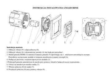 INSTRUKCJA INSTALOWANIA GNIAZD HDMI Instrukcja montażu 1. Odkręcić wkręta (9) i zdjąć pokrywę (8). 2. Odkręcić wkręty (6) i zdemontować pazurki (4) /nie będą już potrzebne/. 3. Moduł gniazda HDMI (3) umieścić korpusie gniazda (5) upewniając się o należytym zatrzaśnięciu zaczepu. Prawidłowe usytuowanie modułu w korpusie przedstawia rysunek (szczegół A). 4. Podłączyć przewód z wtykiem kątowym do modułu (3). 5.Podzespół gniazda zainstalować do puszki przy pomocy wkrętów będących na jej wyposażeniu. 6. Ułożyć na metalowym mostku ramkę (7). 7. Włożyć pokrywę (8) do ramki (7). 8. Przykręcić pokrywę (8) przy pomocy wkręta (9). Uwaga: Aby możliwa była instalacja gniazda do puszki podtynkowej ø60 powinna ona mieć co najmniej 60mm głębokości oraz posiadać wkręty montażowe. Z uwagi na ograniczoną ilość miejsca w puszce (rys. 3): - istnieje konieczność stosowania dedykowanego przewodu z wtykiem kątowym o wymiarach nie większych niż na rys. 1, z odpowiednio ukierunkowaną końcówką (rys. 2). - gniazdo HDMI można zbudować tylko jako pojedyncze Rys. 1 Maksymalne wymiary wtyku kątowego Rys. 2 Budowa końcówki wtyku Rys. 3 Ilość miejsca w puszce