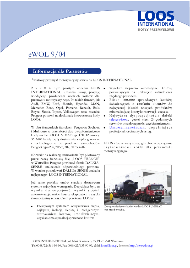 eWOL 9/04 Informacja dla Partnerów Œwiatowy przemys³ motoryzacyjny stawia na LOOS INTERNATIONAL 2 x 2 = 4. Tym prostym wzorem LOOS INTERNATIONAL umacnia swoj¹ pozycjê wiod¹cego producenta wielkich kot³ów dla przemys³u motoryzacyjnego. Po takich firmach, jak Audi, BMW, Ford, Honda, Hyundai, MAN, Mercedes Benz, Opel, Porsche, Renault, Rolls Royce, Skoda, Toyota, Volkswagen teraz równie¿ Peugeot postawi³ na doskona³e i nowoczesne kot³y LOOS. ! W obu francuskich fabrykach Peugeota: Sochaux i Mulhouse w przysz³oœci dwa dwup³omienicowe kot³y wodne LOOS UNIMAT typu UT-HZ o mocy 36 MW ka¿dy bêd¹ dostarcza³y ciep³o grzewcze i technologiczne do produkcji samochodów Peugeot typu 206, 206cc, 307, 307cc i 607. ! ! ! Wysokim stopniem automatyzacji kot³ów, pozwalaj¹cym na unikniêcie zatrudnienia zbêdnego personelu. Blisko 100.000 sprzedanych kot³ów, œwiadcz¹cych o zaufaniu klientów do najwy¿szej jakoœci naszych produktów, minimalizuj¹cej koszty konserwacji i zu¿ycia. Najwy¿sz¹ dyspozycyjnoœci¹ dziêki teleserwisowi, gêstej sieci 24-godzinnych serwisów, oraz dostêpnoœci czêœci zamiennych. Umow¹ serwisow¹, dope³niaj¹c¹ profesjonalnoœci naszych us³ug. LOOS - to pierwszy adres, gdy chodzi o przyjazne u¿ytkownikowi kot³y dla przemys³u motoryzacyjnego. Kontrakt na realizacjê zamówienia by³ pilotowany przez nasz¹ francusk¹ filiê „LOOS FRANCE” w Wattwiller. Peugeot powierzy³ firmie DALKIASENSE znalezienie odpowiedniego partnera. W wyniku poszukiwañ DALKIA-SENSE znalaz³a najlepszego - LOOS INTERNATIONAL. Ju¿ same projekty umów stawia³y dostawcom systemu najwy¿sze wymagania. Decyduj¹ce by³y tu wysoka dyspozycyjnoœæ, wysoki stopieñ automatyzacji, niskie koszty eksploatacji i szybki i kompetentny serwis. Czym przekona³ LOOS? ! Efektywnym systemem odzyskiwania ciep³a, najlepsz¹ izolacj¹ ciepln¹ i inteligentnym sterowaniem kot³ów, umo¿liwiaj¹cymi uzyskanie maksymalnej sprawnoœci kot³ów. Dwup³omienicowy kocio³ wodny LOOS UNIMAT tu¿ przed wysy³k¹. LOOS INTERNATIONAL, ul. Marii Kazimiery 35, PL-01-641 Warszawa Tel 0048/22/561-90-90, Fax 0048/22/635-90-99, eMail [email protected], Internet http://www.loos.pl