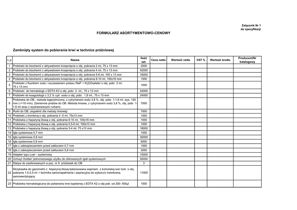 Załącznik Nr 1 do specyfikacji FORMULARZ ASORTYMENTOWO-CENOWY Zamknięty system do pobierania krwi w technice próżniowej 1 Probówki do biochemii z aktywatorem krzepnięcia o obj. pobrania 2 ml, 75 x 13 mm Ilość szt. 2000 2 Probówki do biochemii z aktywatorem krzepnięcia o obj. pobrania 4 ml, 75 x 13 mm 42000 3 Probówki do biochemii z aktywatorem krzepnięcia o obj. pobrania 5-6 ml, 100 x 13 mm 16000 4 Probówki do biochemii z aktywatorem krzepnięcia o obj. pobrania 8-10 ml, 100x16 mm Probówki z fluorkiem sodu i szczawianem potasu /NaF + K(2)Oxalate/ o obj. pobr. 2 ml, 5 75 x 13 mm 6 Probówki do hematologii z EDTA K3 o obj. pobr. 2 ml., 75 x 13 mm 1500 42000 7 Probówki do koagulologii z 3,2 % cytr. sodu o obj. pobr. 1,8 ml., 75 x 13 mm 24000 Probówka do OB., metoda logarytmiczna, z cytrynianem sodu 3,8 %, obj. pobr. 1-1,6 ml, wys. 120 8 mm (-/+10 mm). Zamiennie probów do OB. Metoda liniowa, z cytrynianem sodu 3,8 %, obj. pobr. 11,6 ml wraz z wyskalowanymi rurkami. 7000 L.p Nazwa 1000 9 Rurki do OB. (wypełnić dla metody liniowej) 7000 10 Probówki z trombiną o obj. pobrania 4 -5 ml, 75x13 mm 1000 11 Probówka z heparyną litową o obj. pobrania 8-10 ml, 100x16 mm 12 Probówka z heparyną litową o obj. pobrania 5,5-6 ml, 100x13 mm 13 Probówka z heparyną litową o obj. pobrania 3-4 ml, 75 x13 mm 1000 1000 18000 14 Igła systemowa 0,7 mm 1000 15 Igła systemowa 0,8 mm 30000 16 Igła systemowa 0,9 mm 6000 17 Igła z zabezpieczeniem przed zakłuciem 0,7 mm 1000 18 Igła z zabezpieczeniem przed zakłuciem 0,8 mm 2000 19 Adapter typu Luer - systemowy 15000 20 Uchwyt /holder/ jednorazowego użytku do oferowanych igieł systemowych. 55000 21 Statyw do zaoferowanych w poz. nr 8 probówek do OB 3 Strzykawka do gazometrii z heparyną litową balansowana wapniem z końcówką luer lock o obj. 22 pobrania 1,5-2,5 ml -/ technika samonapełniania i aspiracyjna do wyboru/z membraną samowentylującą. 11000 23 Probówka hematologiczna do pobierania krwi kapilarnej z EDTA K2 o obj pob. od 200- 500µl 1500 Cena netto Wartość netto VAT % Wartość brutto Producent/Nr katalogowy 24 Probówka do analizy glukozy z fluorkiem sodu o obj. pobr. 200-250µl 200 25 Probówka biochemiczna z żelem do pobierania krwi kapilarnej obj. pobr. do 600 µl 200 26 Probówka do bilirubiny z żelem separującym obj. pobr. Do 600 µl 2000 27 Nakłuwacze bezpieczne 2,0 mm ostrze 200 28 Nakłuwacze bezpieczne 1,5-1,8 mm igła 200 29 Igła przezierna 0,8 mm 1000 XXX Wymagane cechy: 1. Zamawiający wymaga, aby wszystkie wyroby systemu próżniowego (probówki, igły, uchwyty i adaptery typu Luer) pochodziły od jednego producenta (możliwe ustalenie odpowiedzialności). W szczególnych przypadkach Zamawiający dopuszcza zaoferowanie produktów od różnych producentów wówczas konieczne jest dołączenie oświadczenia o kompatybilności produktów wystawione przez producentów. 2. Oferent dostarczy próbki z całego asortymentu zgodnie z załącznikem nr 2 (próbki winny odpowiadac wszystkim wymogom zawartym w SIWZ) oraz posiadać termin wazności 3. Probówki posiadają jałowe wnętrze. 4. Okres ważności probówek w dniu dostawy – min. 6 miesięcy 5. Czas wykrzepiania (surowica) max. 30 min. - Zamawiający wymaga dołączenia dokumentu producenta. 6. Możliwość współpracy z systemem Luer – wenflony, cewniki naczyniowe. 7. Probówki wykonane z przejrzystego PET o znacznej odporności mechanicznej. Dla probówek do OB Zamawiający dopuszcza również szkło. 8. Fabrycznie kalibrowana próżnia w probówkach, zapewniająca pobranie wystandaryzowanej objętości materiału do badań i optymalne rozcieńczenie zawartych dodatków. 9. Strzykawki do gazometrii jałowe pakowane pojedyńczo 10.Probówki wykonane z PET o znacznej odporności mechanicznej. Dla probówek OB. dopuzczone szkło 11. Znaczniki pobierania na każdej probówce.